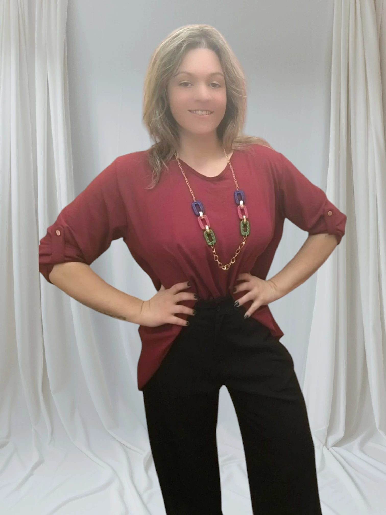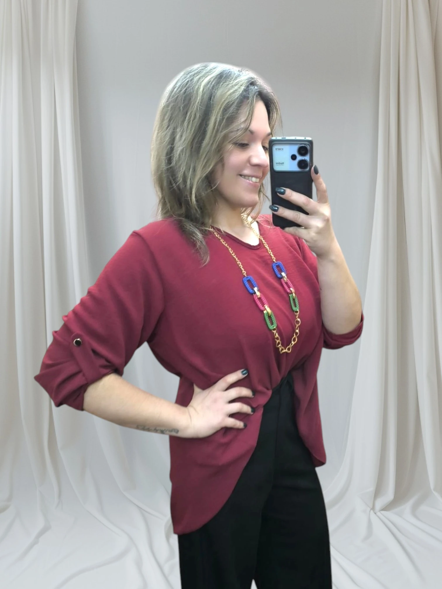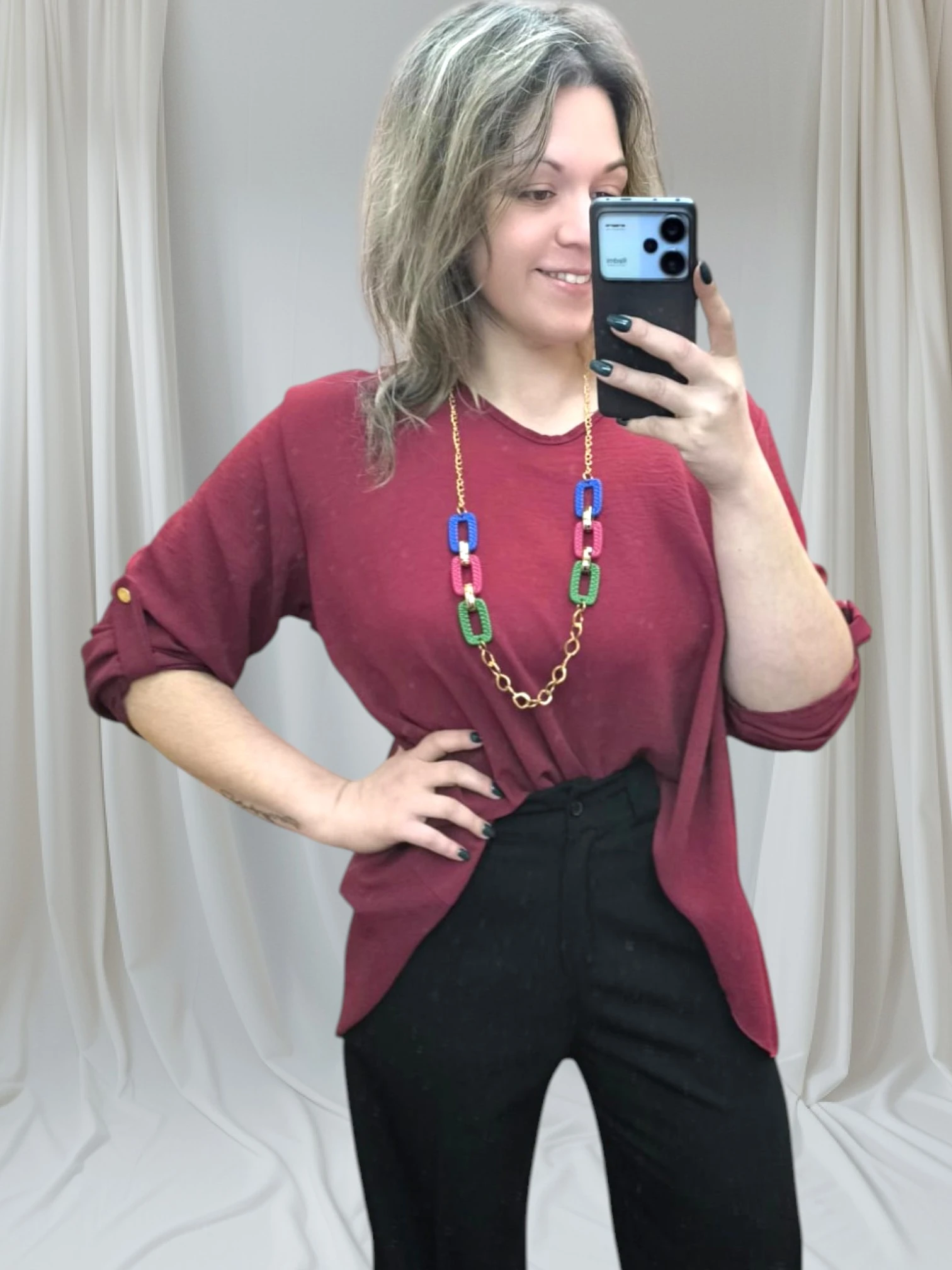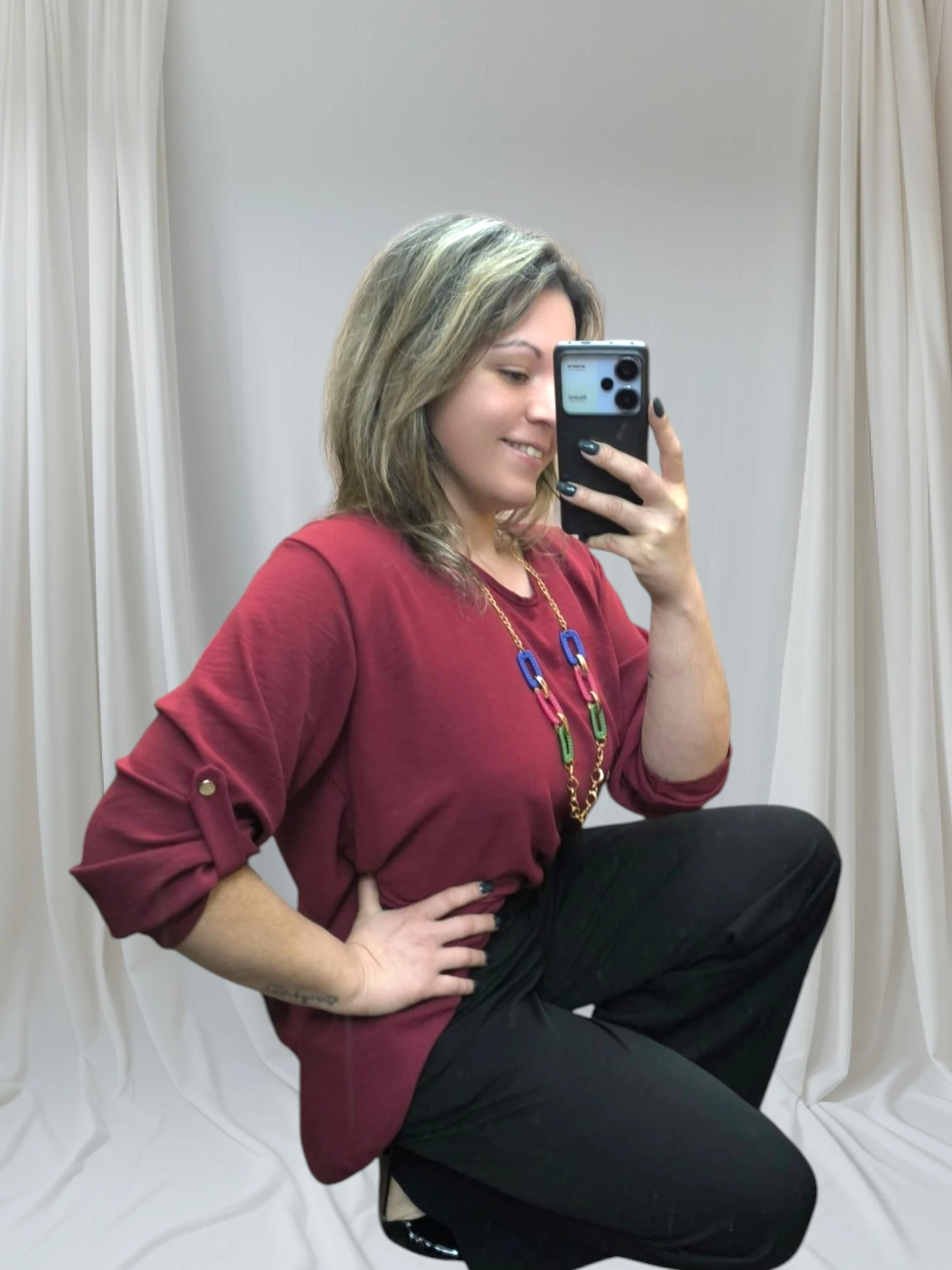 Quando se trata de versatilidade, essa blusa contemporânea com estilo refinado se destaca. Na elegante cor bordeaux, ela combina facilmente com diferentes estilos e ocasiões. Para um visual mais formal, use-a com calças de alfaiataria e salto. Por outro lado, se deseja algo mais casual, combine com jeans e sapatilhas para um look descomplicado e estiloso.