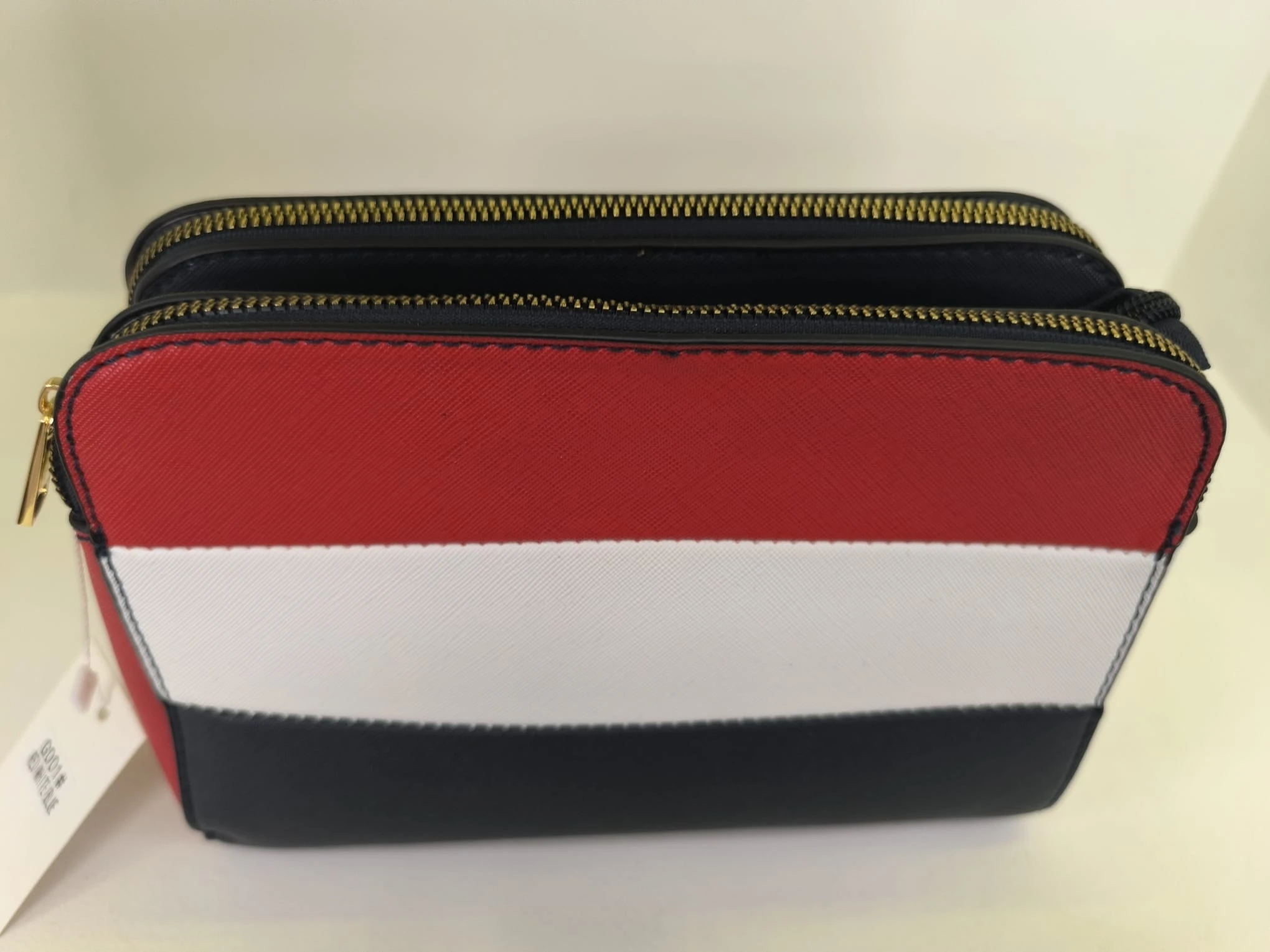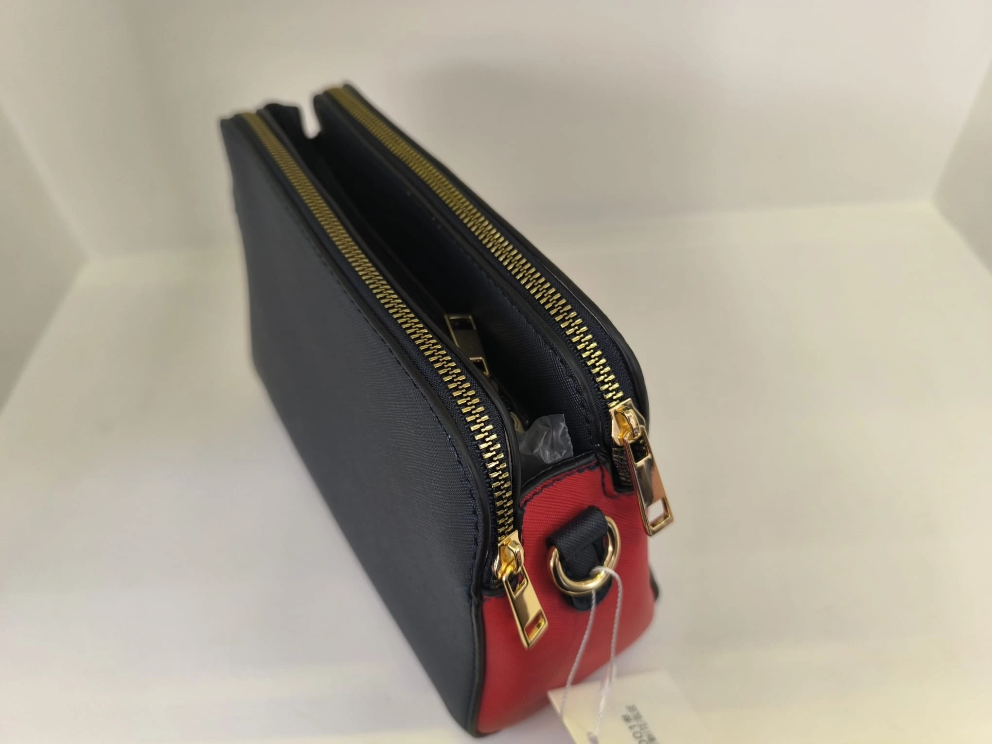 Bolsa com 3 compartimentos contém alça de tira colo.