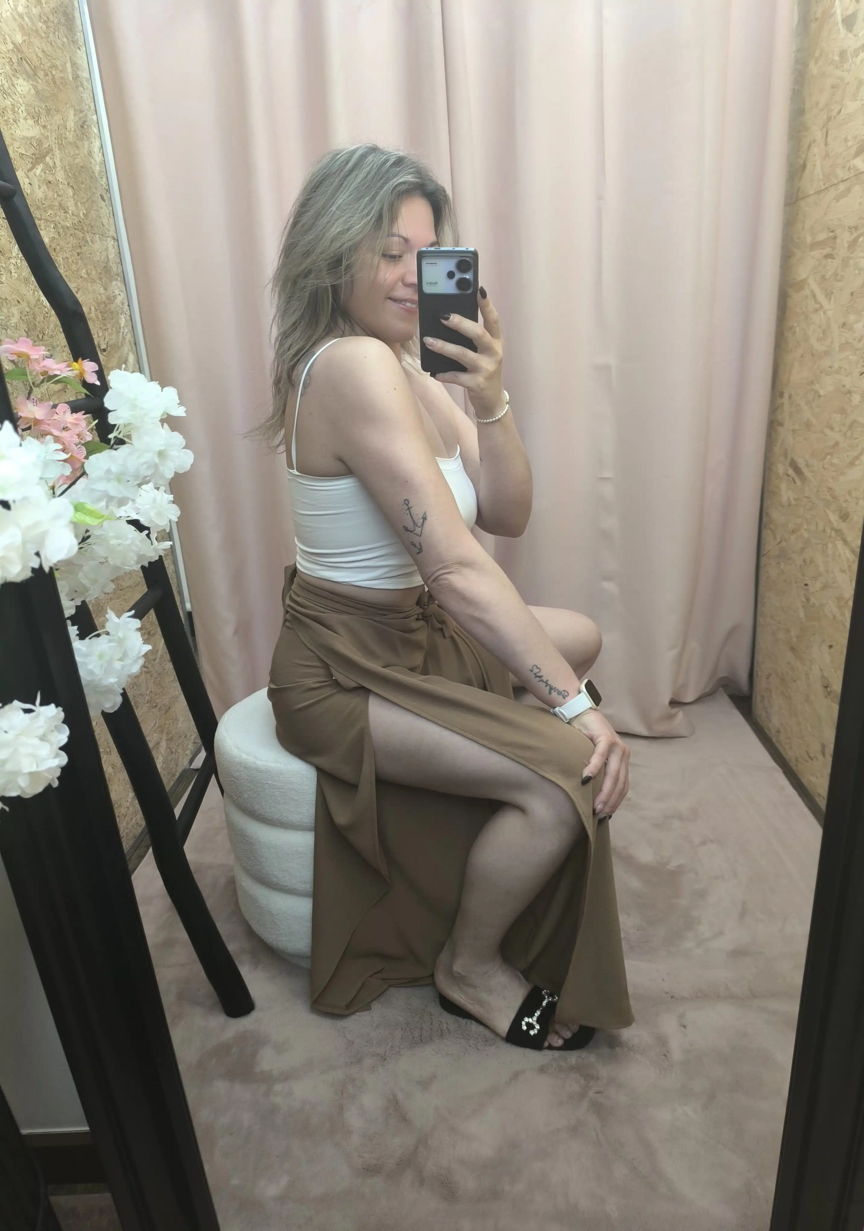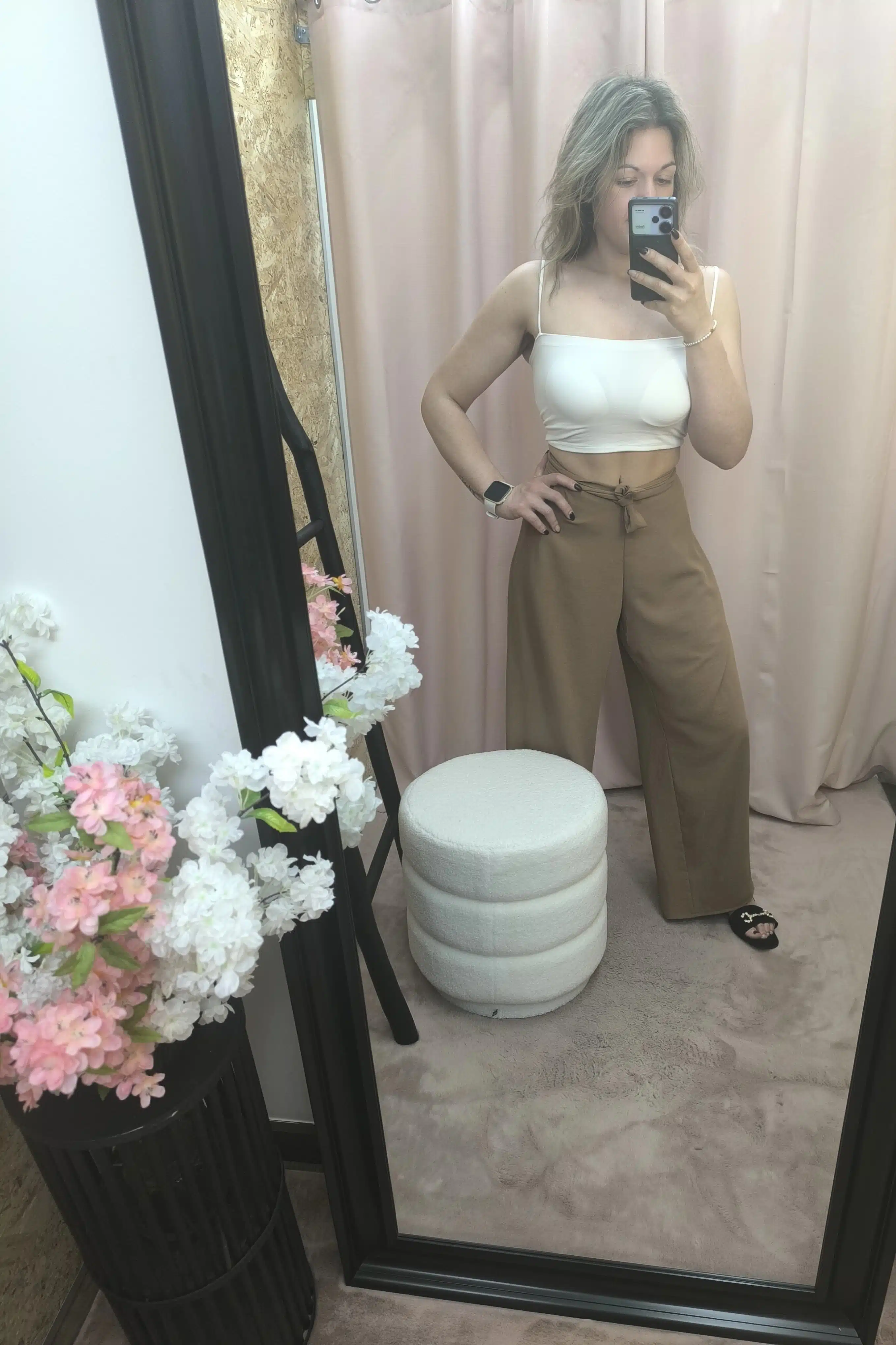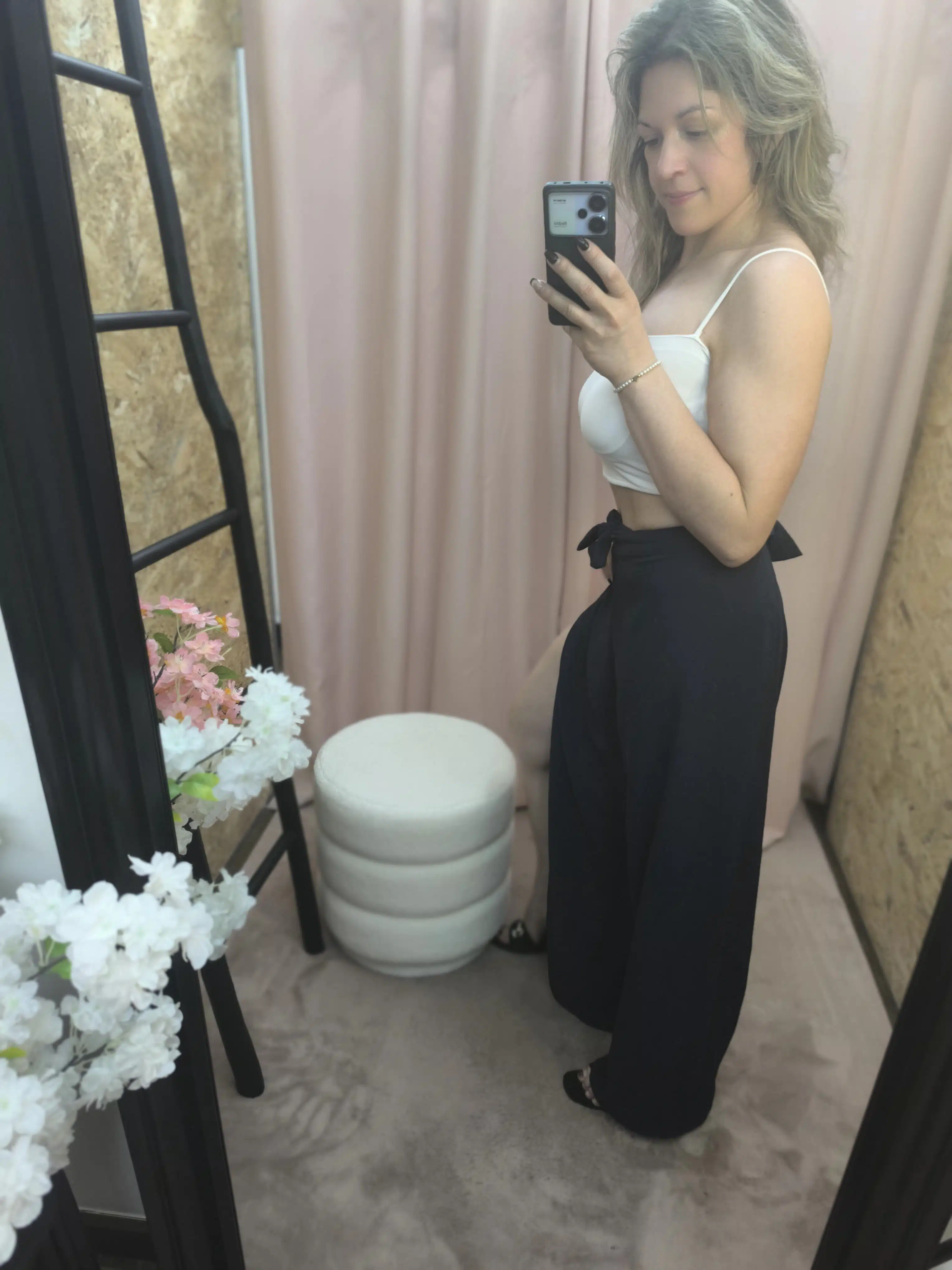 Estas Calças Envelope Chic estão disponíveis em três cores elegantes: azul-marinho, preto e camel claro. Assim, podes escolher a tonalidade que melhor reflete o teu estilo. Elas combinam facilmente com tops justos, camisas leves ou até com biquínis para um look de verão descontraído.