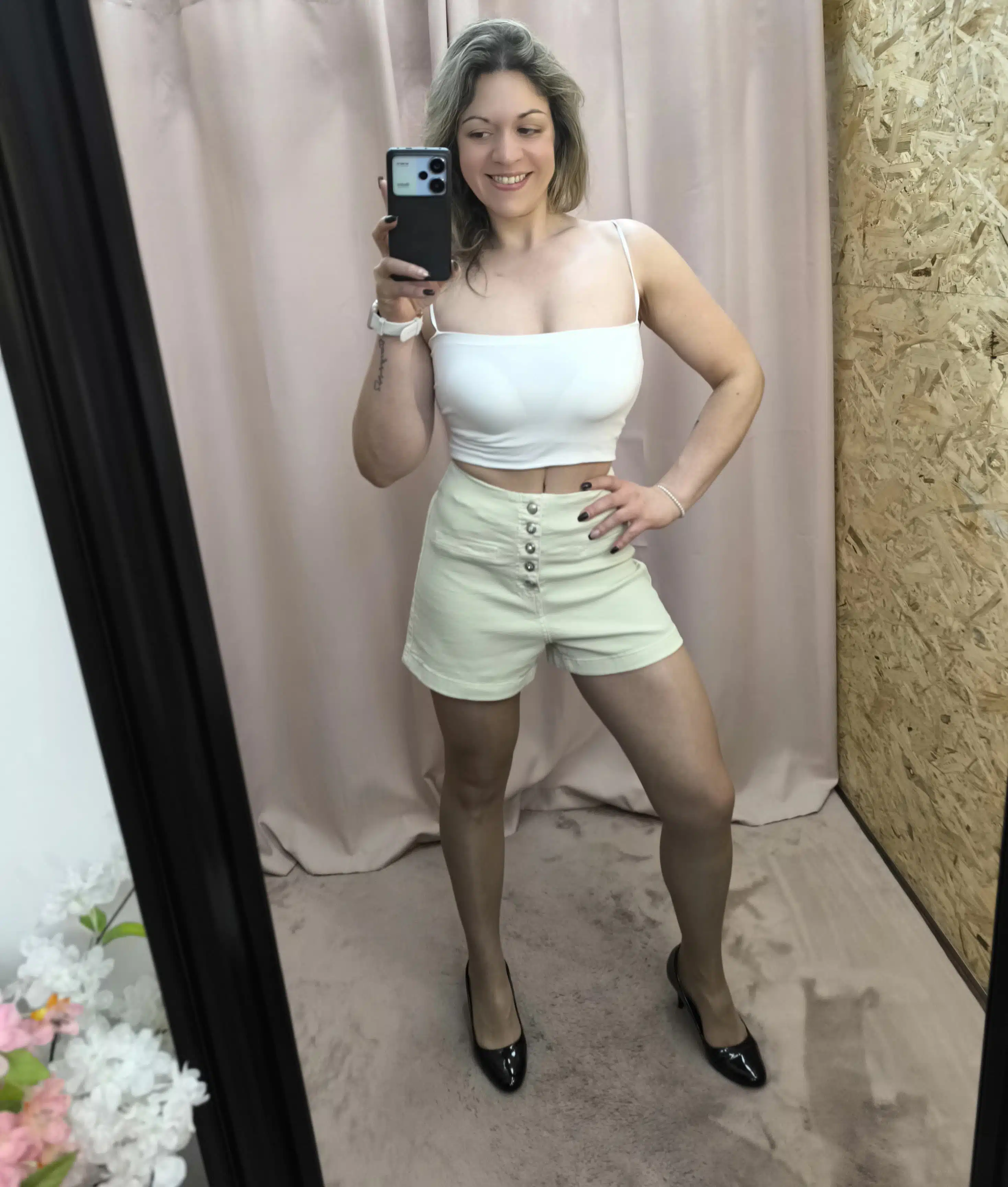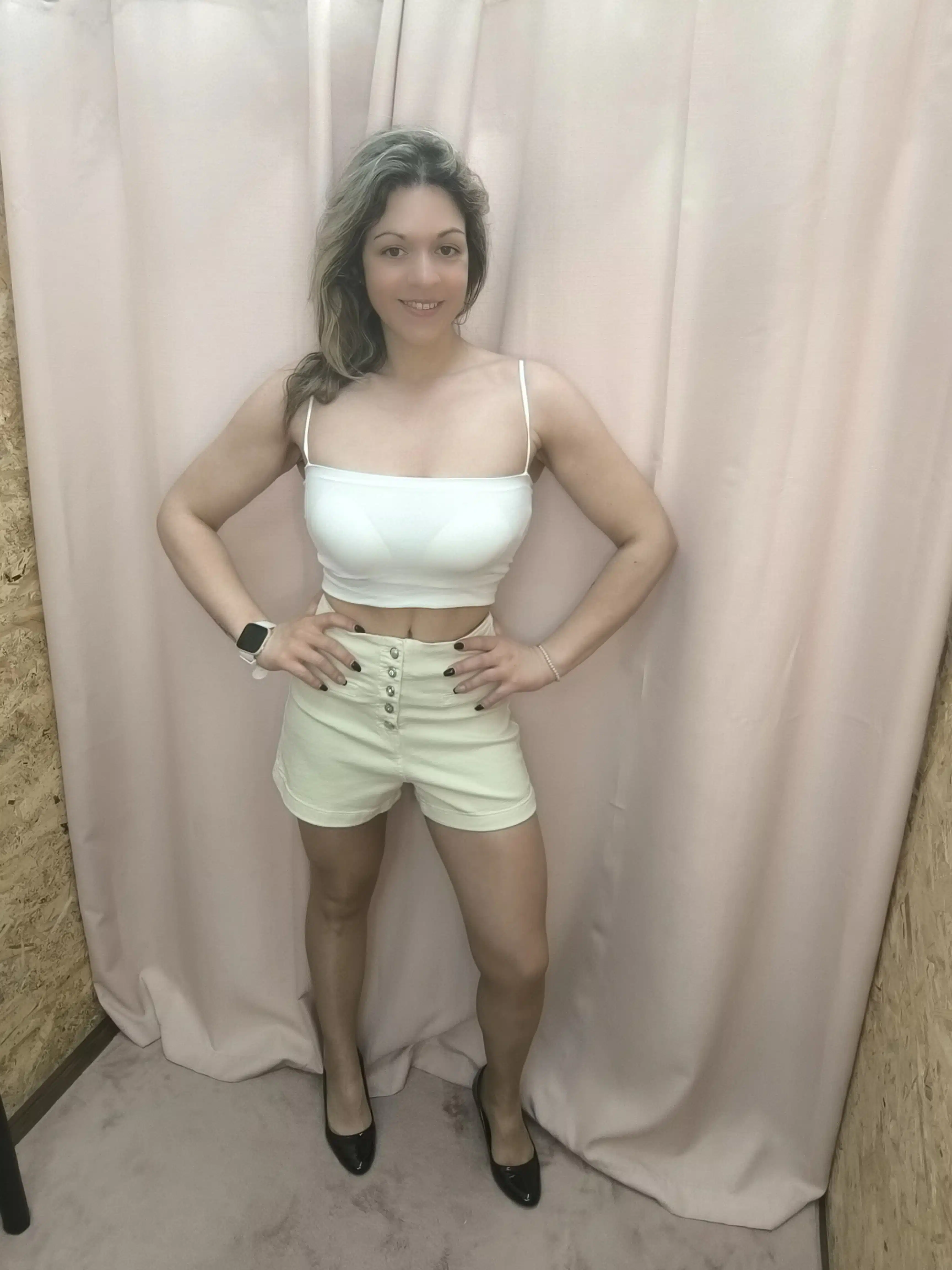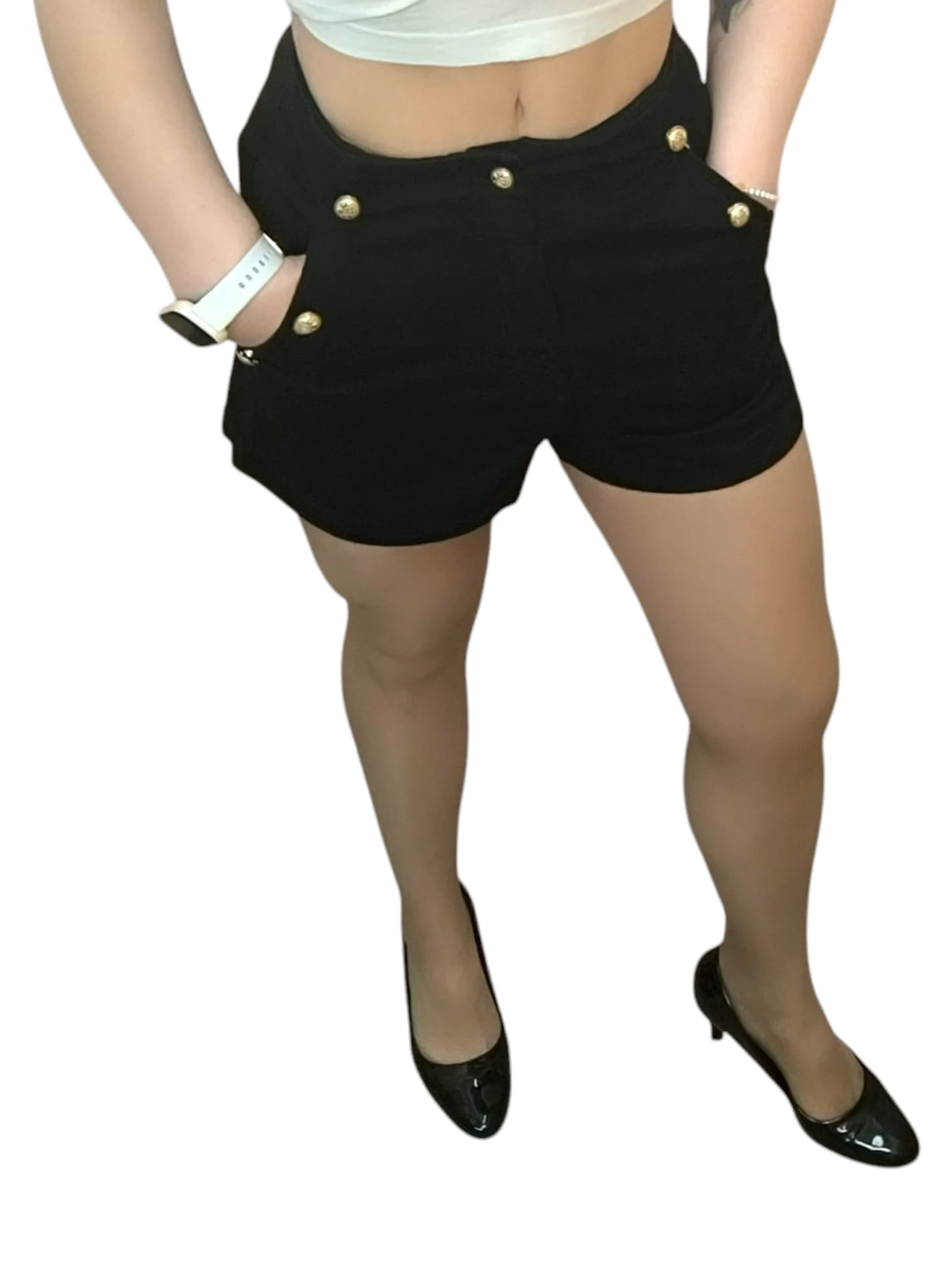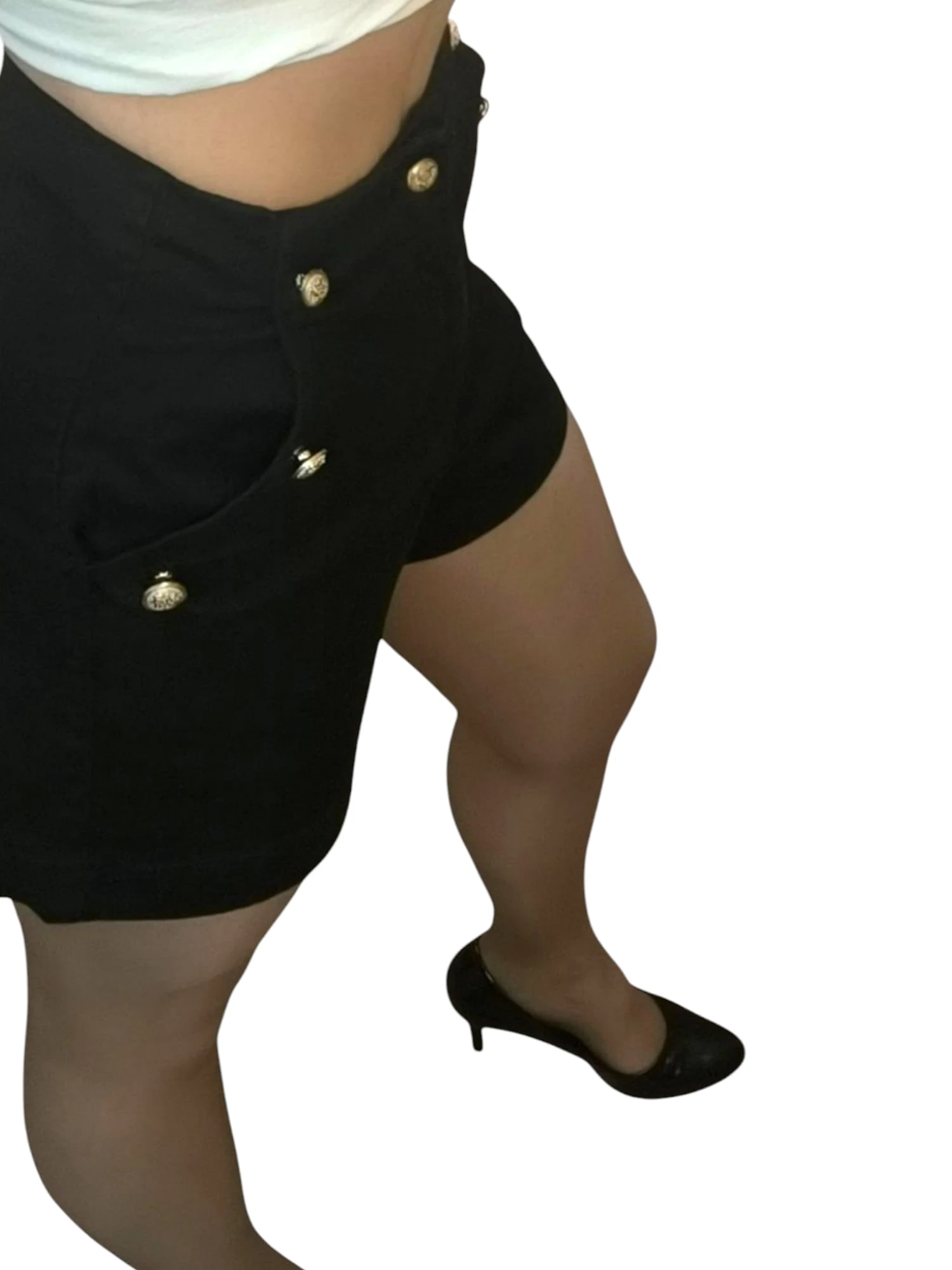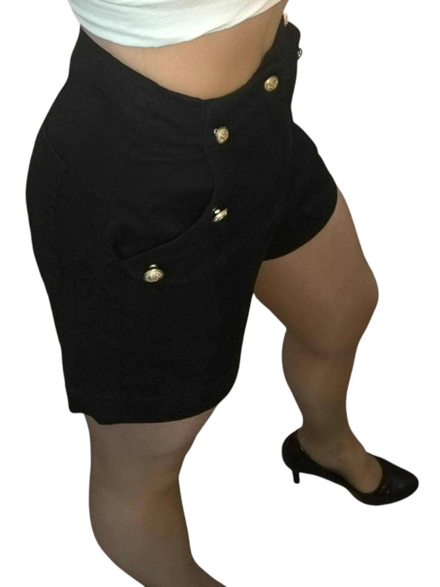Calções Look de Poder com cintura subida e botões frontais. Disponíveis em bege (tamanhos 36 e 38) e preto (tamanhos 36, 38 e 40). Ideais para um visual confiante e elegante.