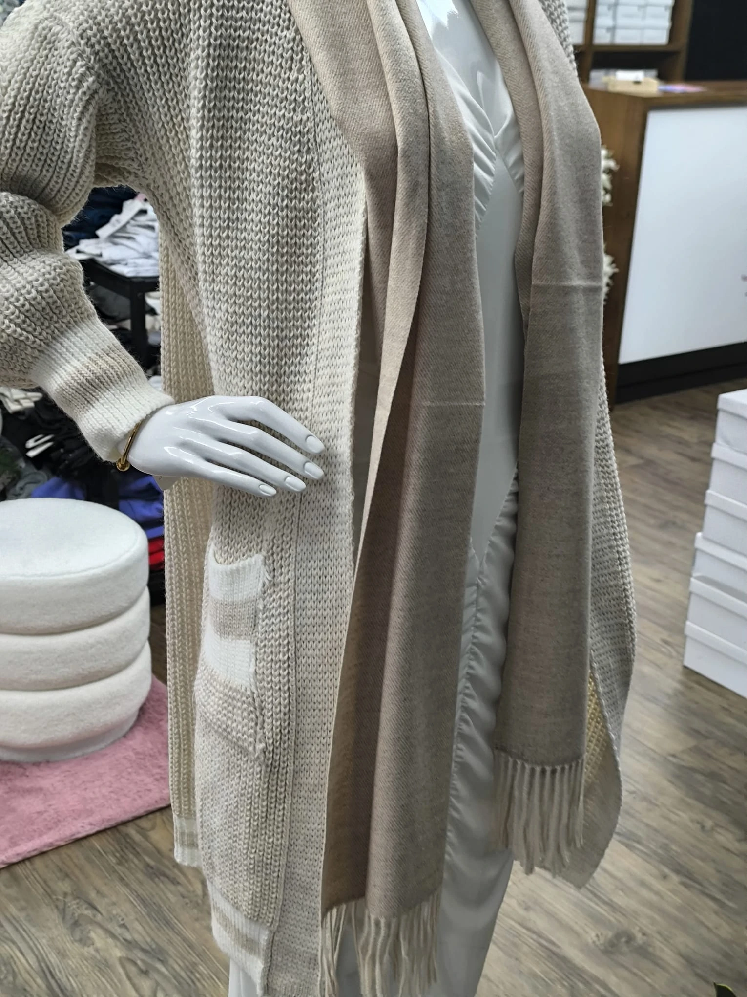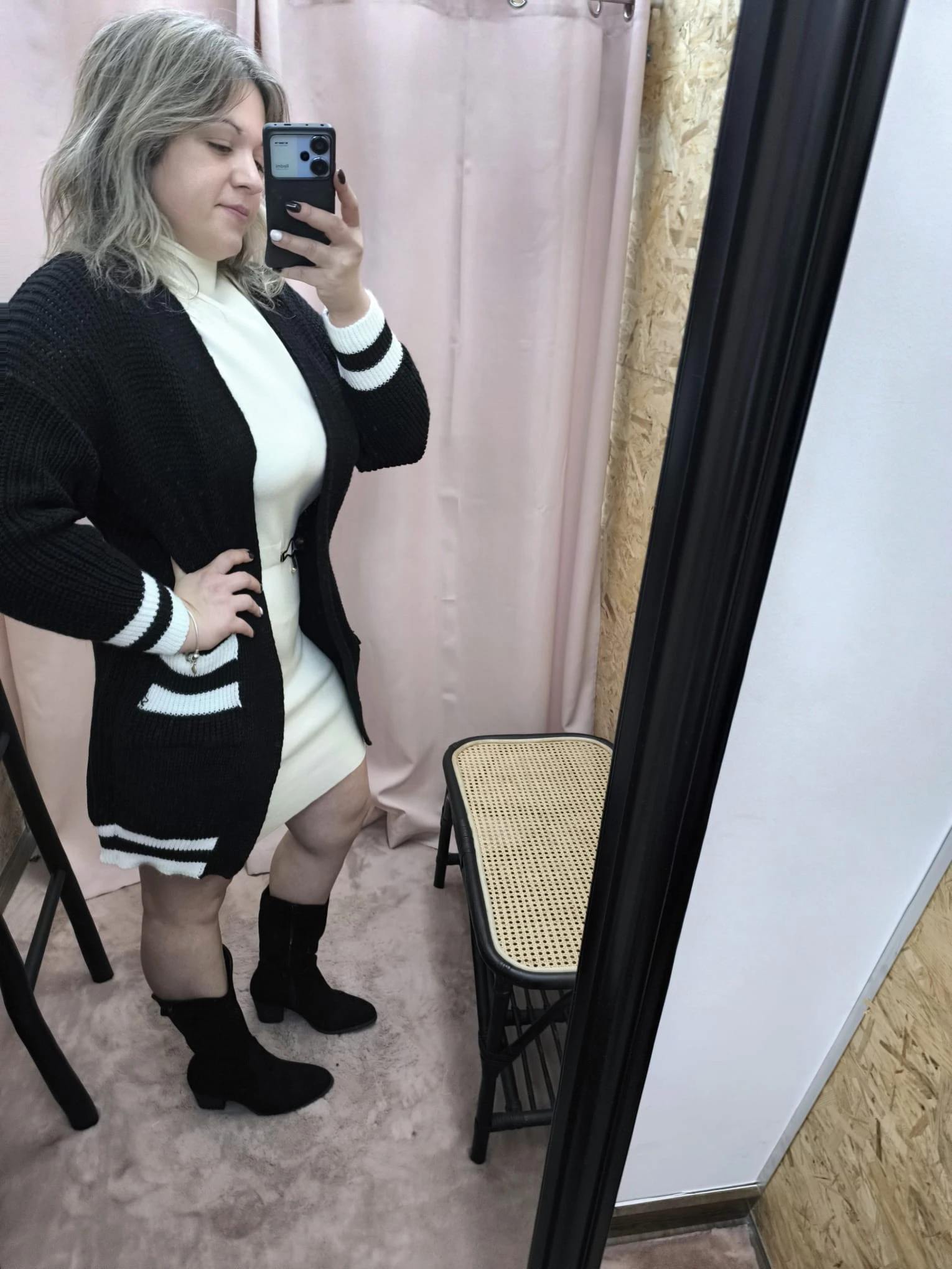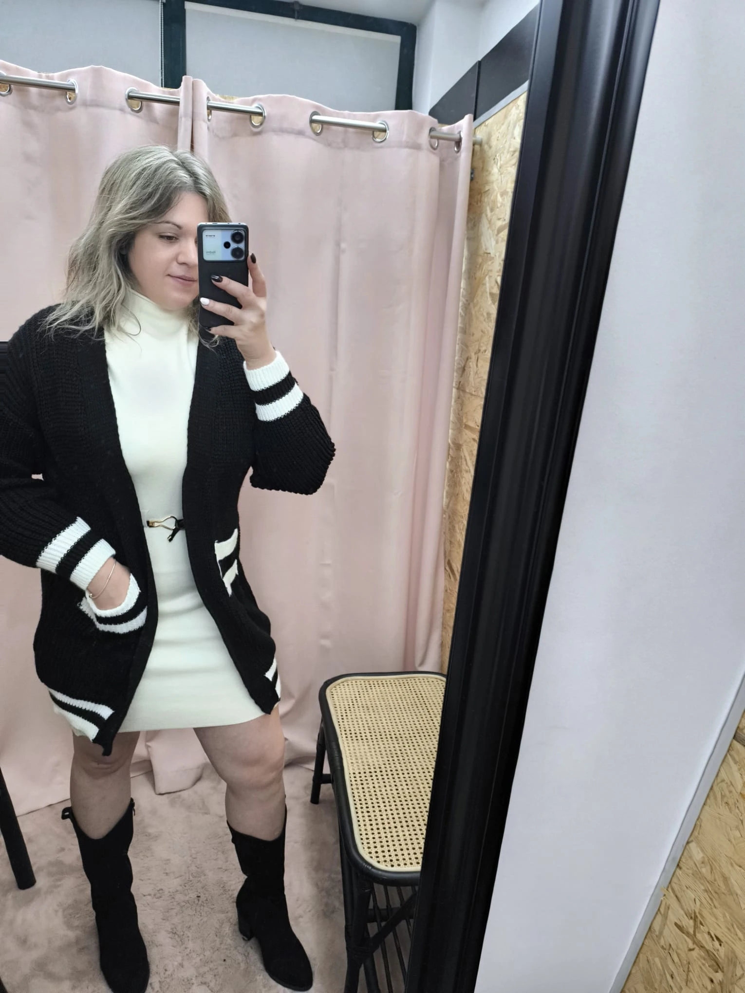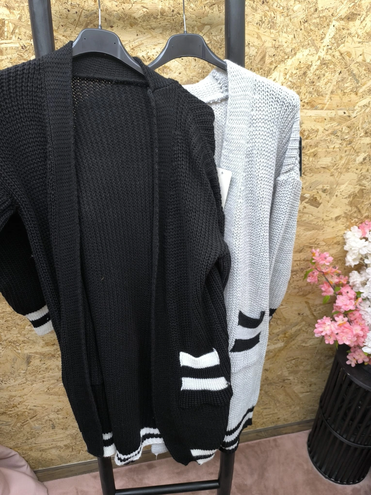 Aposte no aconchego e estilo deste casaco de malha grossa. Os detalhes em lista branca nos punhos e bolsos adicionam um toque moderno e charmoso, perfeito para compor looks quentinhos e sofisticados.