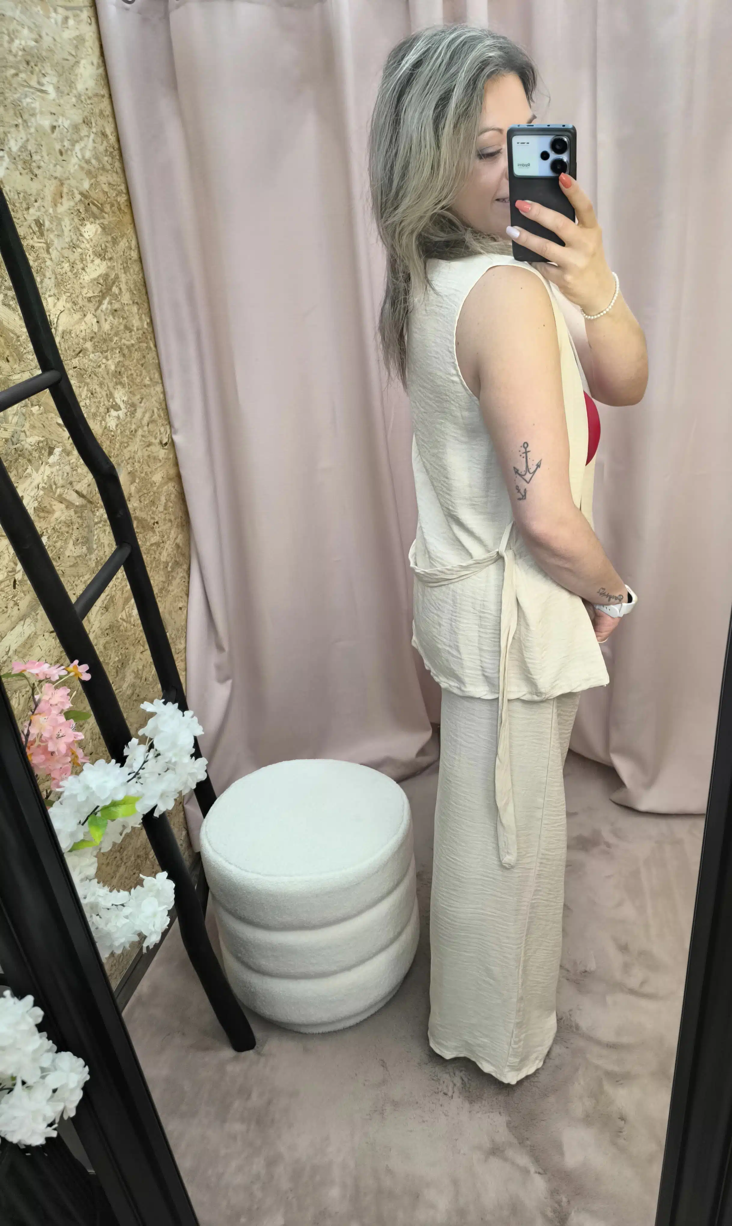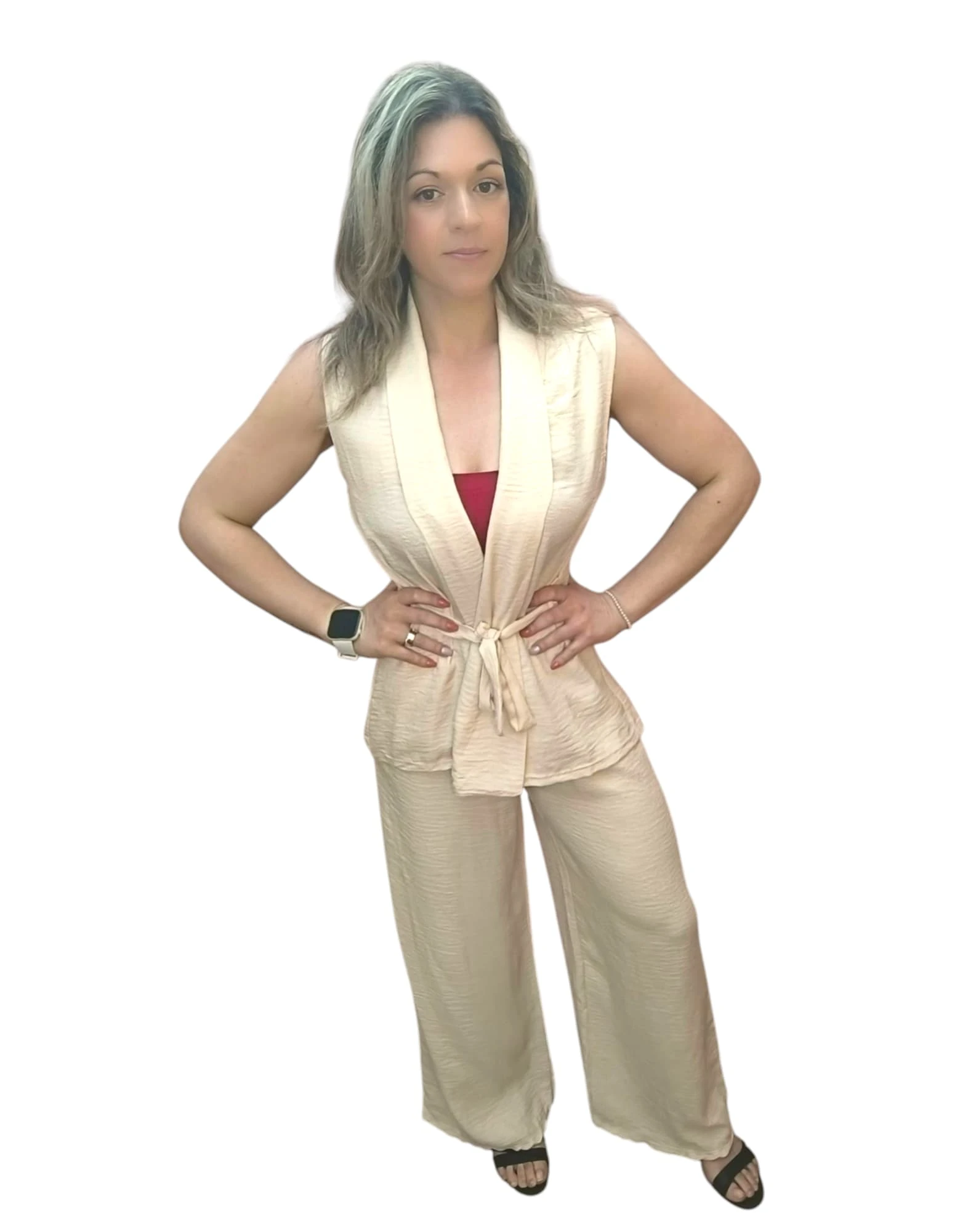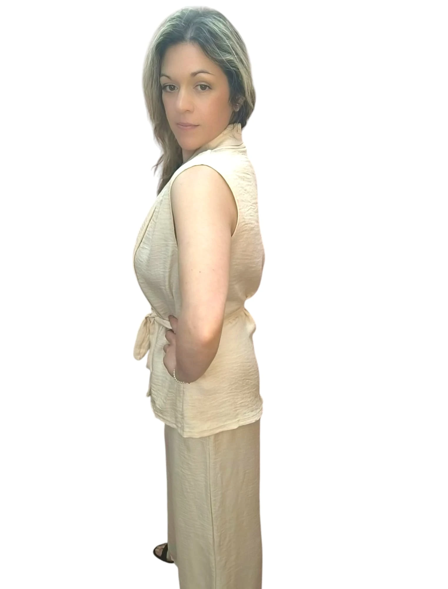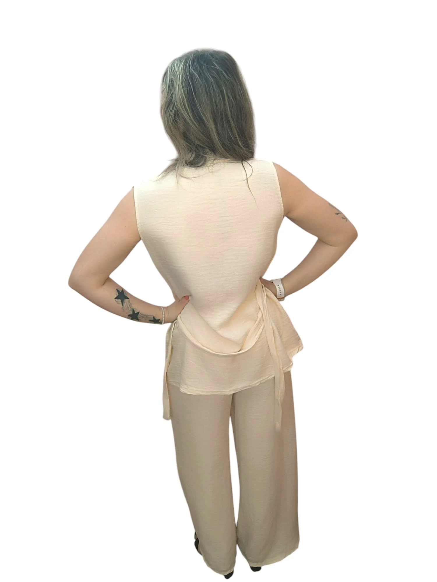 O Conjunto Bege Leveza Urbana une elegância e praticidade. Composto por calça com elástico e bolsos e um colete fluido, é perfeito para um look leve, moderno e fresco.