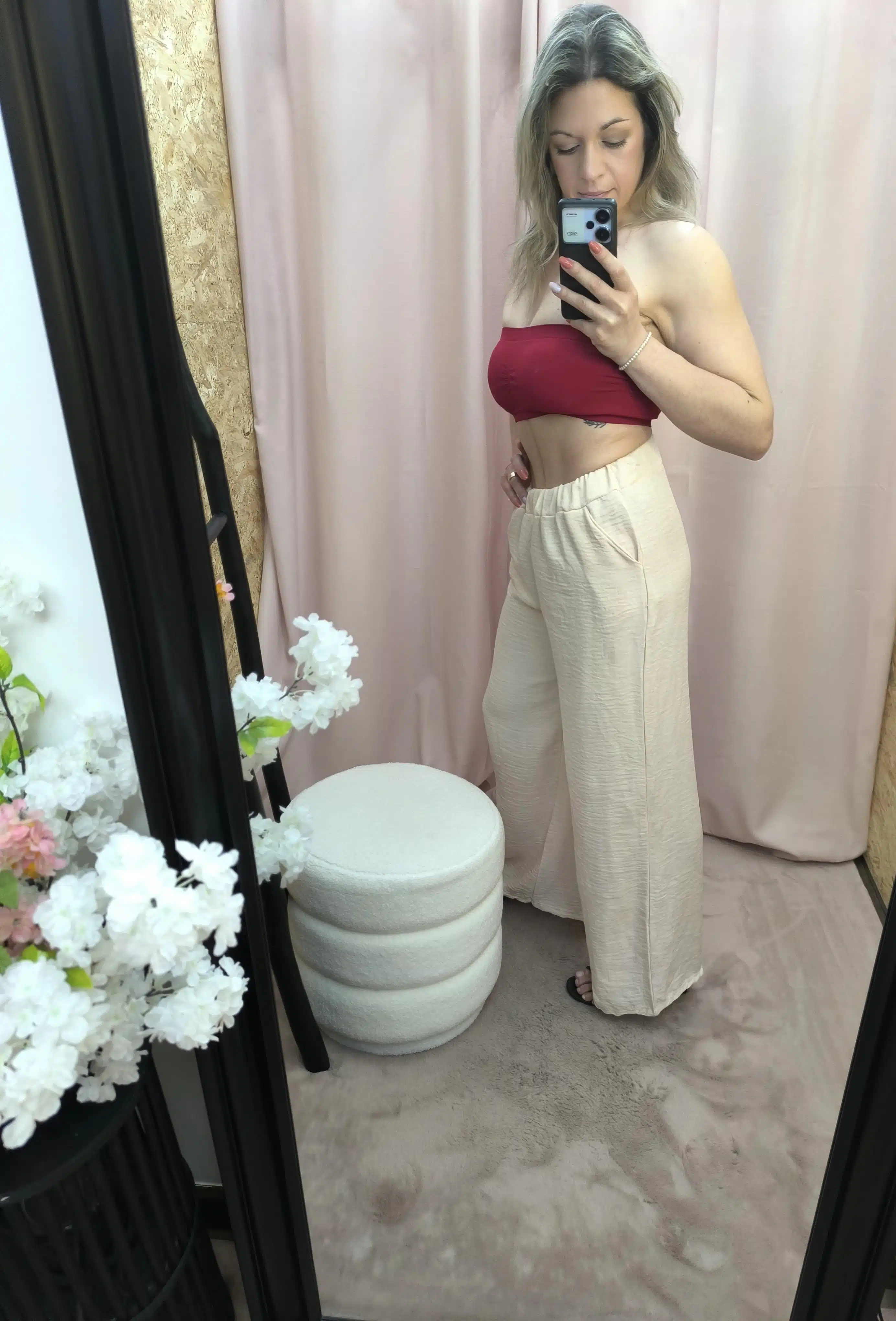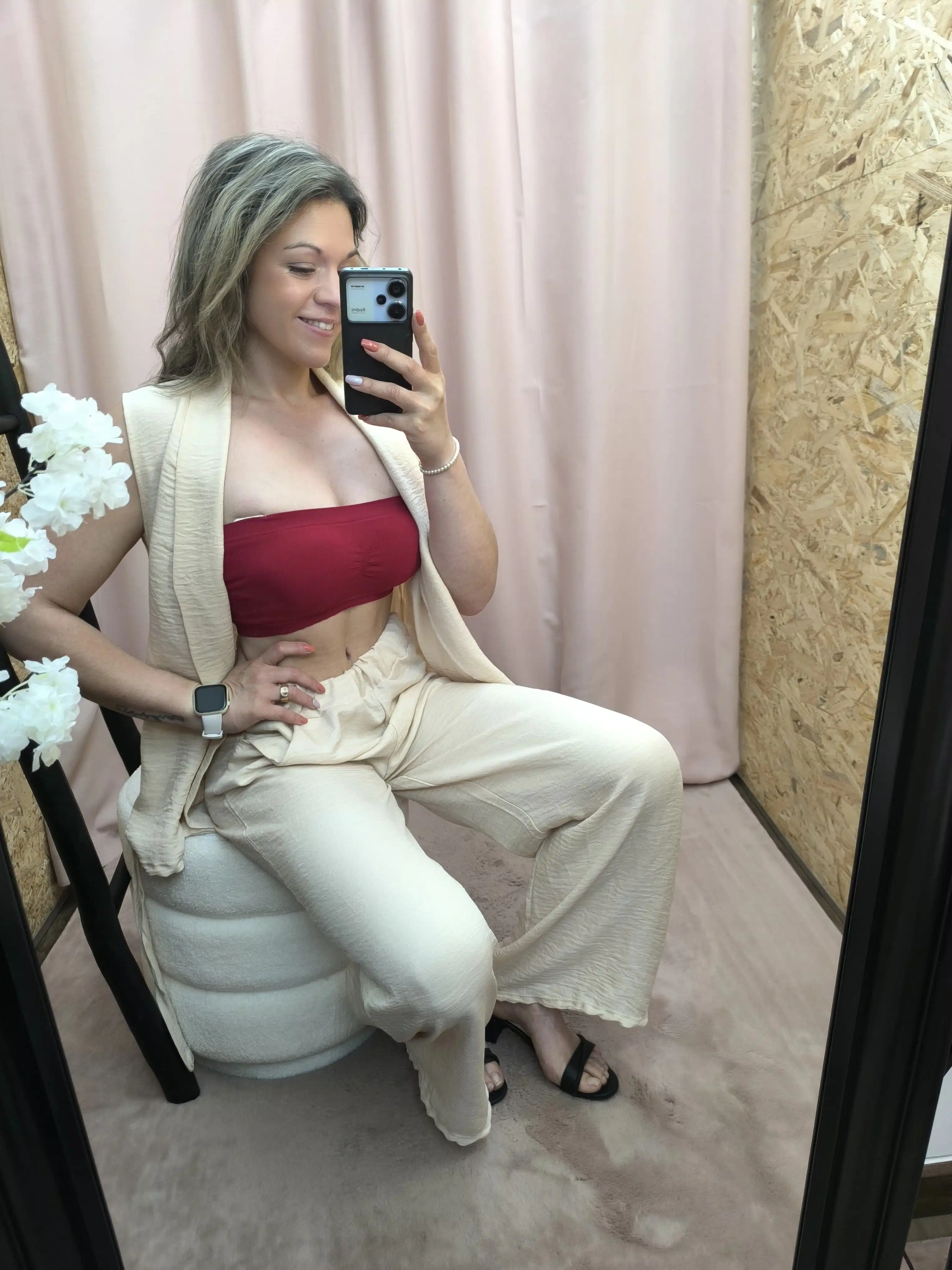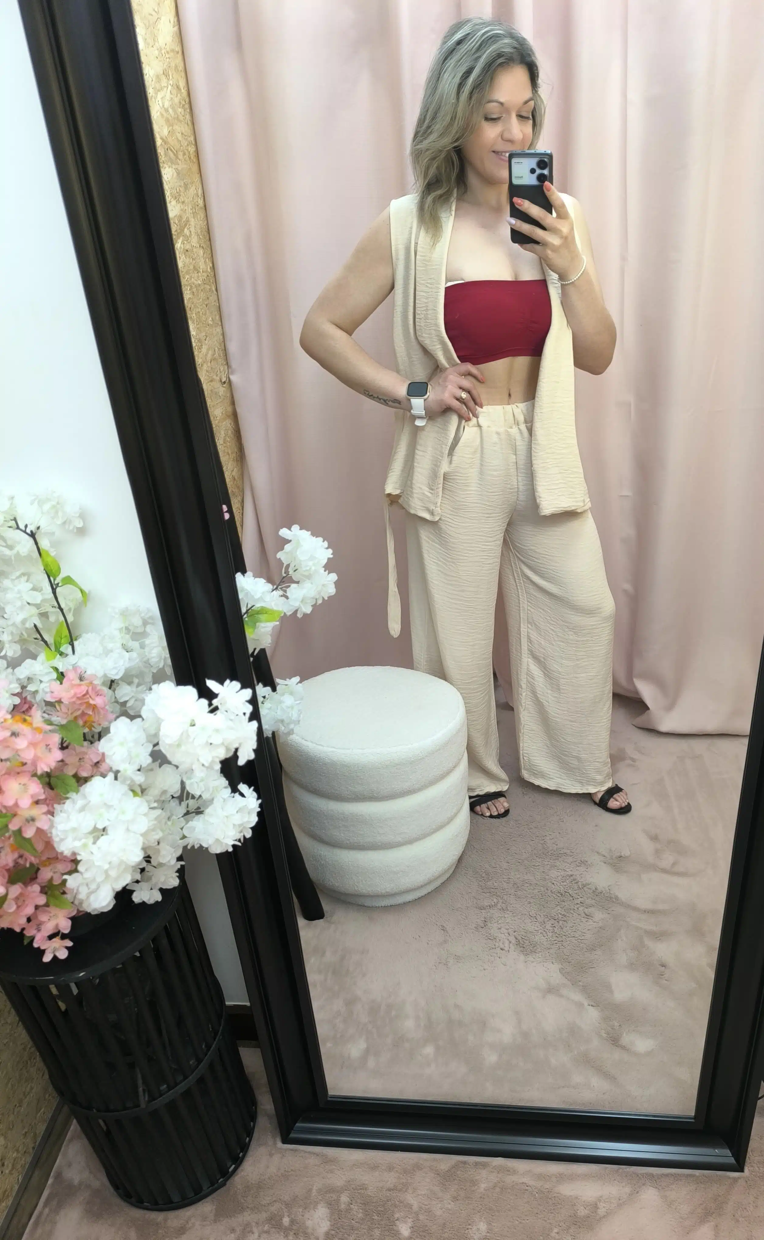 O Conjunto Bege Leveza Urbana une elegância e praticidade. Composto por calça com elástico e bolsos e um colete fluido, é perfeito para um look leve, moderno e fresco.