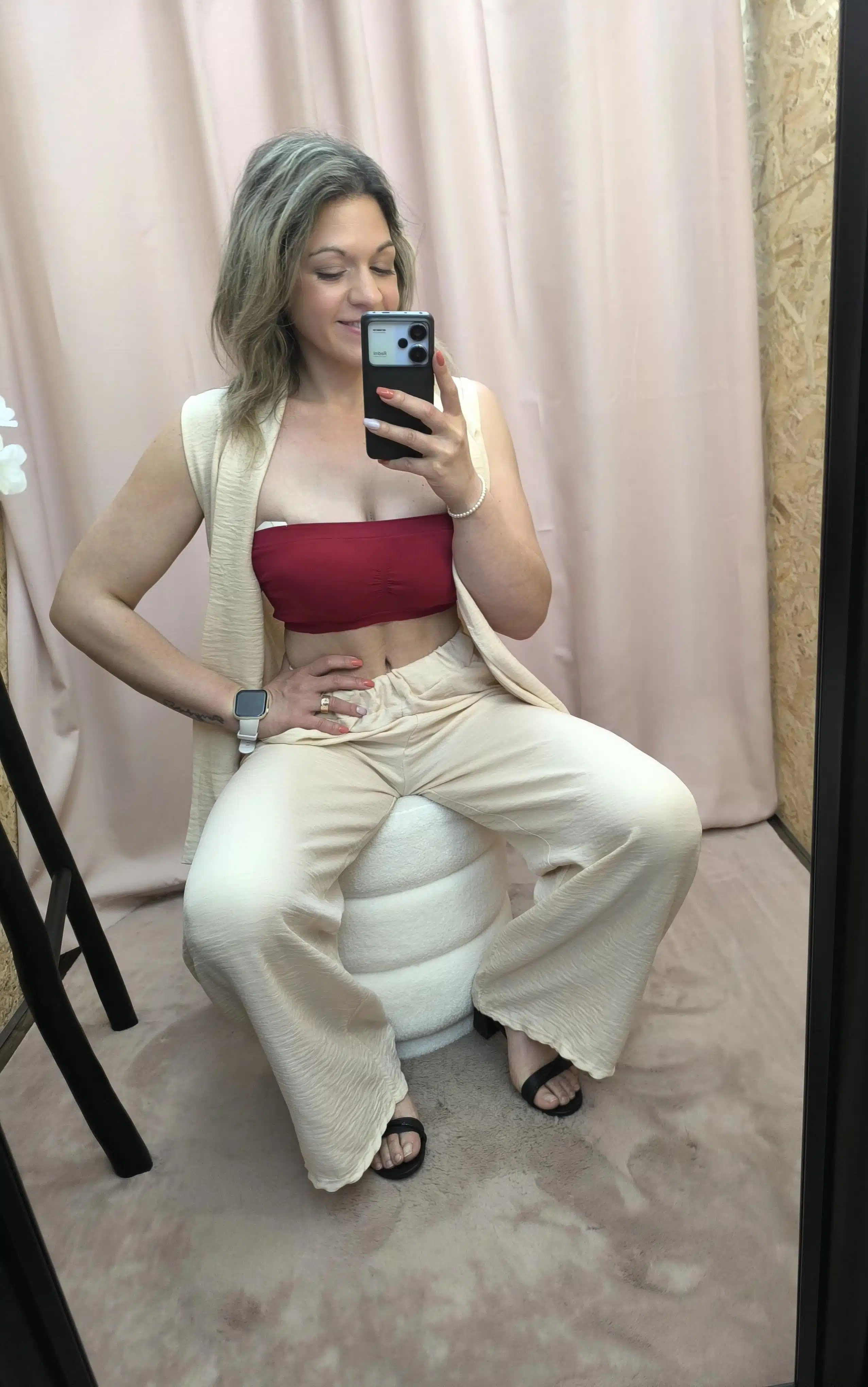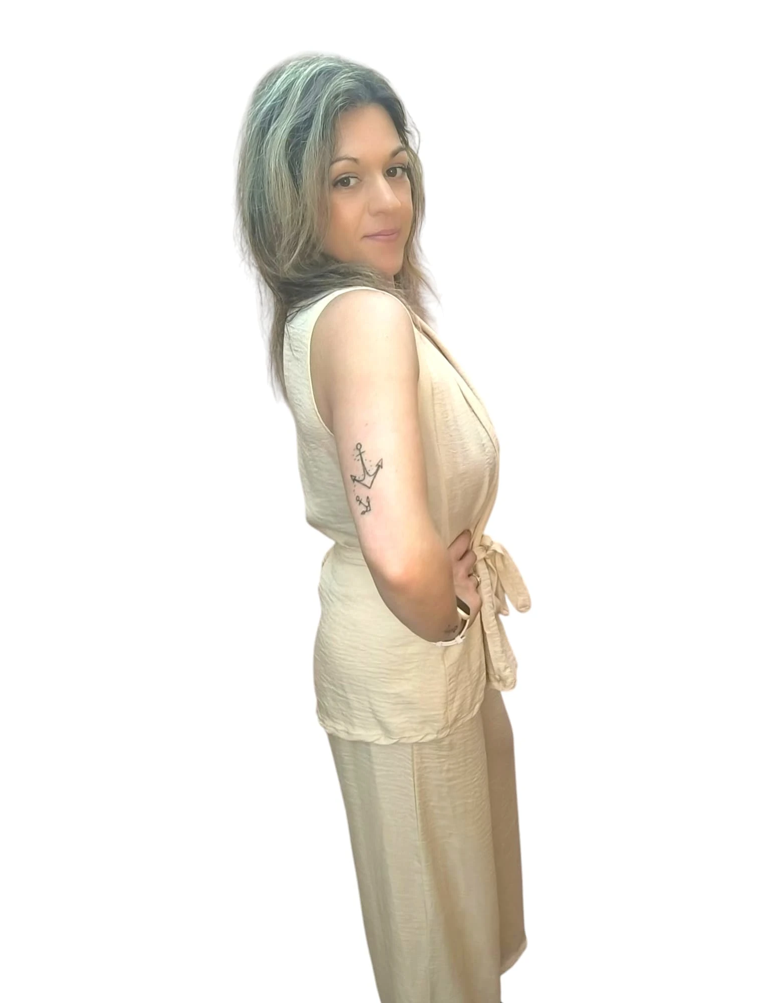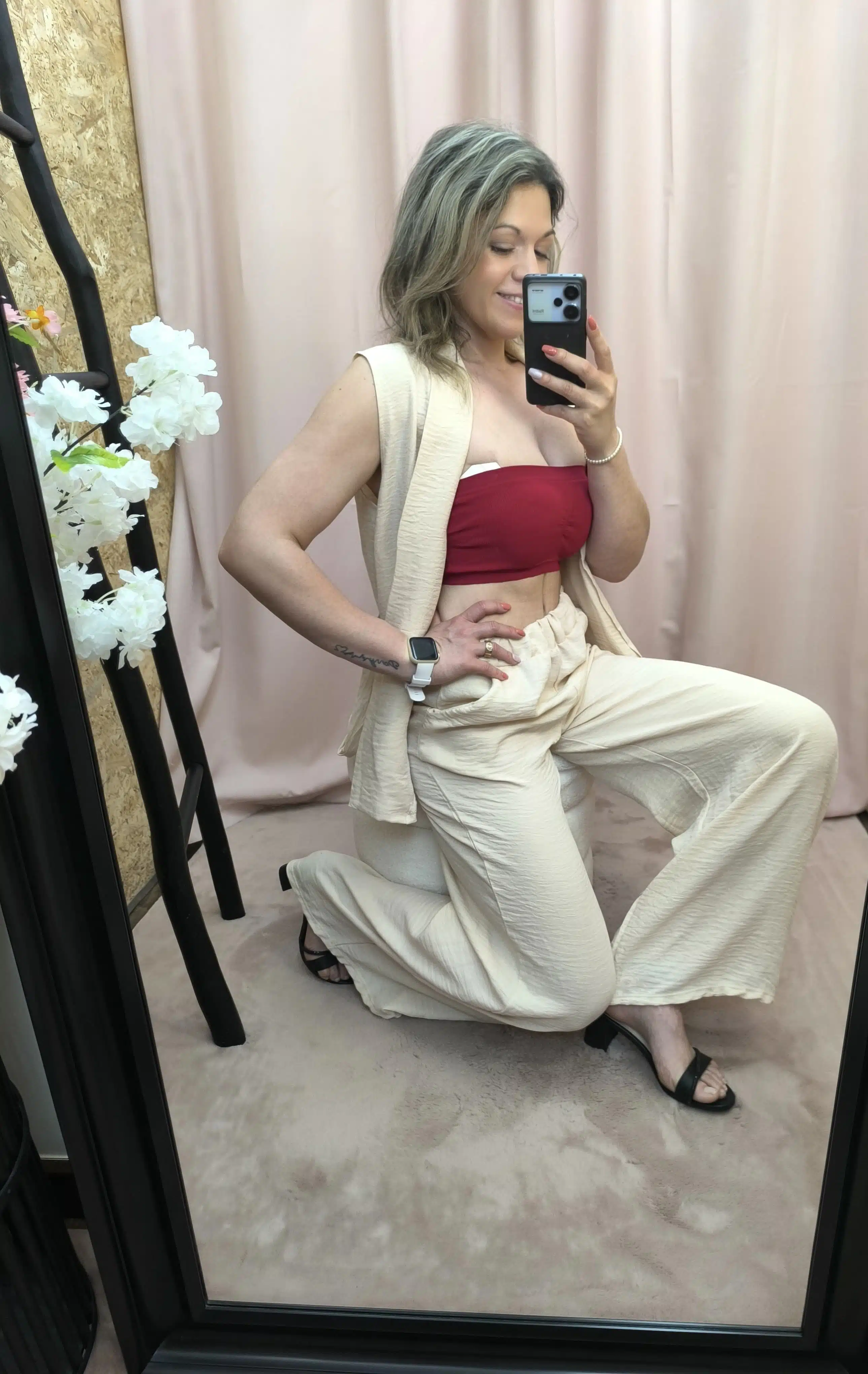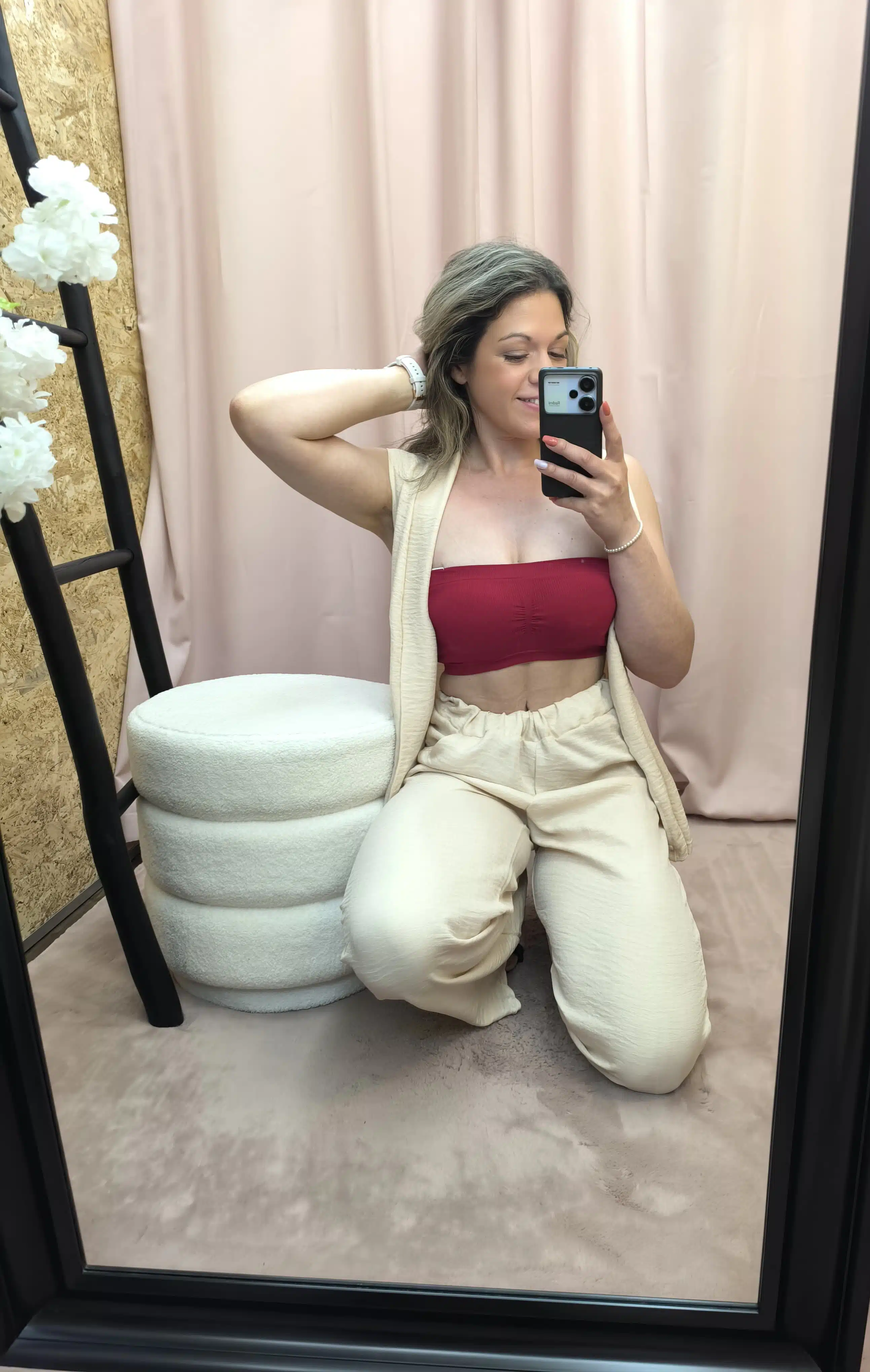 O Conjunto Bege Leveza Urbana une elegância e praticidade. Composto por calça com elástico e bolsos e um colete fluido, é perfeito para um look leve, moderno e fresco.