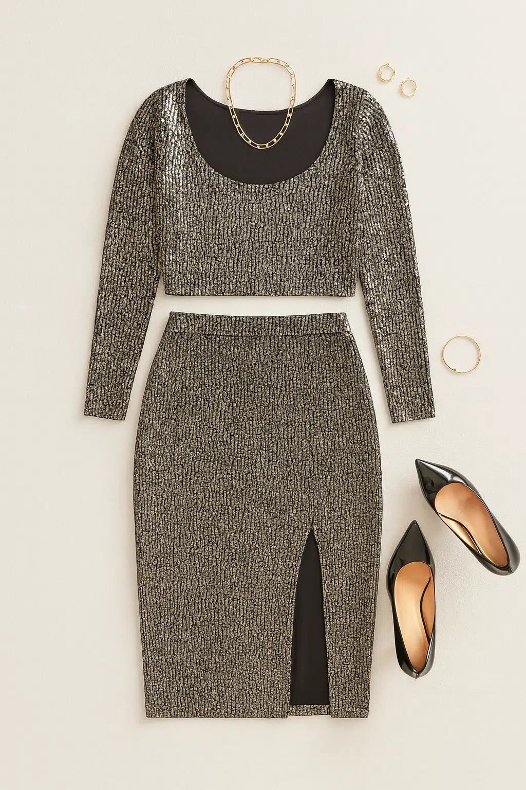 Perfeito para eventos especiais, jantares elegantes ou noites memoráveis, o Conjunto adapta-se a diferentes ocasiões com facilidade. O top cropped de manga comprida ajusta-se ao corpo, realçando a silhueta de forma confortável e elegante. Além disso, o tecido brilhante, característica central deste conjunto, confere um toque luxuoso a qualquer visual.