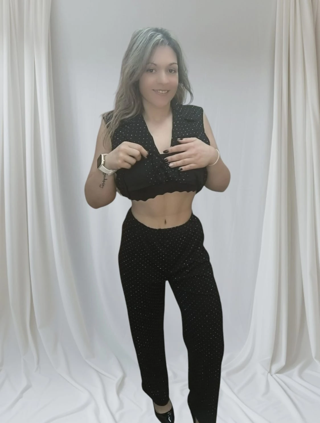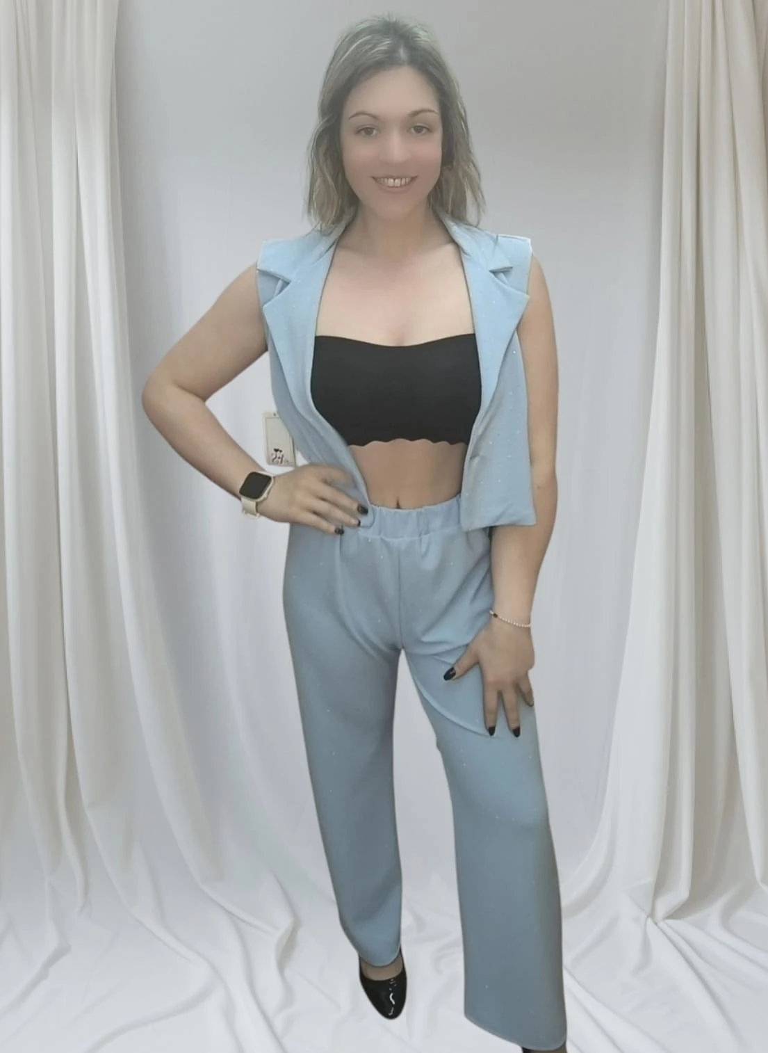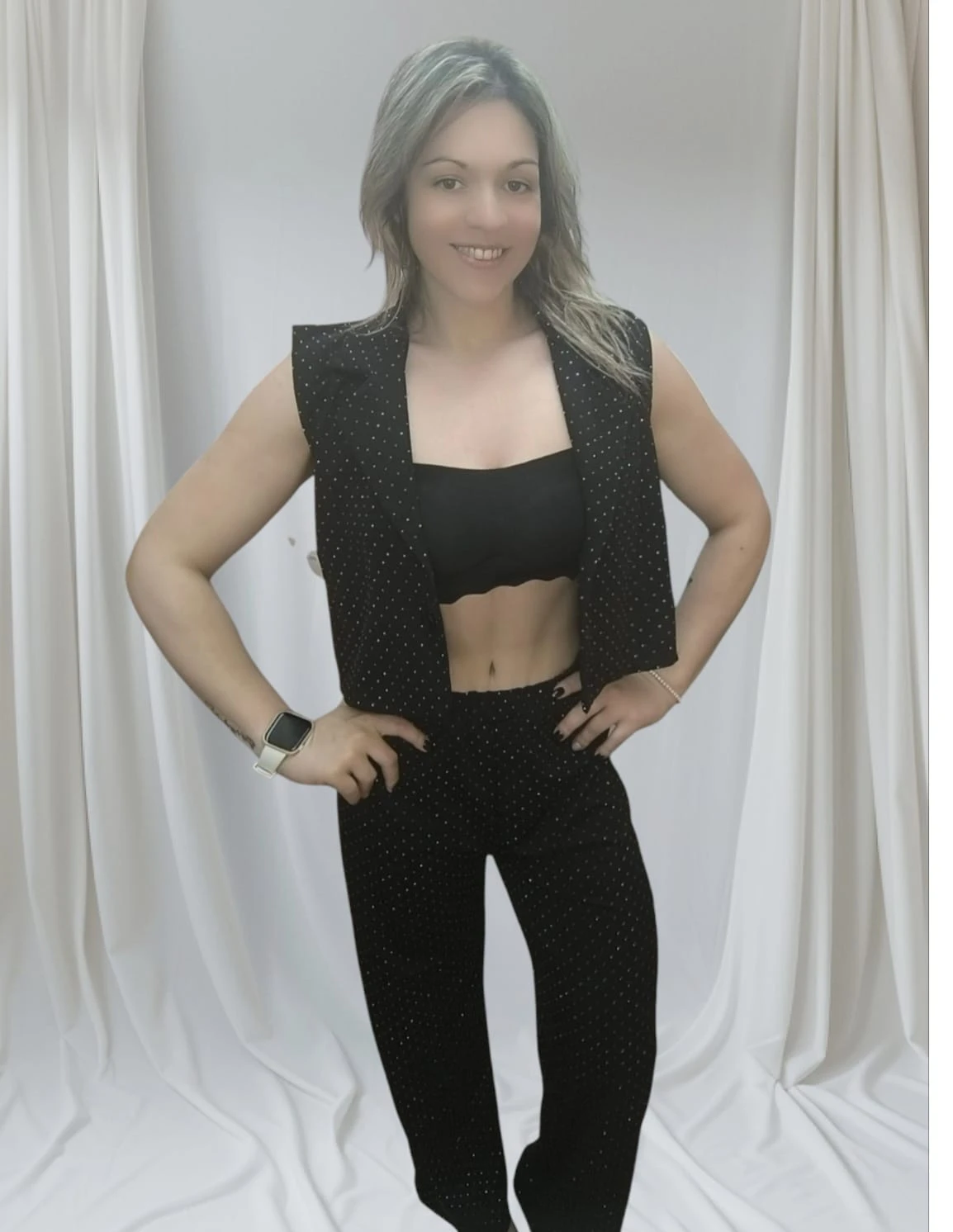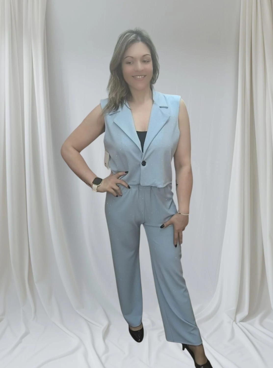 Os brilhos espalhados por toda a peça criam um efeito cintilante que valoriza o visual sem exageros. Esta característica transforma o conjunto numa escolha ideal tanto para eventos casuais elegantes como para momentos especiais. Além disso, o corte reto das calças alonga a figura e o colete sem mangas realça os ombros, conferindo um ar sofisticado e moderno.