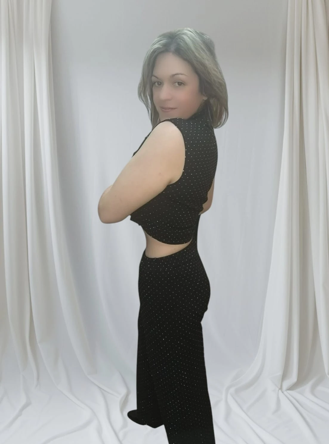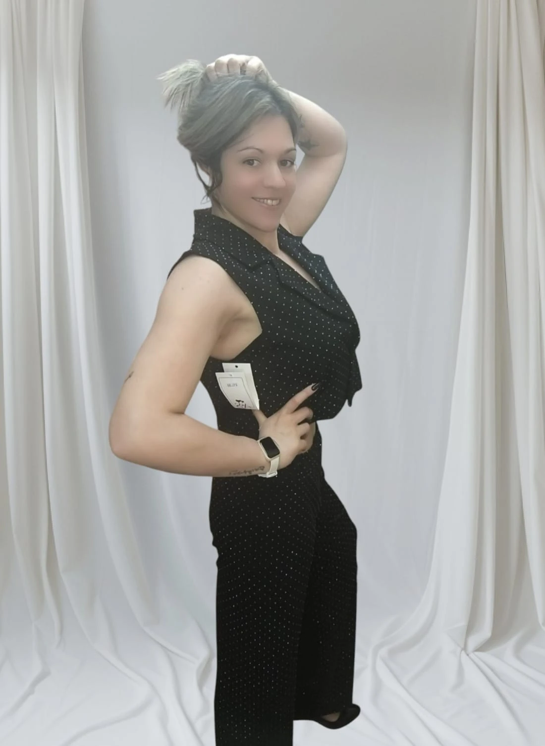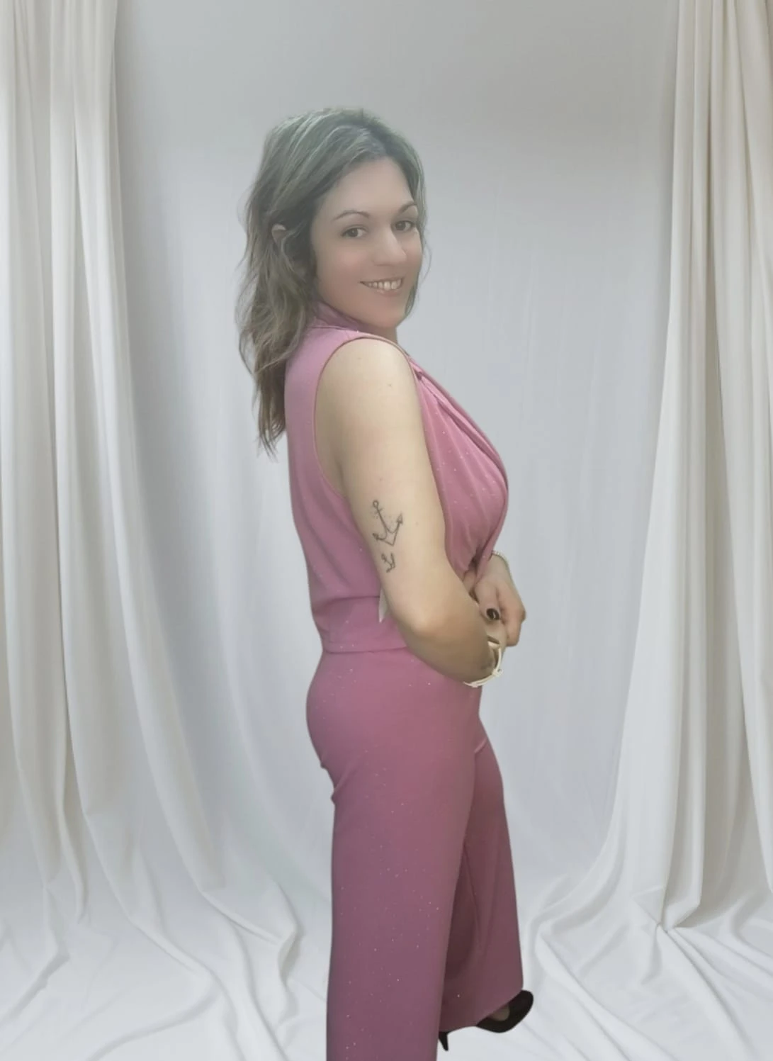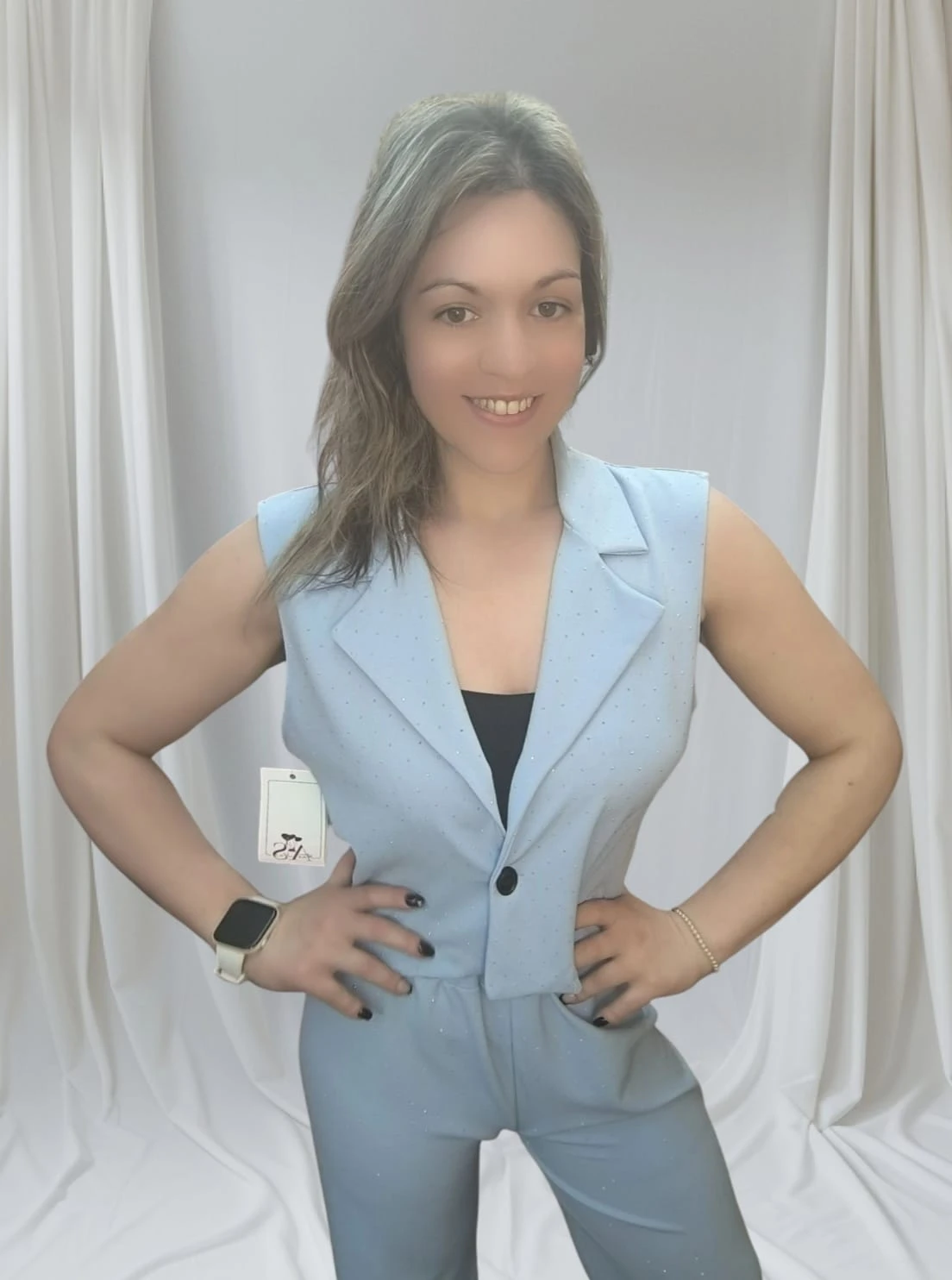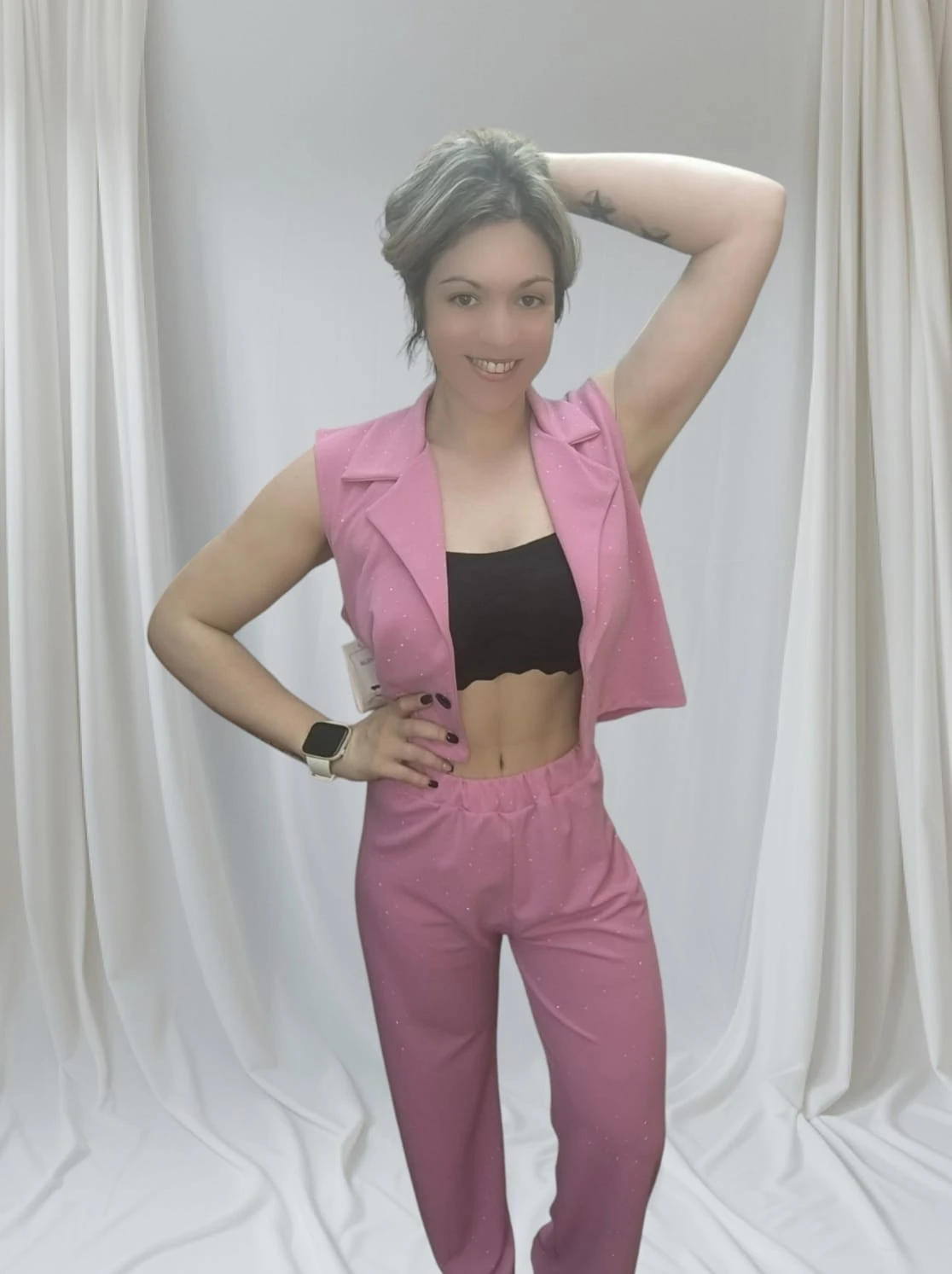 Os brilhos espalhados por toda a peça criam um efeito cintilante que valoriza o visual sem exageros. Esta característica transforma o conjunto numa escolha ideal tanto para eventos casuais elegantes como para momentos especiais. Além disso, o corte reto das calças alonga a figura e o colete sem mangas realça os ombros, conferindo um ar sofisticado e moderno.