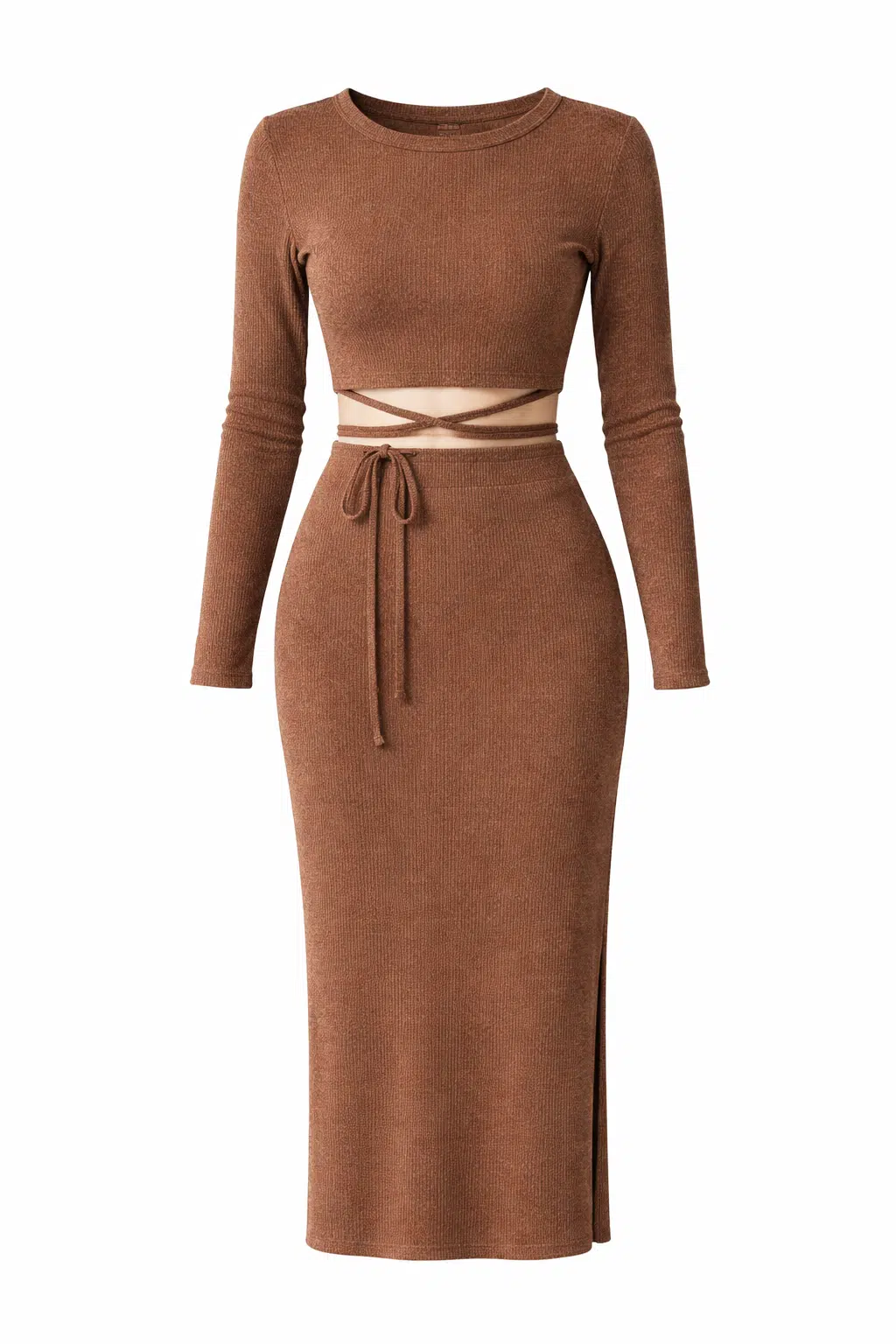 Conjunto de malha feminino composto por camisola cropped e saia midi com racha subtil. Um modelo confortável, elegante e versátil, disponível em duas cores e em tamanho único até M/L.