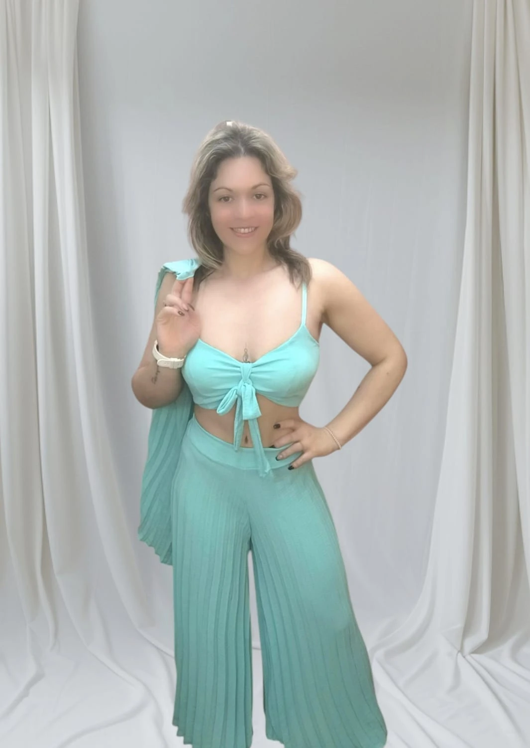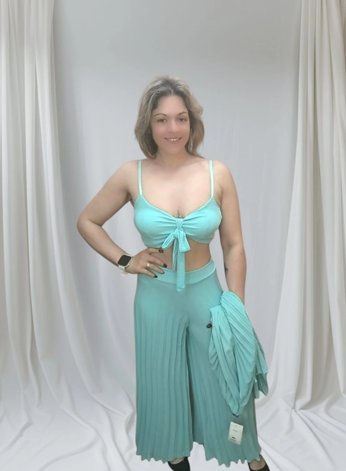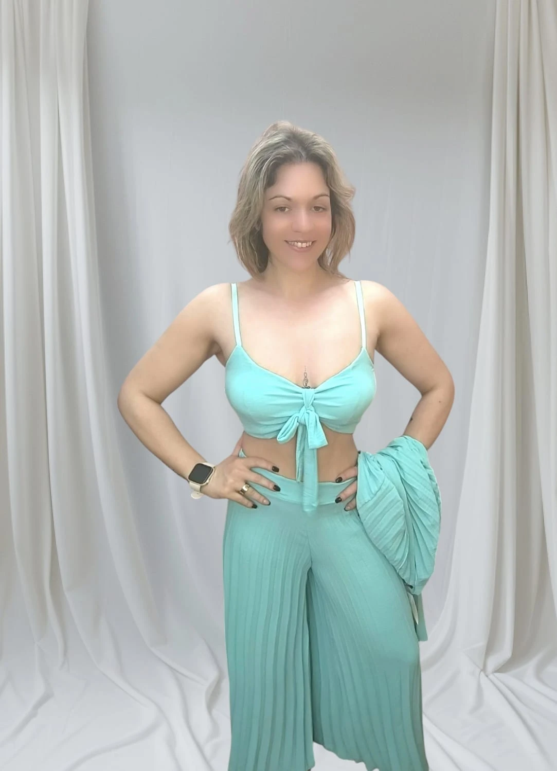 O Conjunto Elegância Serena é composto por três peças incríveis: calça plissada com elástico, top ajustável com laço e casaco plissado. Versátil e confortável, veste tamanhos até L/XL.