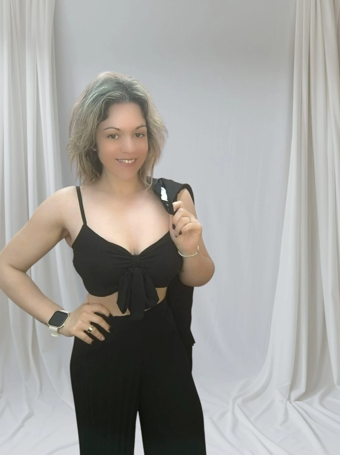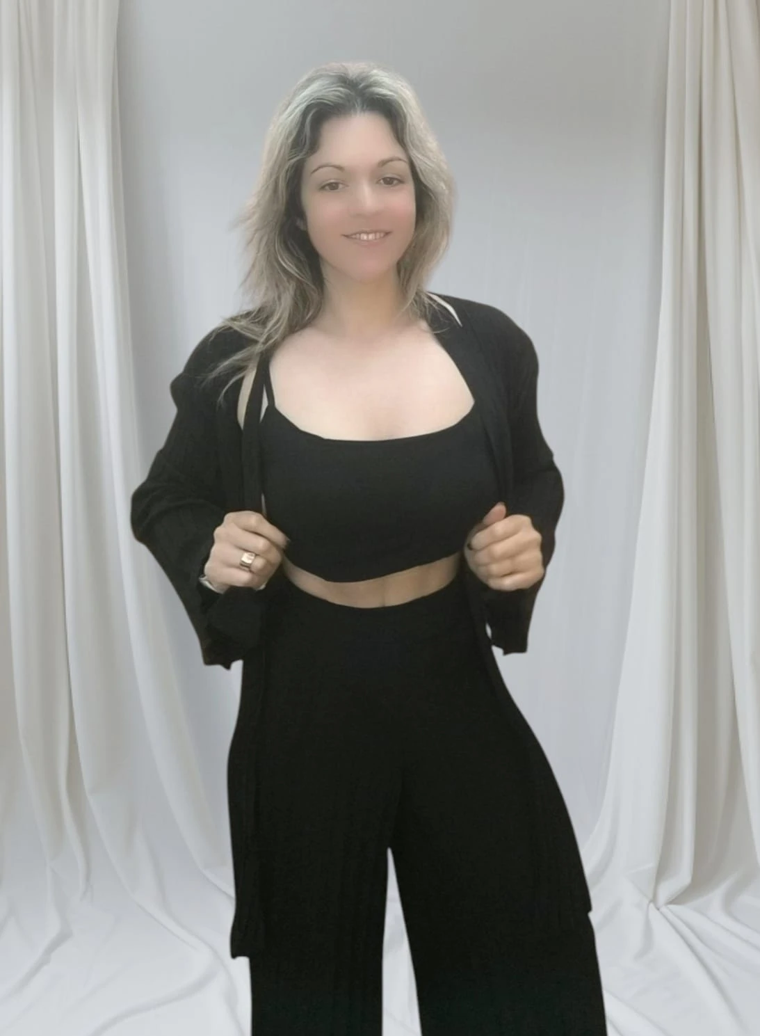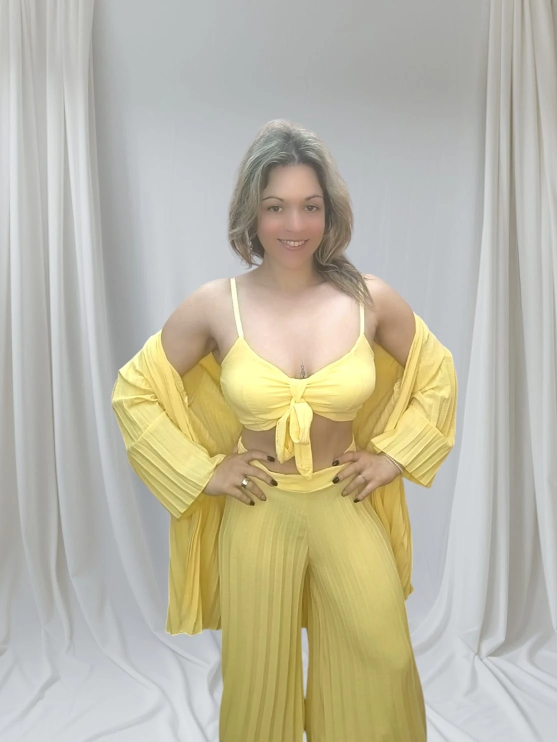 O Conjunto Elegância Serena é composto por três peças incríveis: calça plissada com elástico, top ajustável com laço e casaco plissado. Versátil e confortável, veste tamanhos até L/XL.