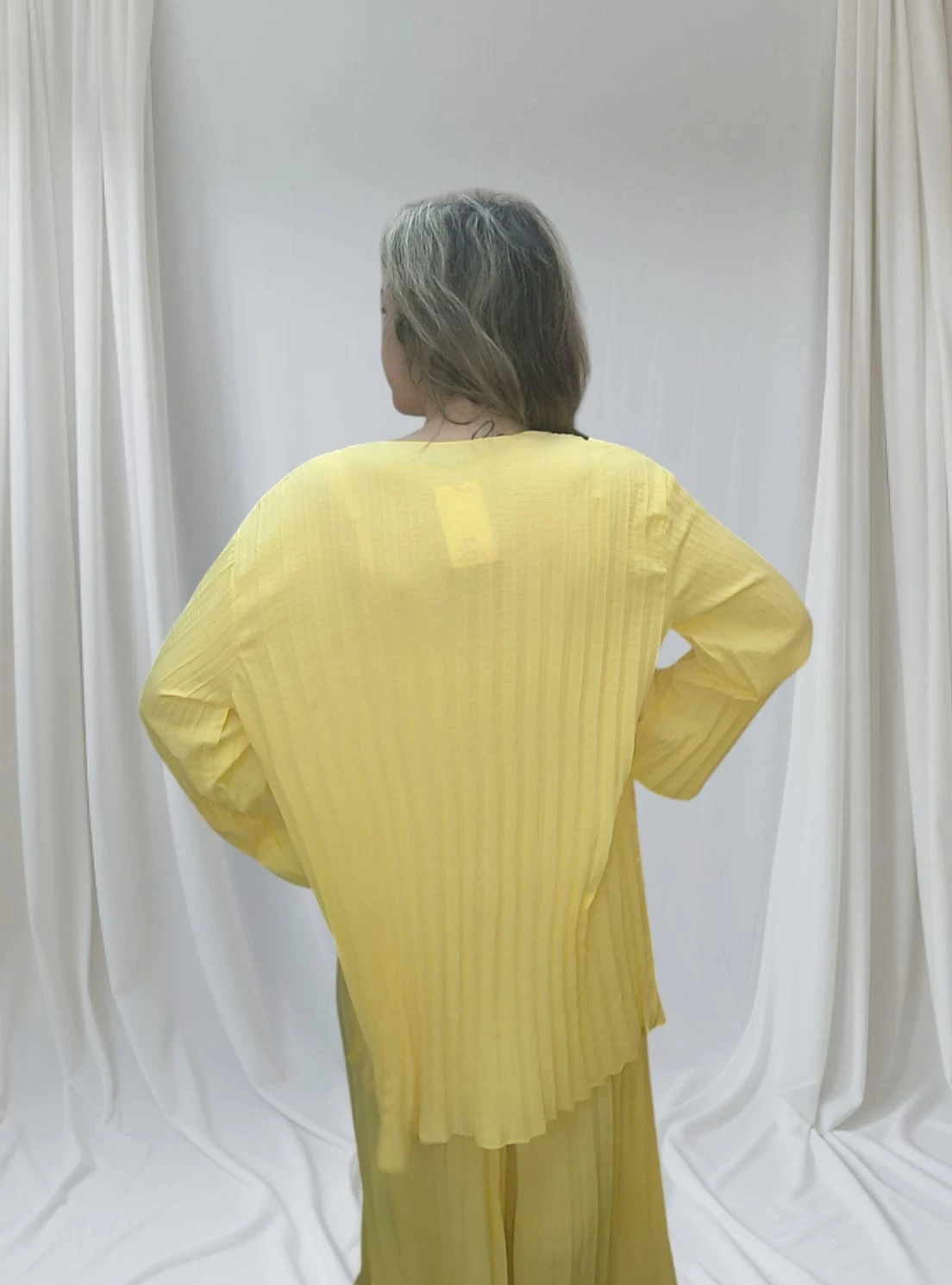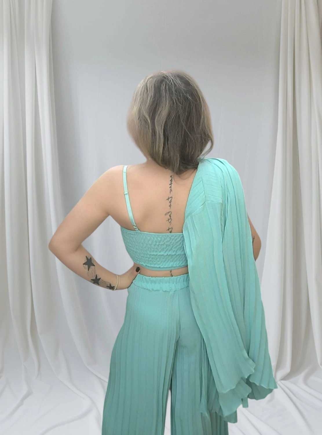 A calça plissada, com cintura elástica, proporciona liberdade de movimentos e ajusta-se de forma confortável ao corpo. Além disso, realça a silhueta com um caimento leve e sofisticado. O top, com design versátil, permite diferentes estilos: pode ser usado com o laço na frente para um toque mais romântico ou sem o laço para um visual minimalista. Já o casaco plissado completa o look com fluidez e modernidade, tornando o conjunto ainda mais especial.