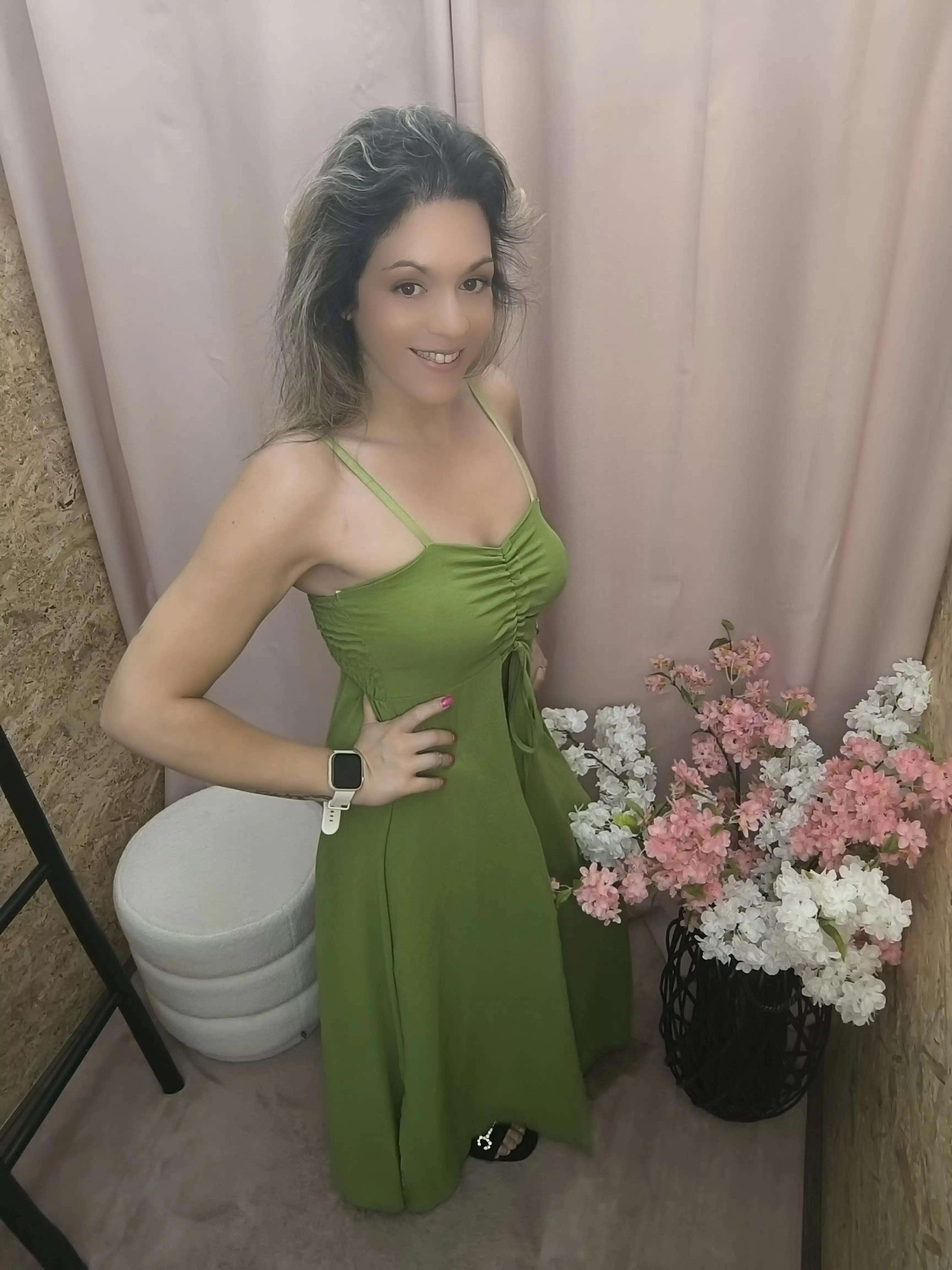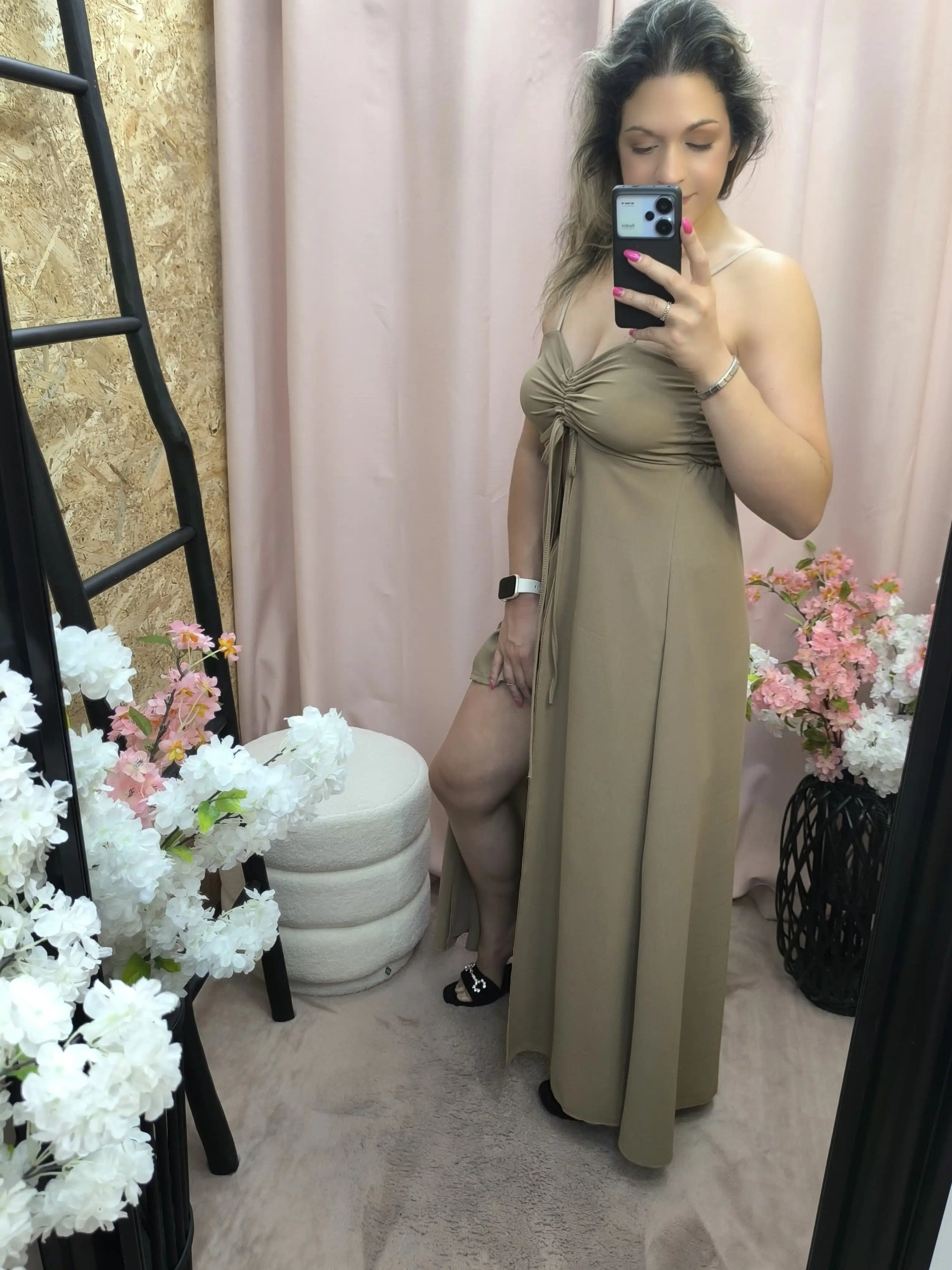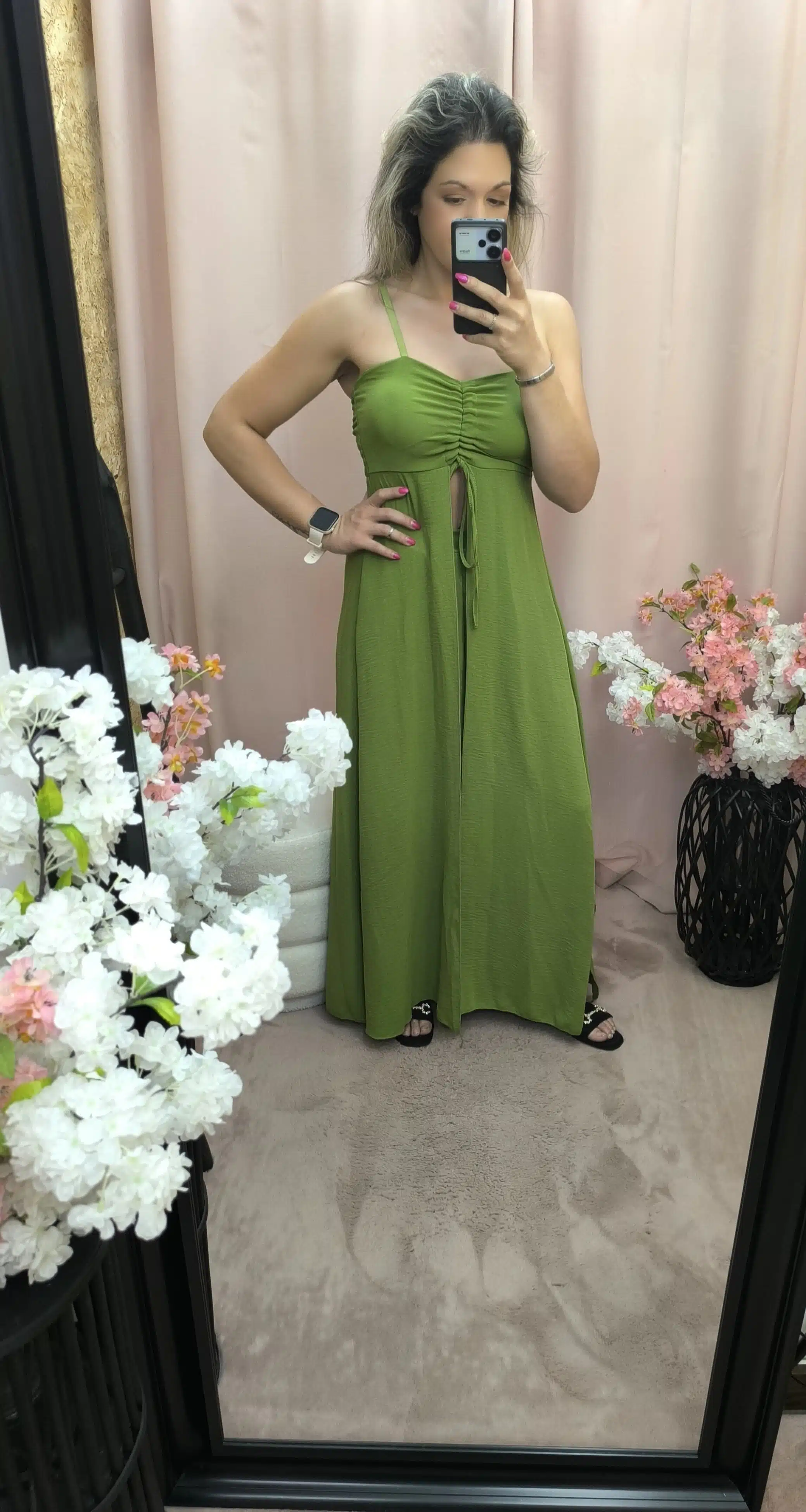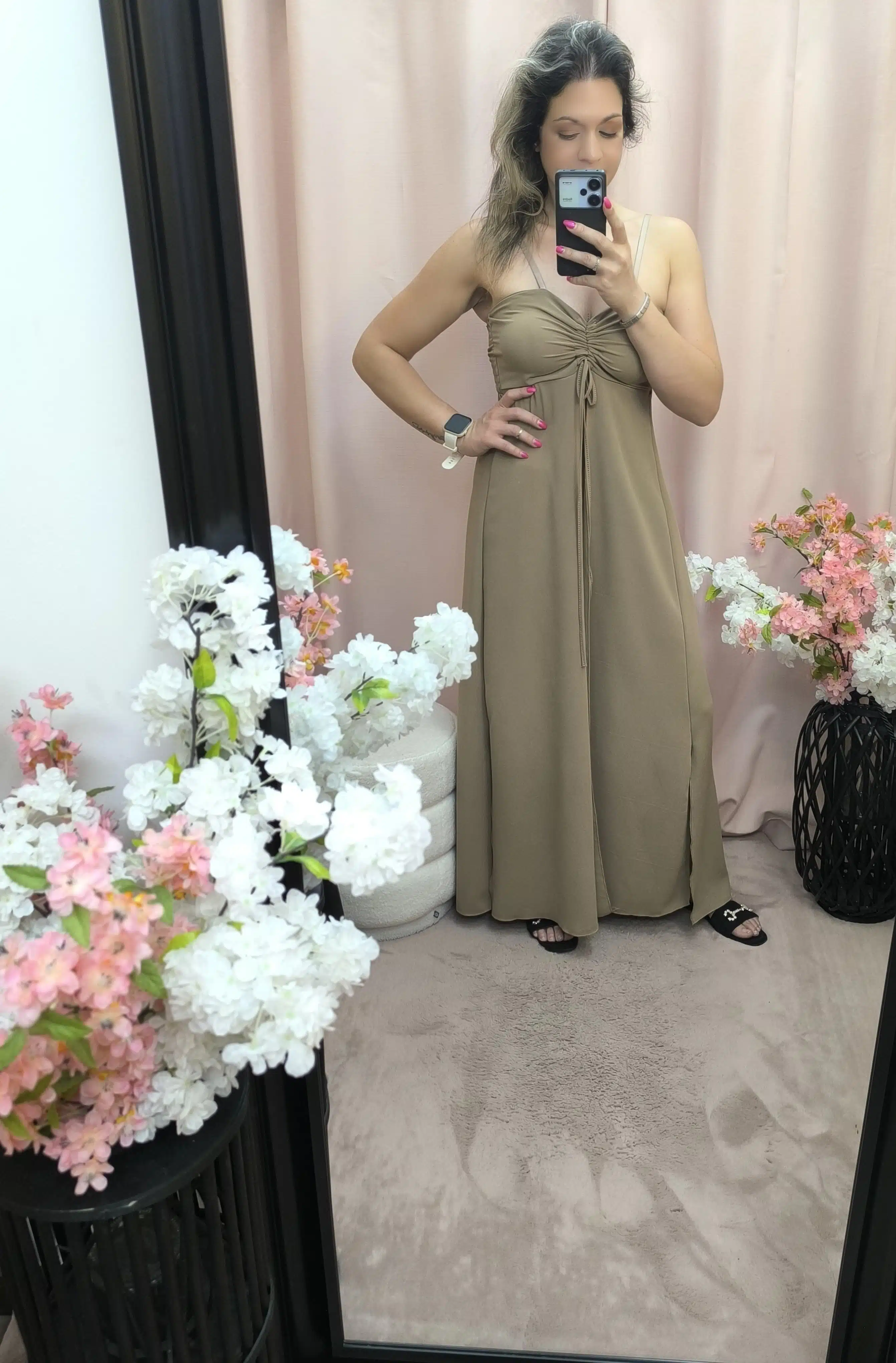Além disso, o top com alças finas ajusta-se suavemente ao corpo, apresentando um detalhe franzido no busto e uma amarração frontal que permite regular a profundidade do decote. Já a fluidez da parte inferior proporciona movimento e leveza, criando uma silhueta que favorece diferentes tipos de corpo. O recorte subtil confere, por sua vez, um toque moderno e ousado, sem perder a classe.
