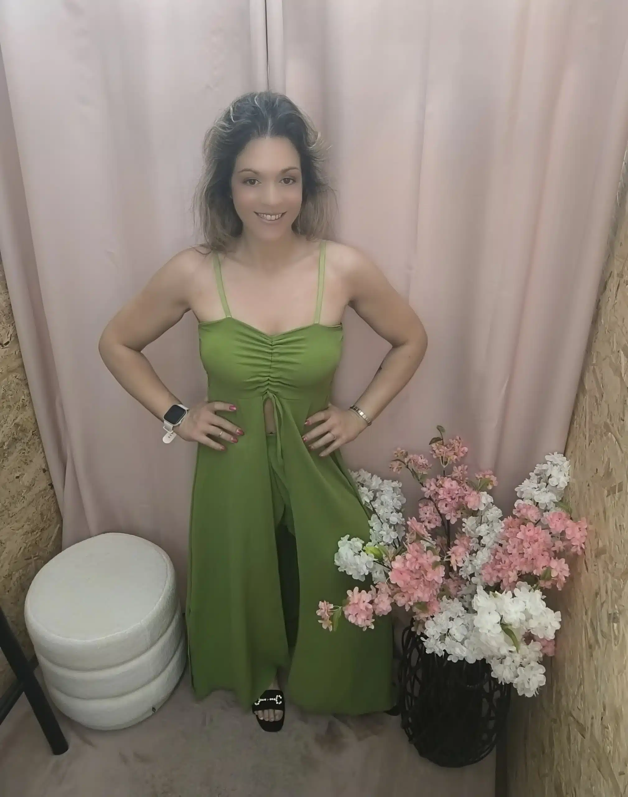 Conjunto Elegante de Verão com corte fluido e tecido leve, disponível em verde e bege. Tamanho único até L. Um look feminino e versátil para aproveitar os dias mais quentes com estilo.