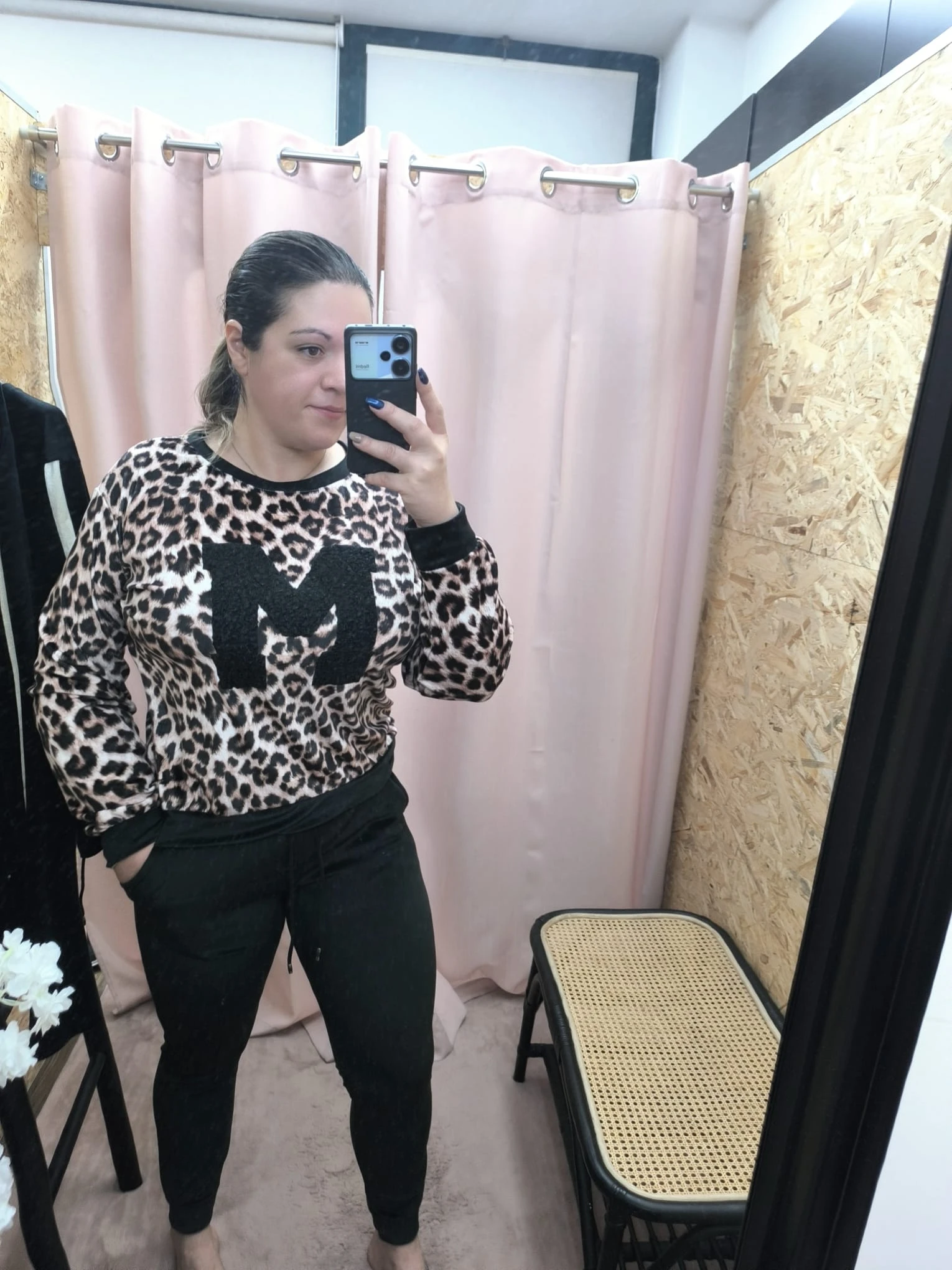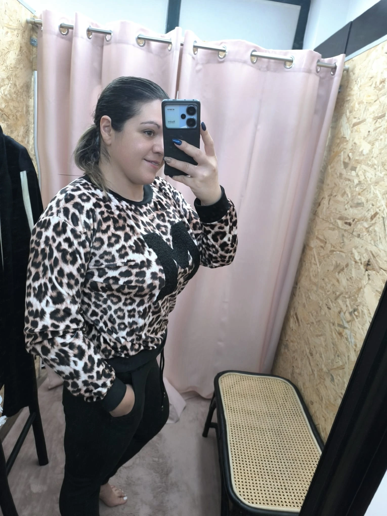 Este fato de treino de veludo tem um design vibrante e marcante, com um padrão animal print que confere um toque de ousadia e estilo. O detalhe da letra “M” em relevo na parte frontal adiciona personalidade e um charme desportivo. A parte inferior, com calças de corte ajustado, proporciona conforto sem comprometer a silhueta, sendo ideal para o uso casual no dia a dia. O tecido de veludo macio oferece um toque suave na pele, garantindo que o conjunto seja tão confortável quanto estiloso. Sendo de tamanho único, adapta-se até ao tamanho XL, favorecendo diferentes tipos de corpos.