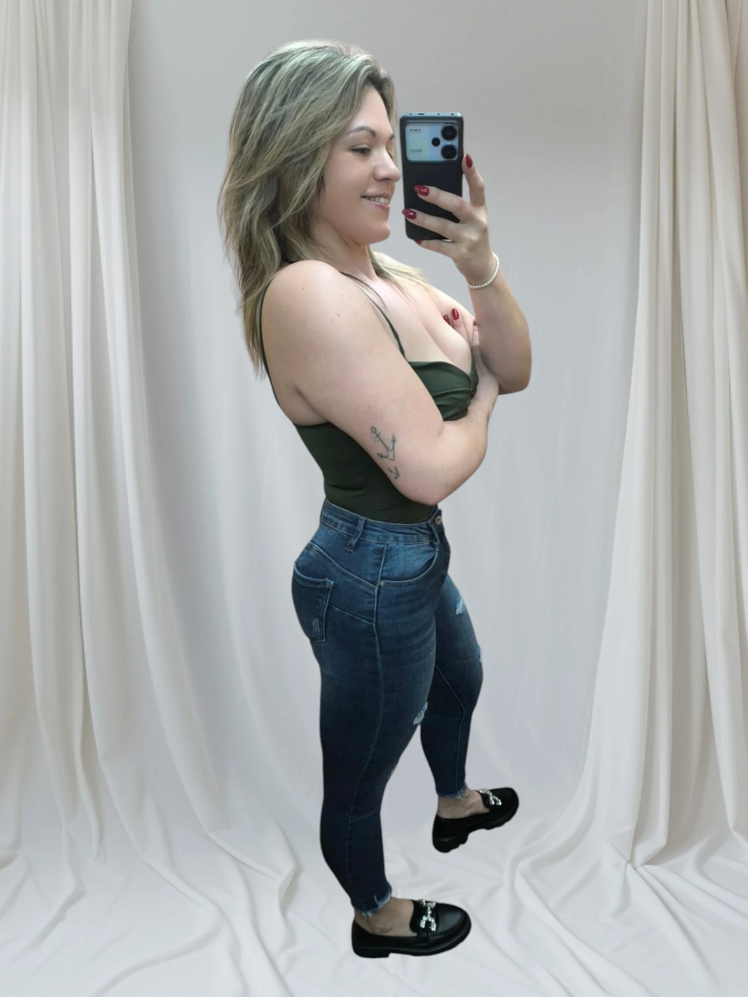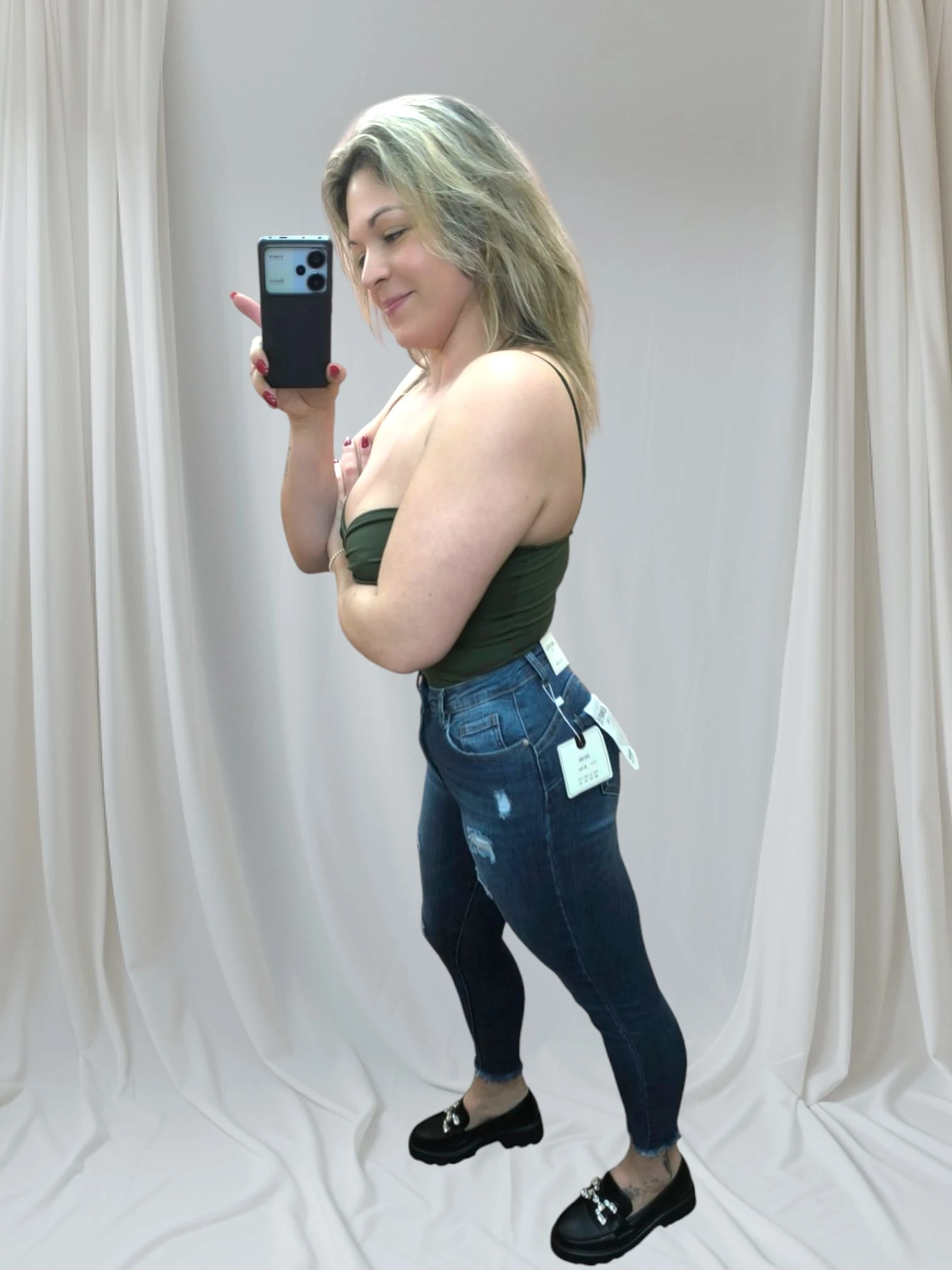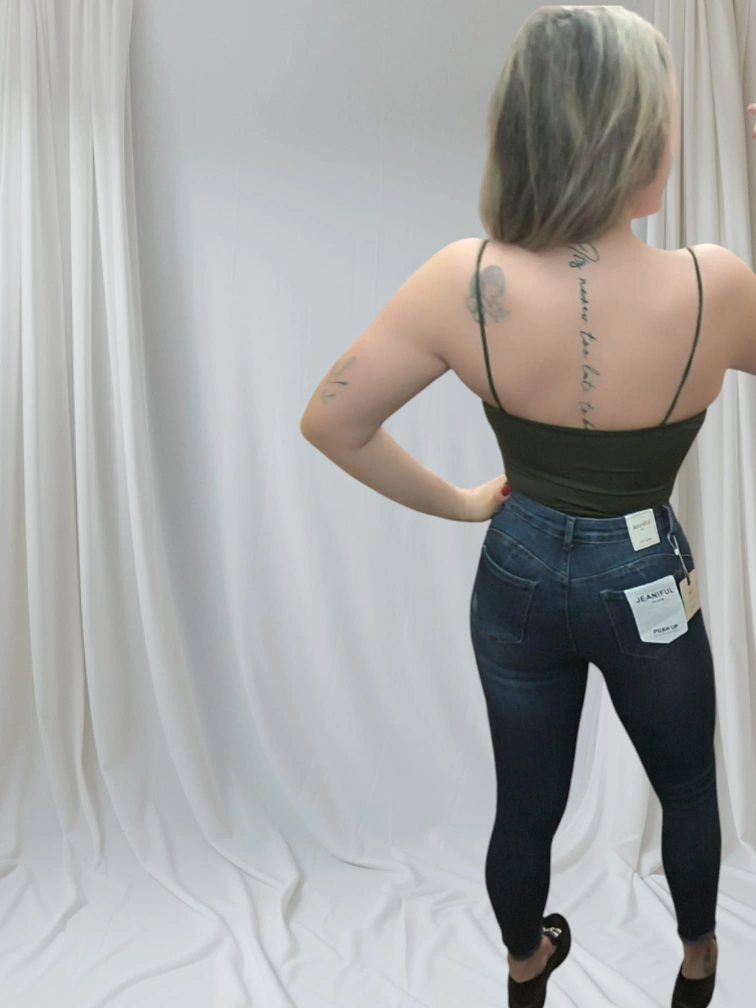Em suma, este jeans não é apenas bonito, mas também funcional e confortável. Se valorizas peças que te façam sentir segura, bonita e confiante, o Jeans Modelador Push-Up é uma adição indispensável ao teu guarda-roupa. Apostar nele é investir num visual moderno, versátil e cheio de atitude.