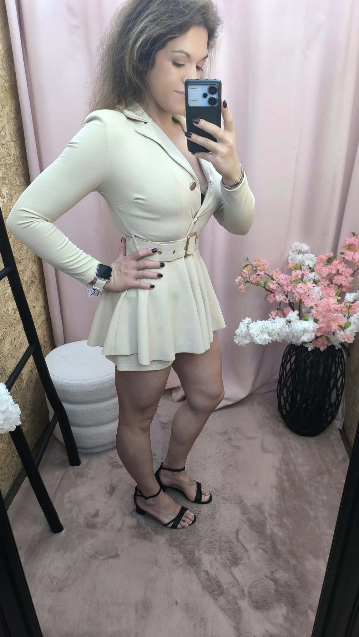 Antes de mais, a parte superior destaca-se pelo decote profundo em “V”, que valoriza o colo com elegância e equilíbrio. Além disso, o colarinho estruturado, estilo blazer, confere um ar refinado e poderoso à peça. Os botões dourados na frente não só acrescentam um charme especial, como também reforçam o toque clássico.