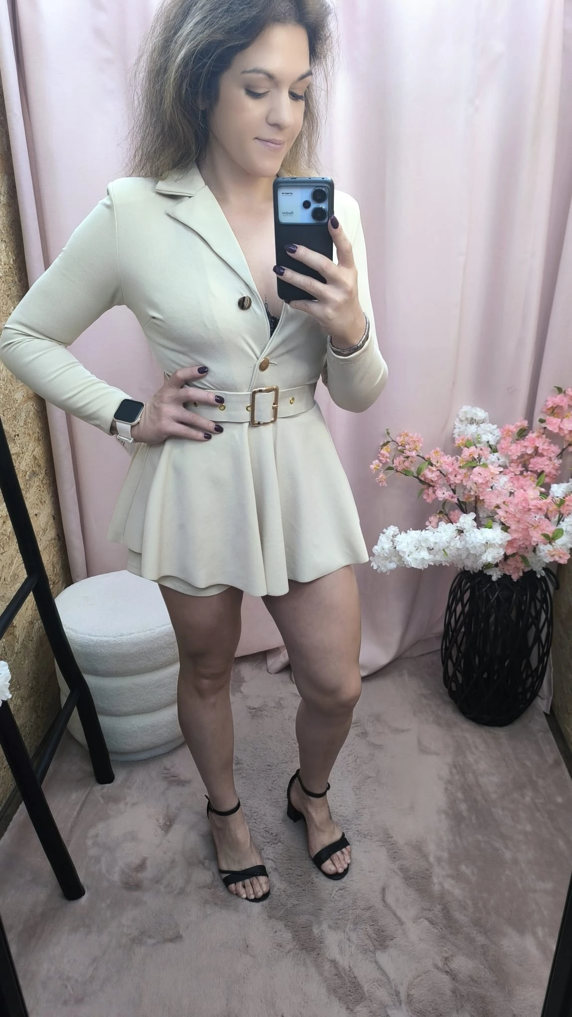 Por outro lado, a parte inferior do Macacão Femme Power apresenta um corte levemente rodado, semelhante a uma saia curta. Esta característica oferece fluidez ao movimento e suaviza o visual, o que garante um equilíbrio perfeito entre estrutura e feminilidade. Para além disso, o cinto com fivela ajustável ajuda a definir a cintura, assegurando um ajuste personalizado que valoriza a silhueta.