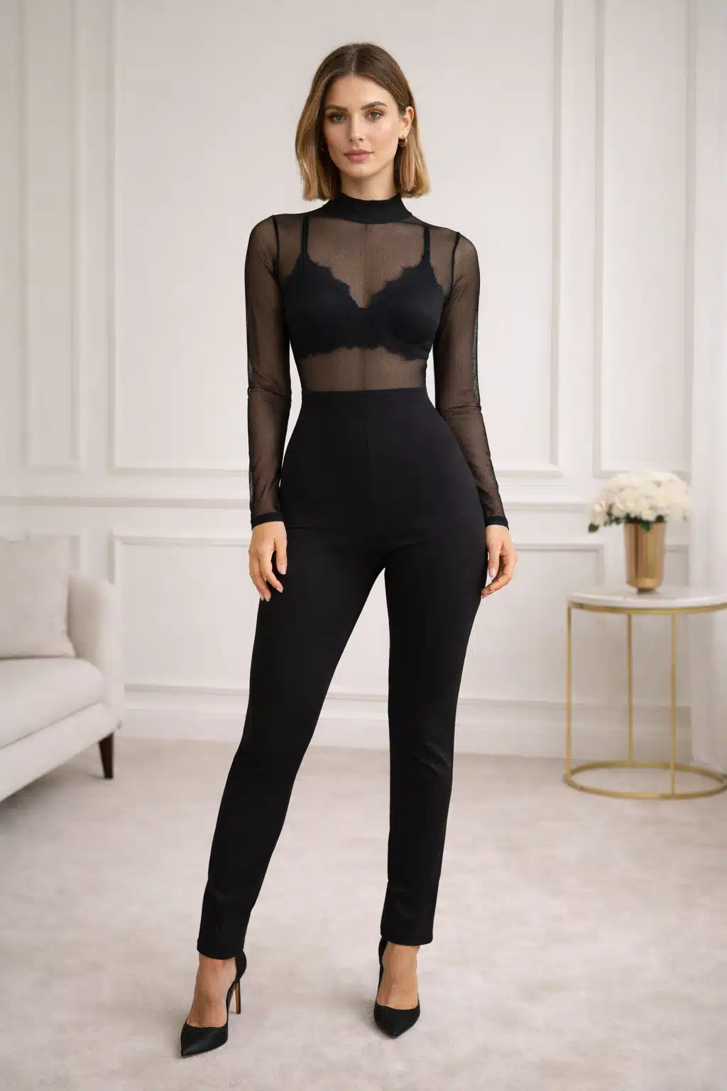 O Macacão Sedução em Renda é a peça ideal para quem procura sofisticação e ousadia num único look. Desde logo, o seu design moderno destaca-se pela combinação da transparência delicada em tule com um sutiã rendado incorporado. O resultado é um visual refinado, feminino e cheio de charme.
