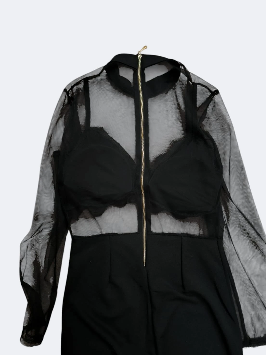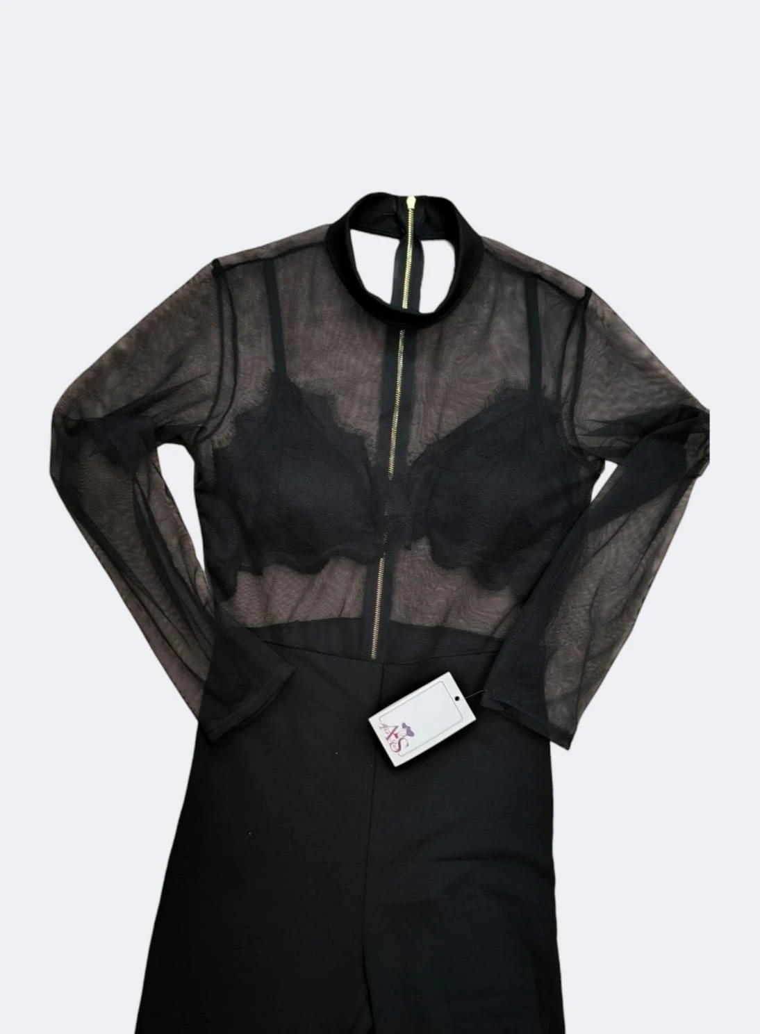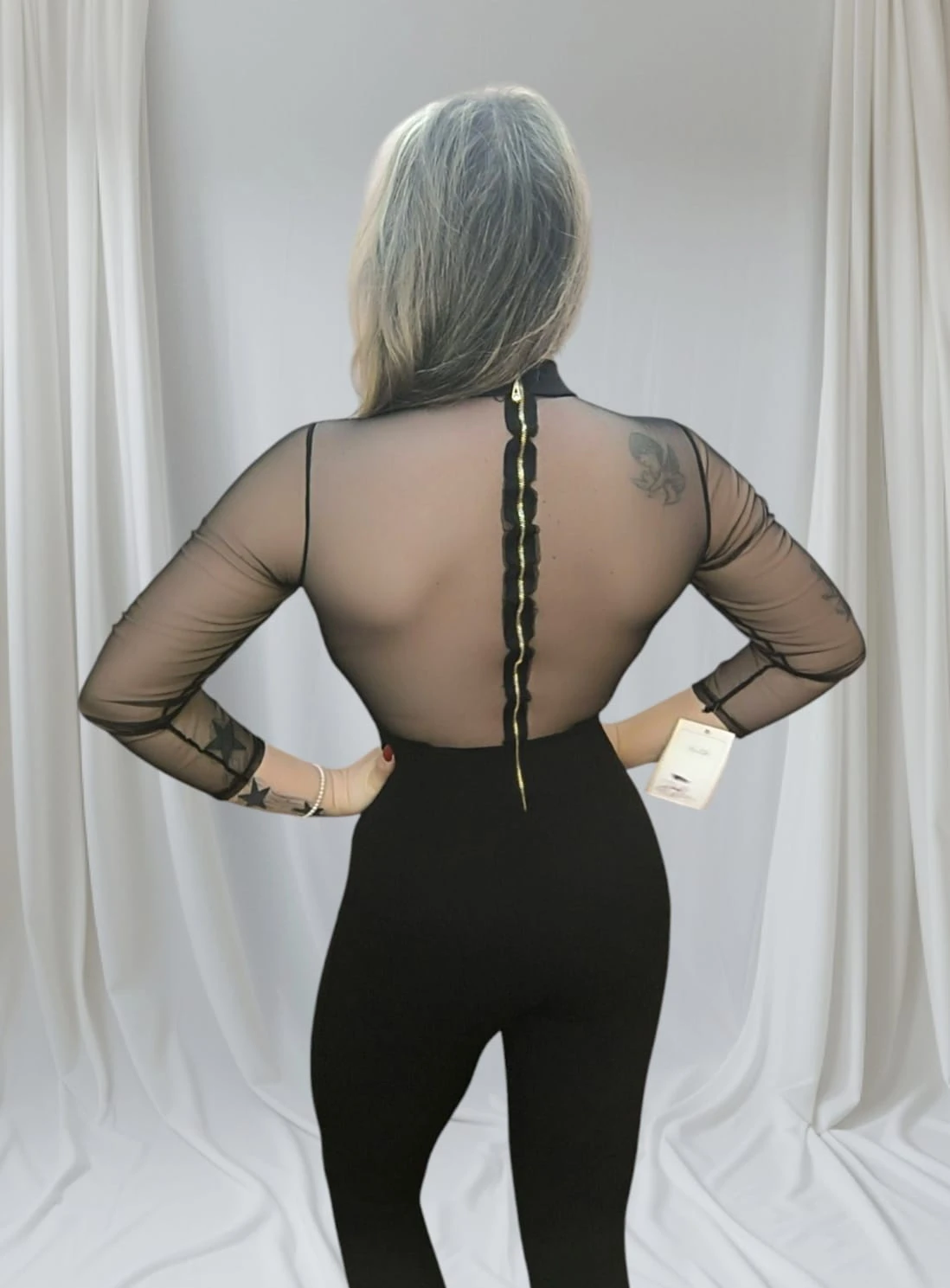 A sua modelagem ajustada valoriza e realça a silhueta, enquanto a parte superior, em tecido transparente acrescenta um toque sofisticado e cria um contraste elegante e sofisticado. O detalhe nas costas adiciona um toque de ousadia, tornando esta peça ideal para ocasiões especiais ou para quem deseja destacar-se com um visual impactante.