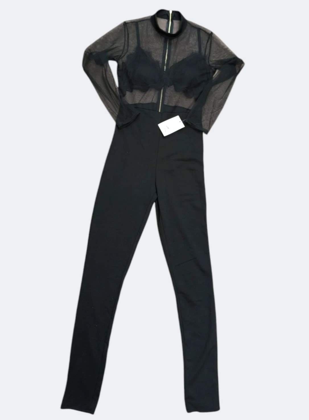 Macacão sedução em renda preto com design sofisticado, transparência em tule e sutiã rendado incorporado. Tamanho único (veste até M). Perfeito para destacar a feminilidade com elegância.