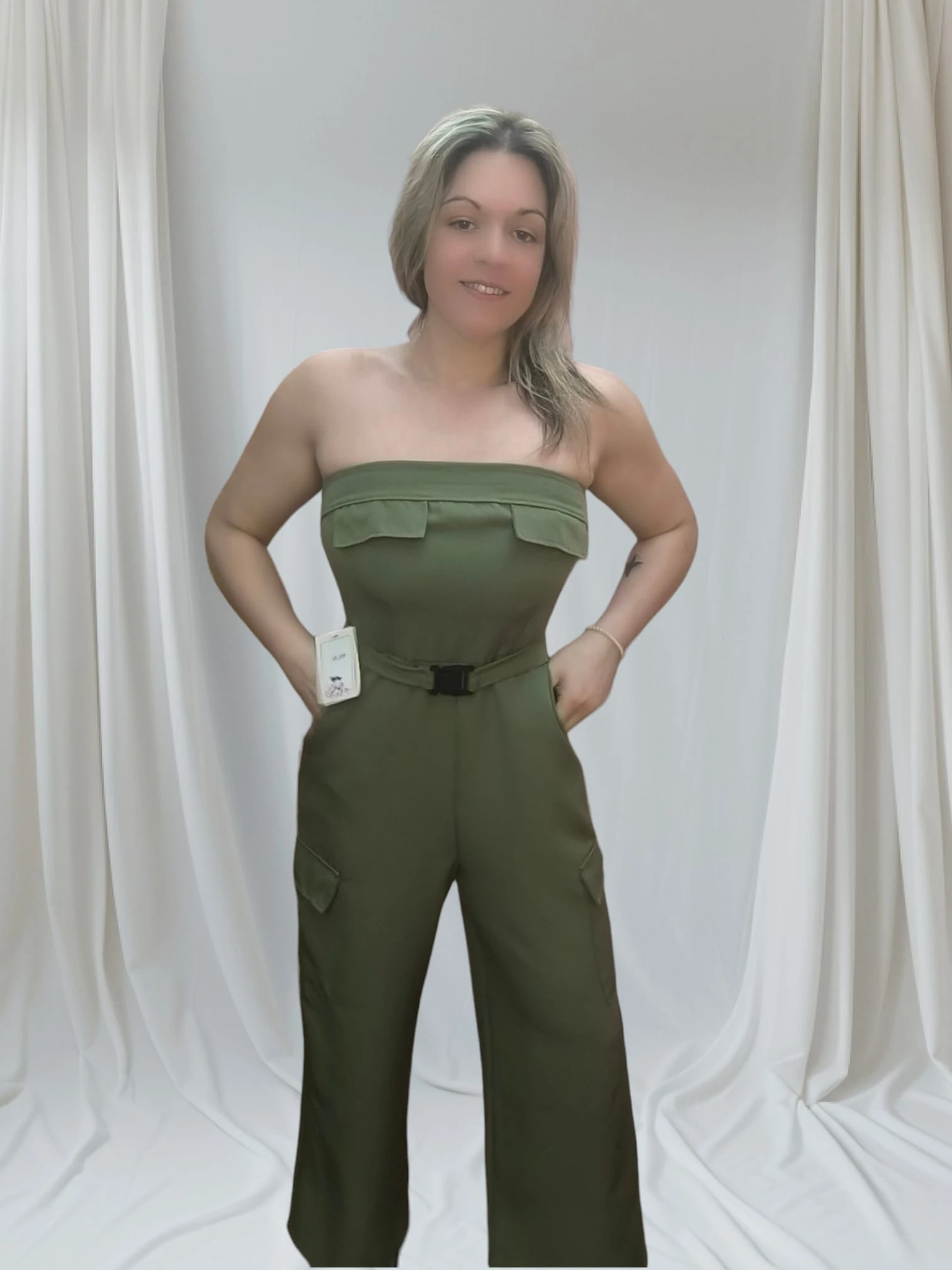 Macacão verde sem alças com cinto e bolsos. Elegante, versátil e confortável. Tamanho único (veste até L/XL).