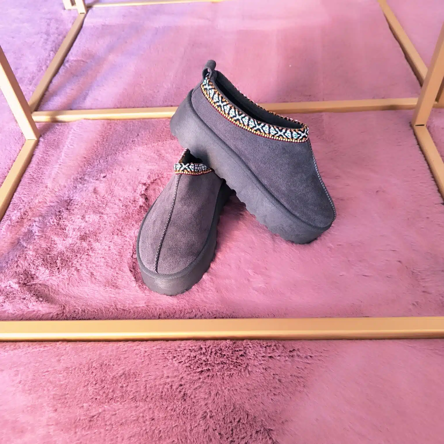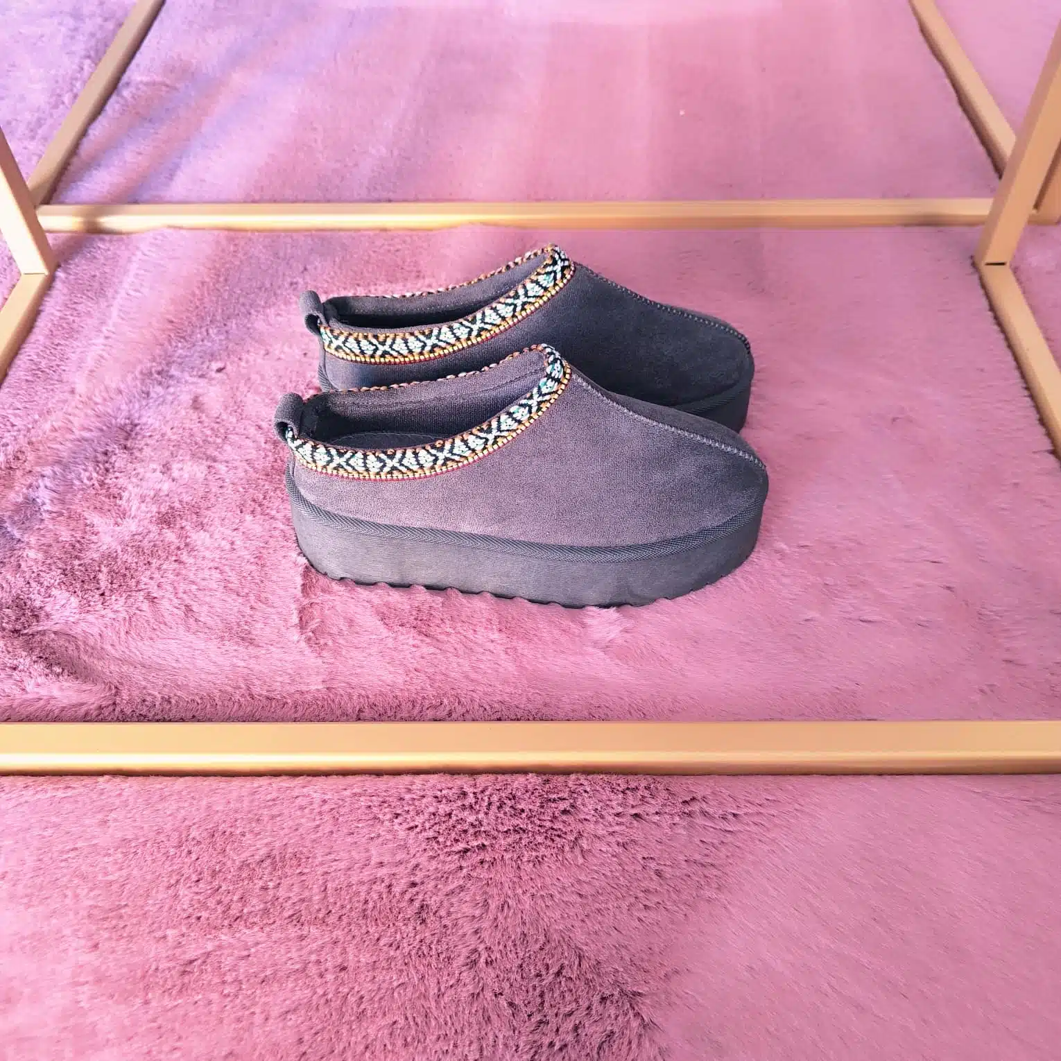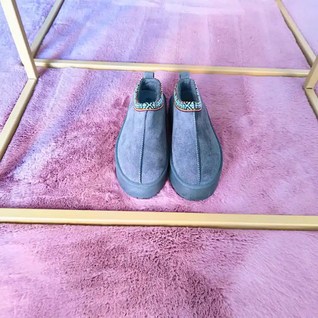 O exterior em suede cinzento cria um toque suave e elegante. Além disso, o visual clean combina facilmente com qualquer look casual de outono ou inverno. O acabamento em tom neutro reforça a simplicidade do modelo, enquanto o detalhe étnico colorido na abertura acrescenta vida ao design. Assim, o contraste entre o artesanato e o cinzento torna estas pantufas visualmente apelativas e leves.