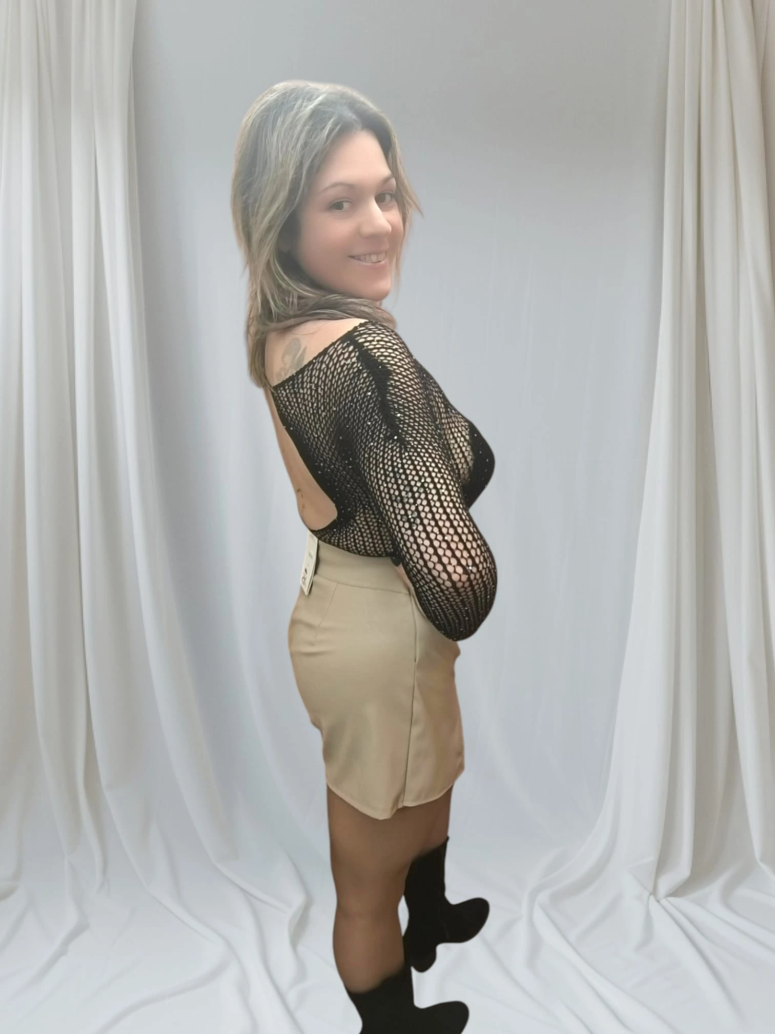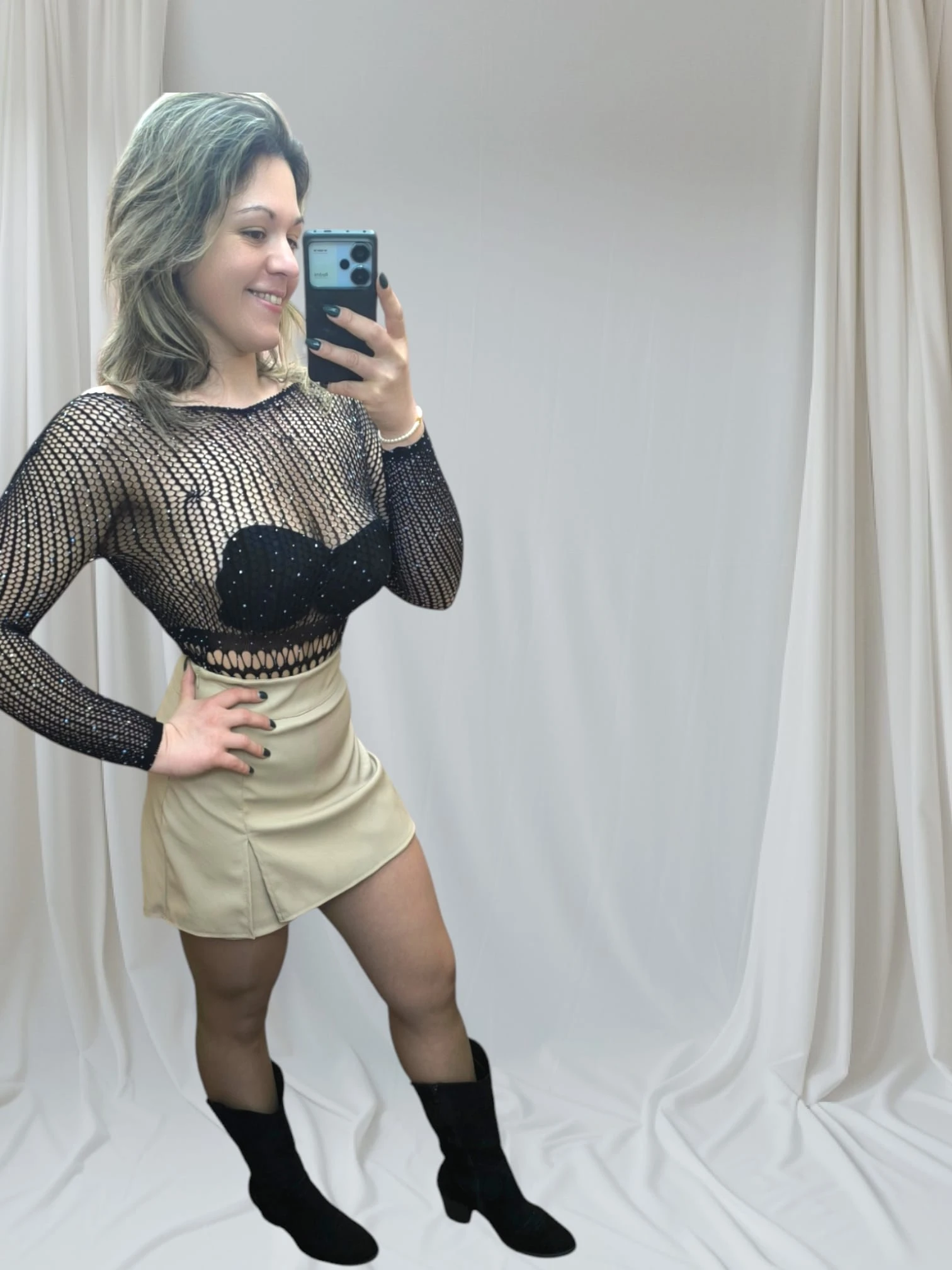 Saia/Calção Bege Cardada: Saia/calção em polipele cardado, com caimento impecável e conforto extra. Ideal para um look elegante e versátil. Disponível no tamanho M e L.