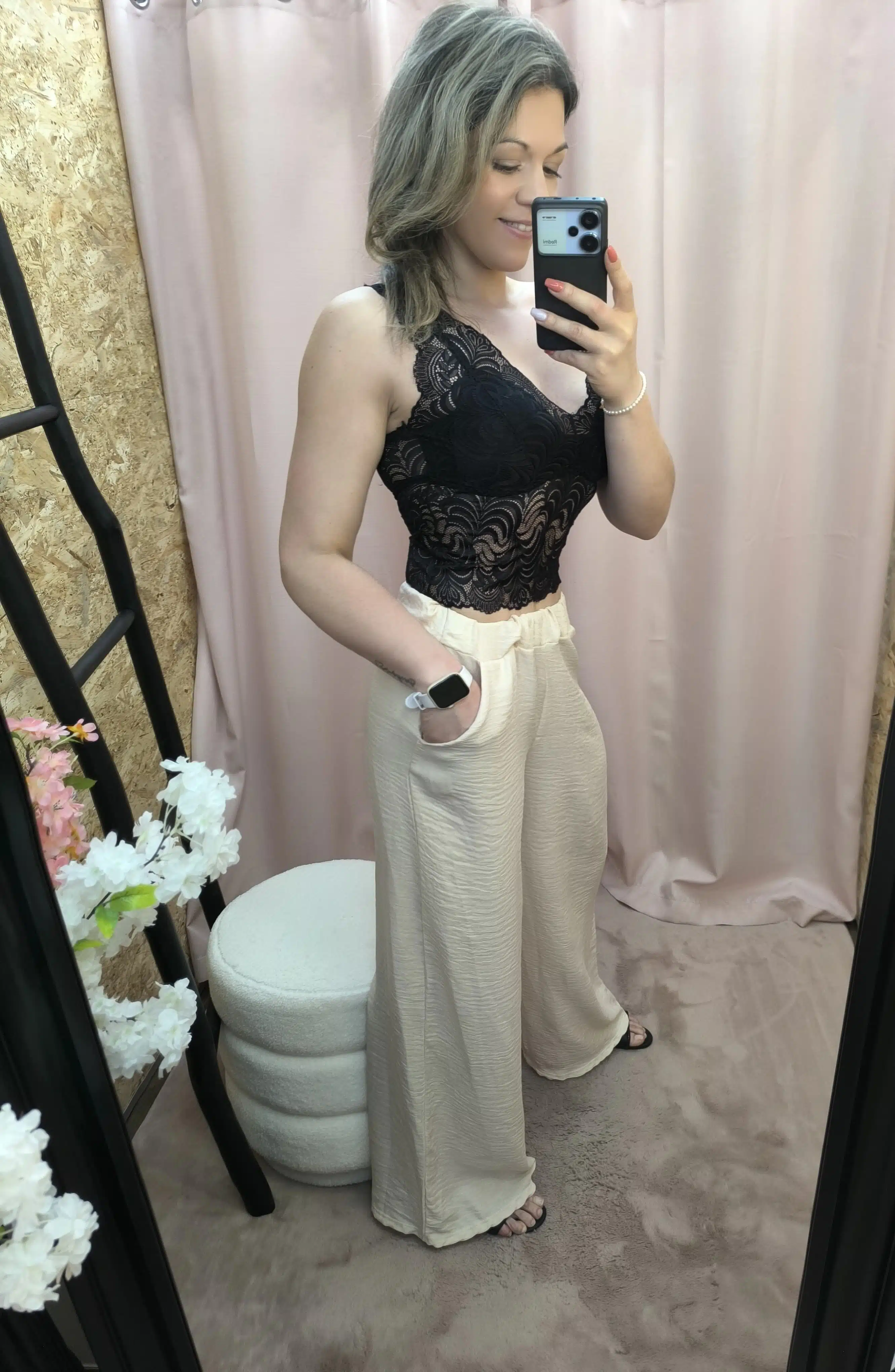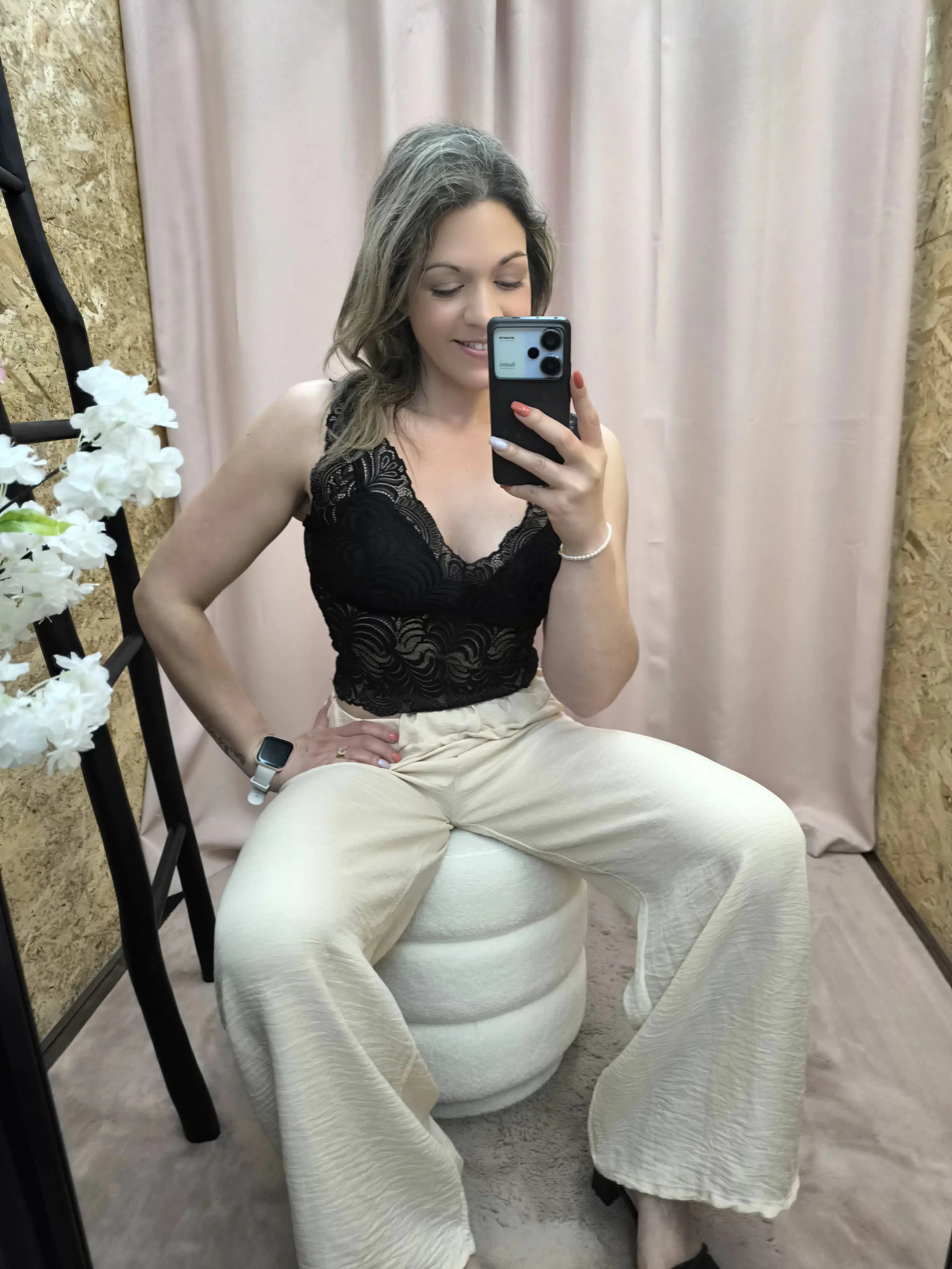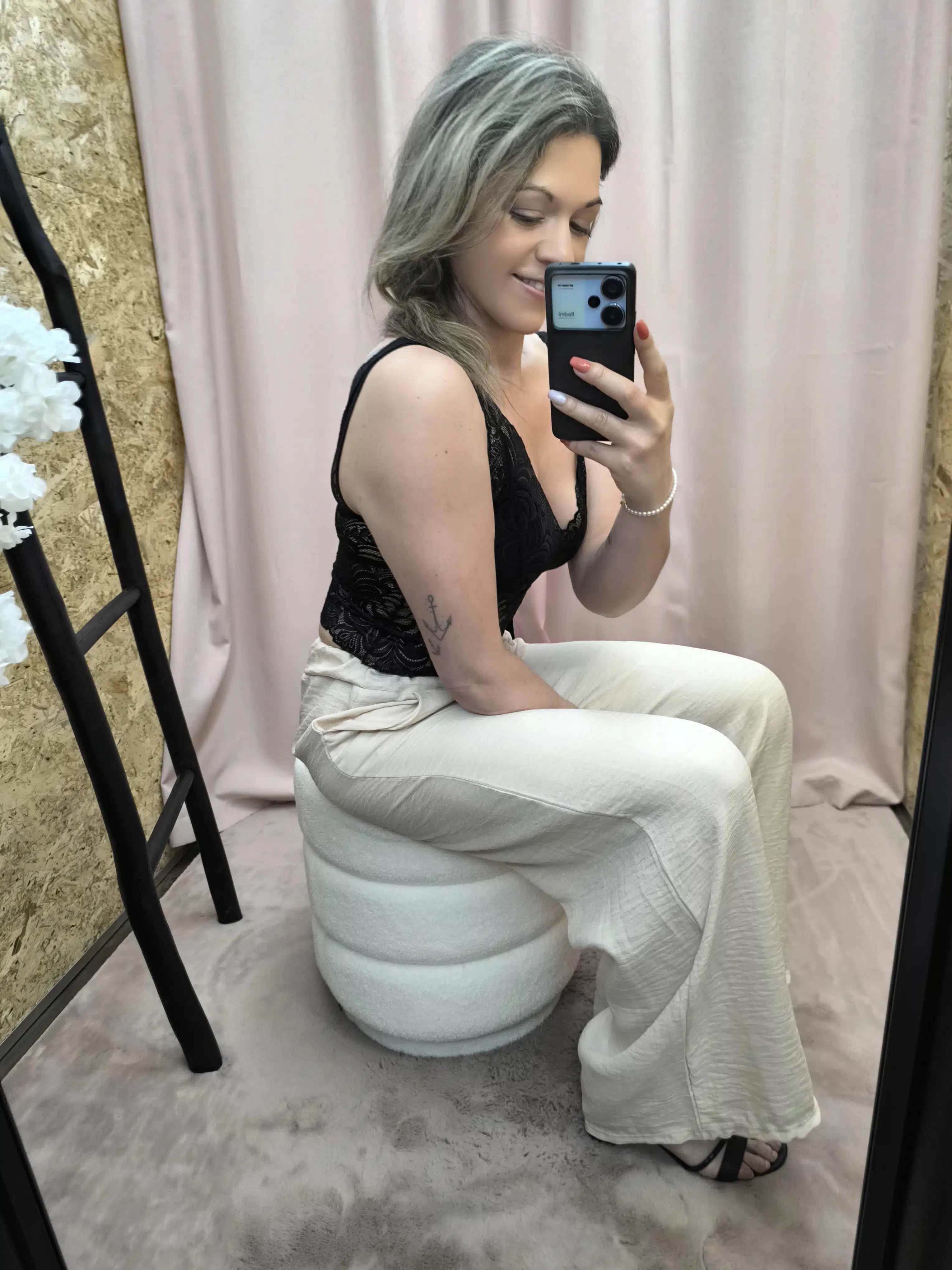 Graças ao seu corte bem estruturado, o top valoriza o busto de forma subtil, sem comprometer o conforto. A renda delicada destaca-se pelo acabamento refinado, que adiciona um toque de sensualidade discreta. Assim, consegues um look equilibrado entre o sofisticado e o casual.