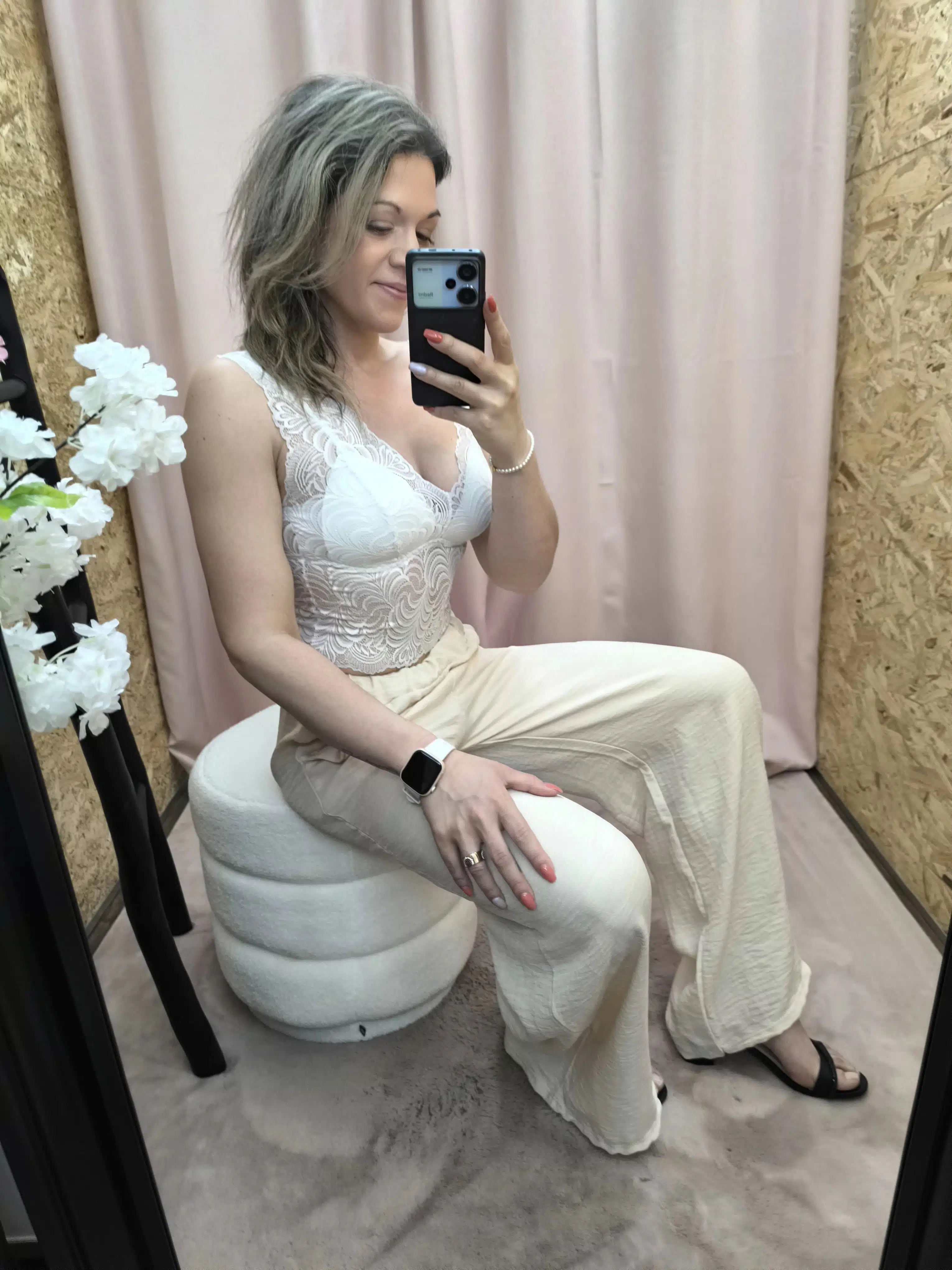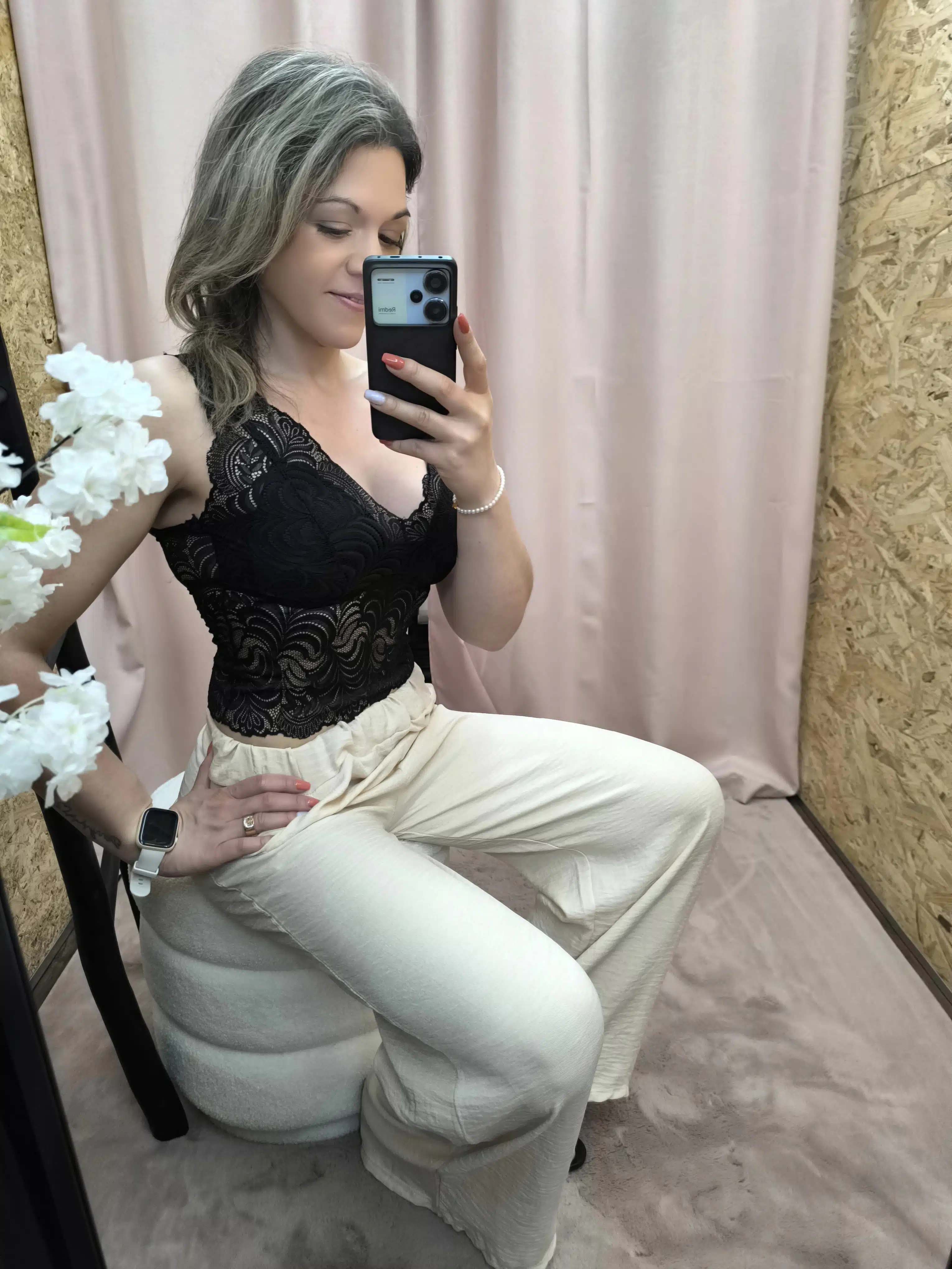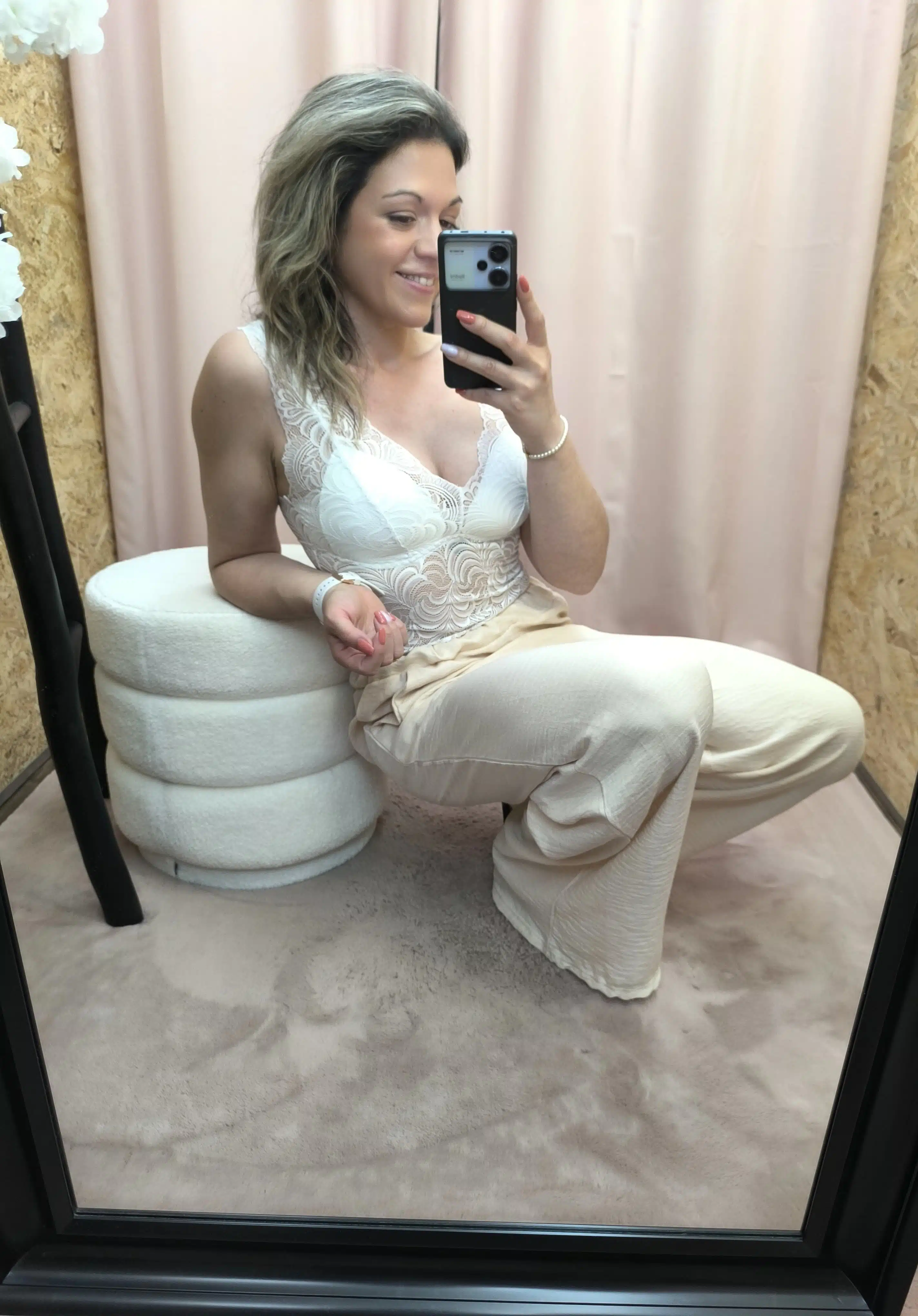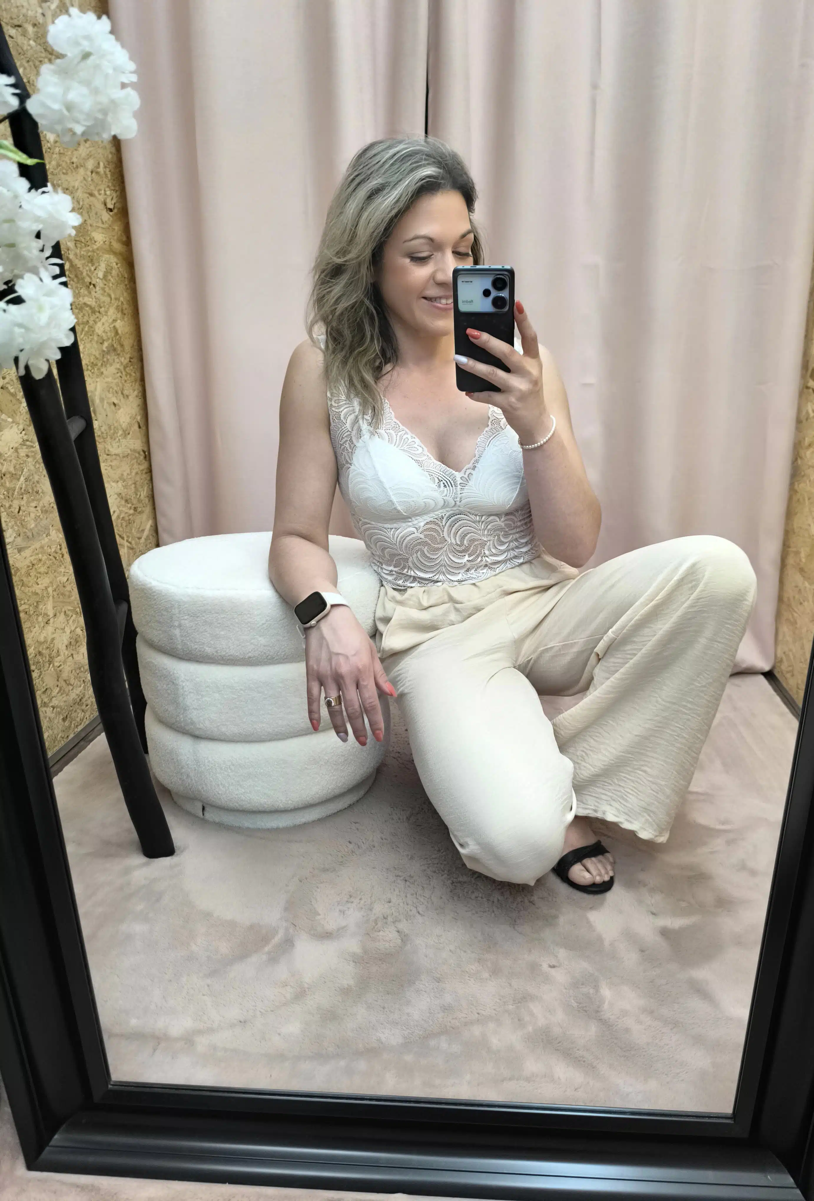 Graças ao seu corte bem estruturado, o top valoriza o busto de forma subtil, sem comprometer o conforto. A renda delicada destaca-se pelo acabamento refinado, que adiciona um toque de sensualidade discreta. Assim, consegues um look equilibrado entre o sofisticado e o casual.