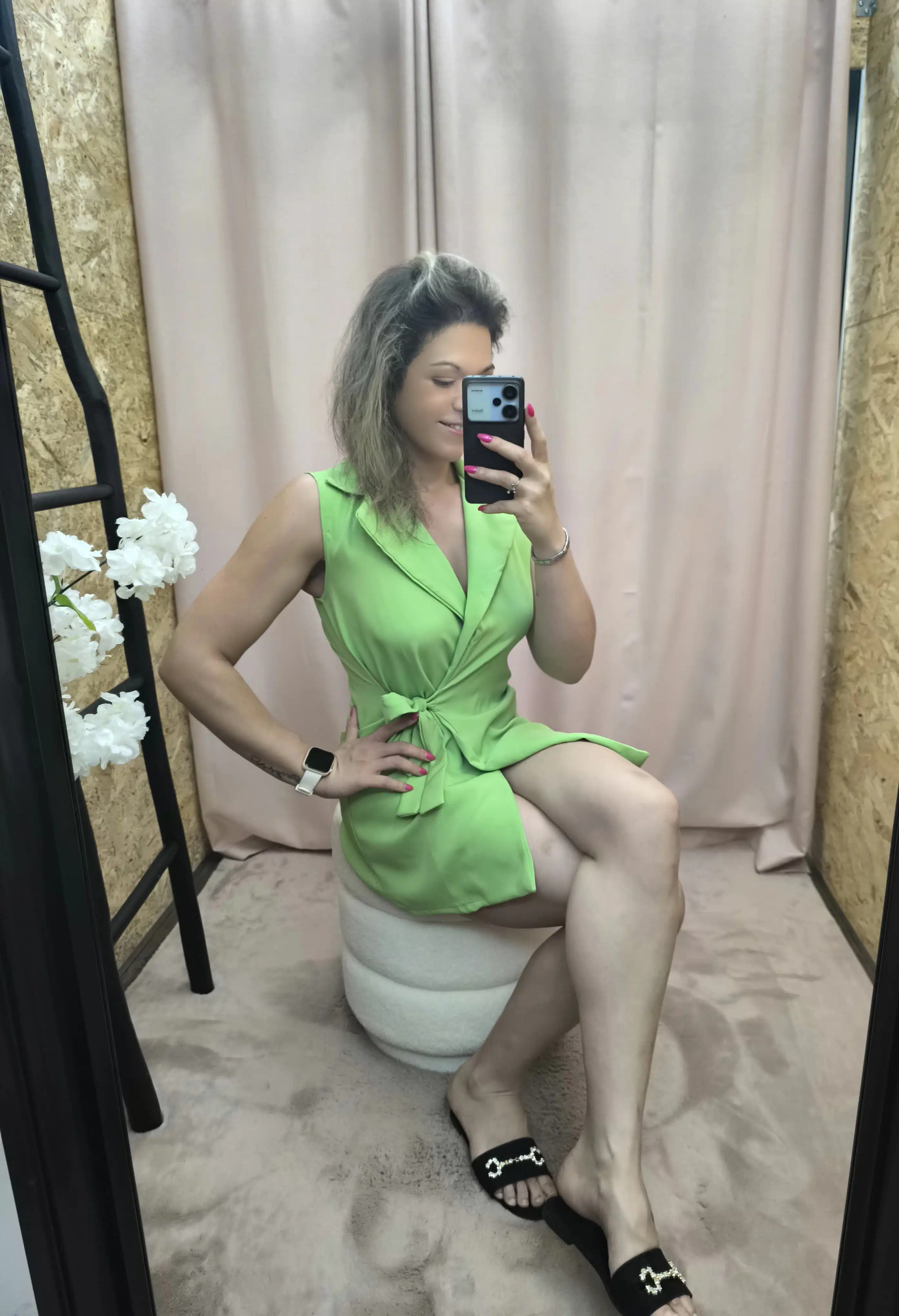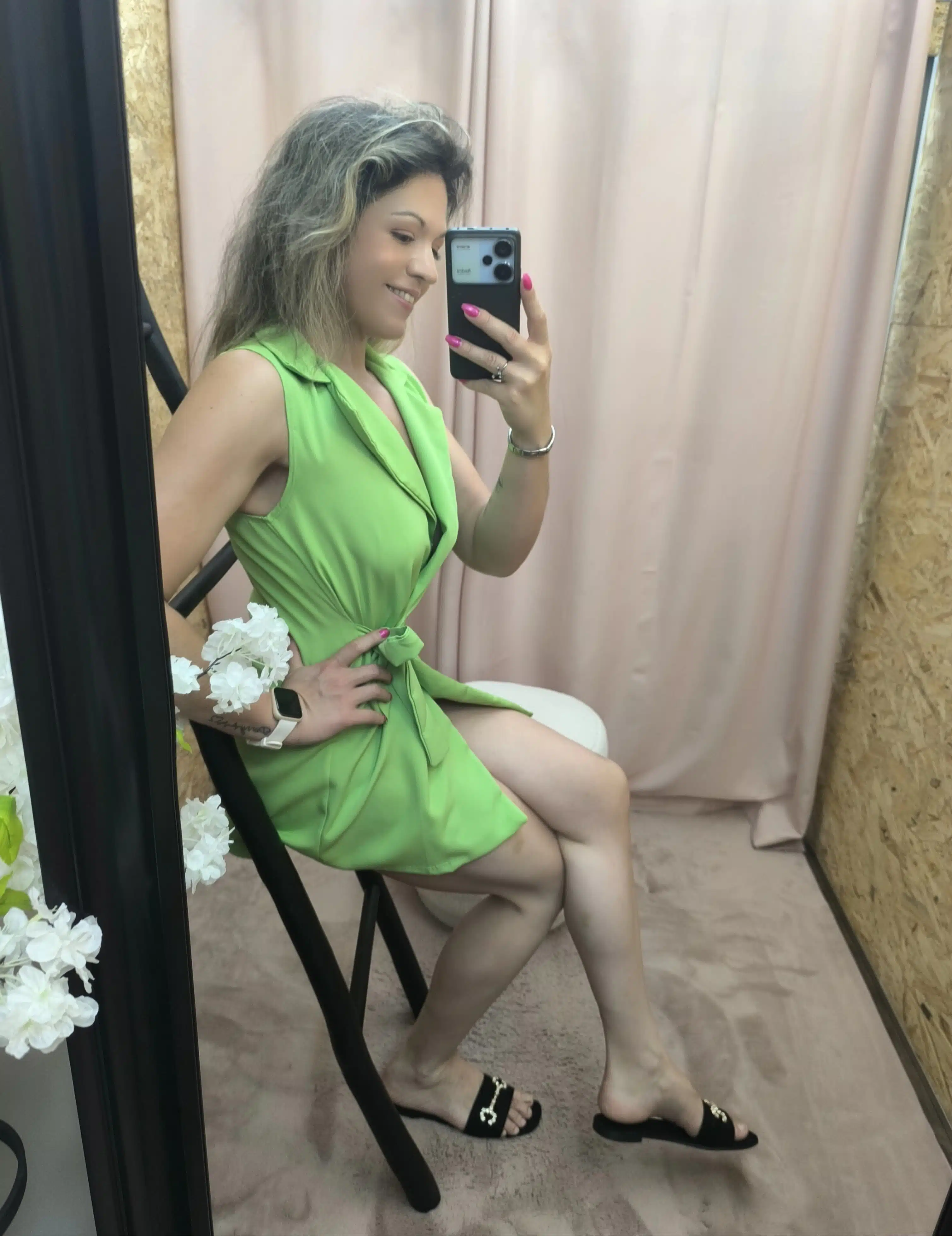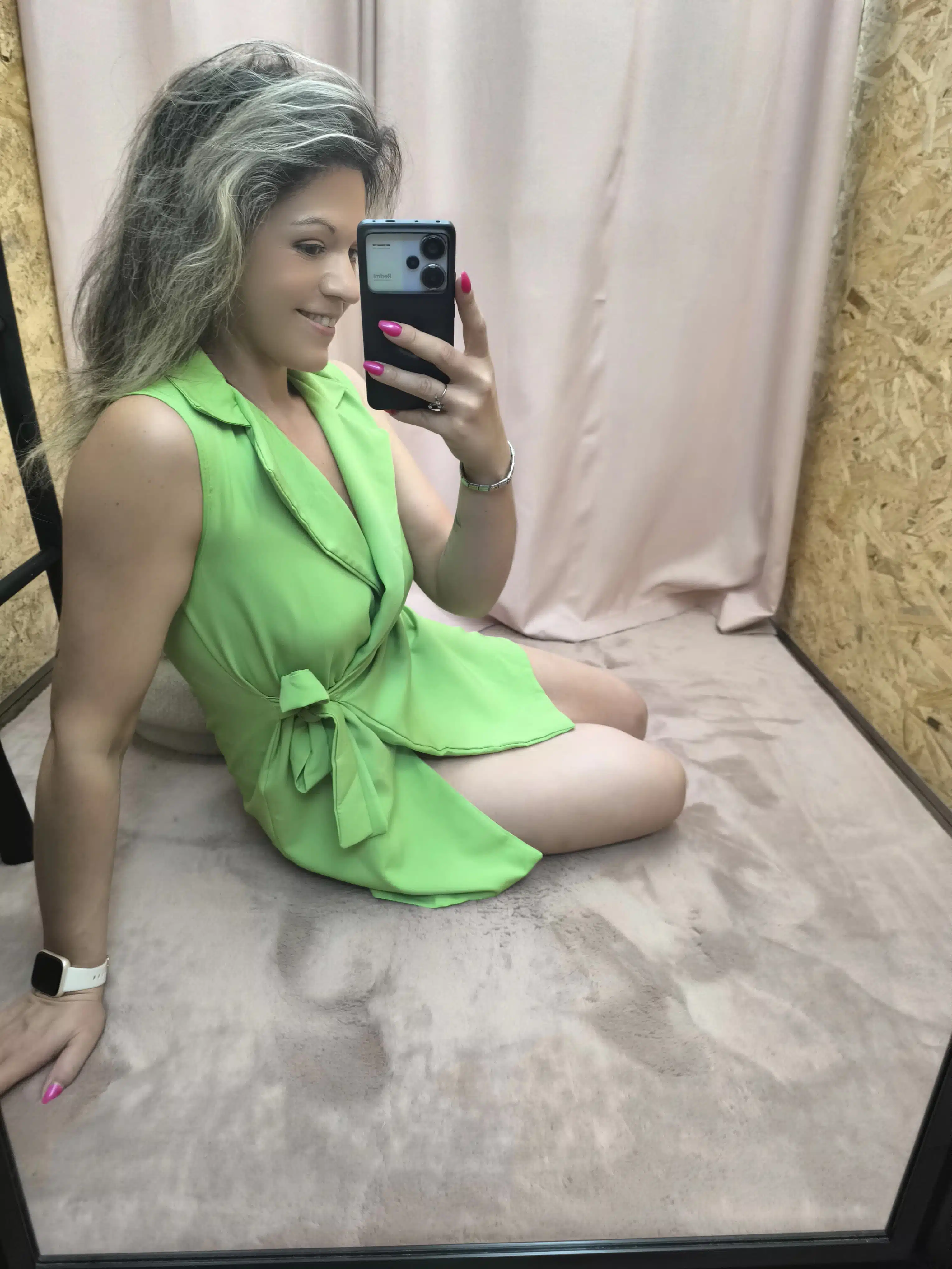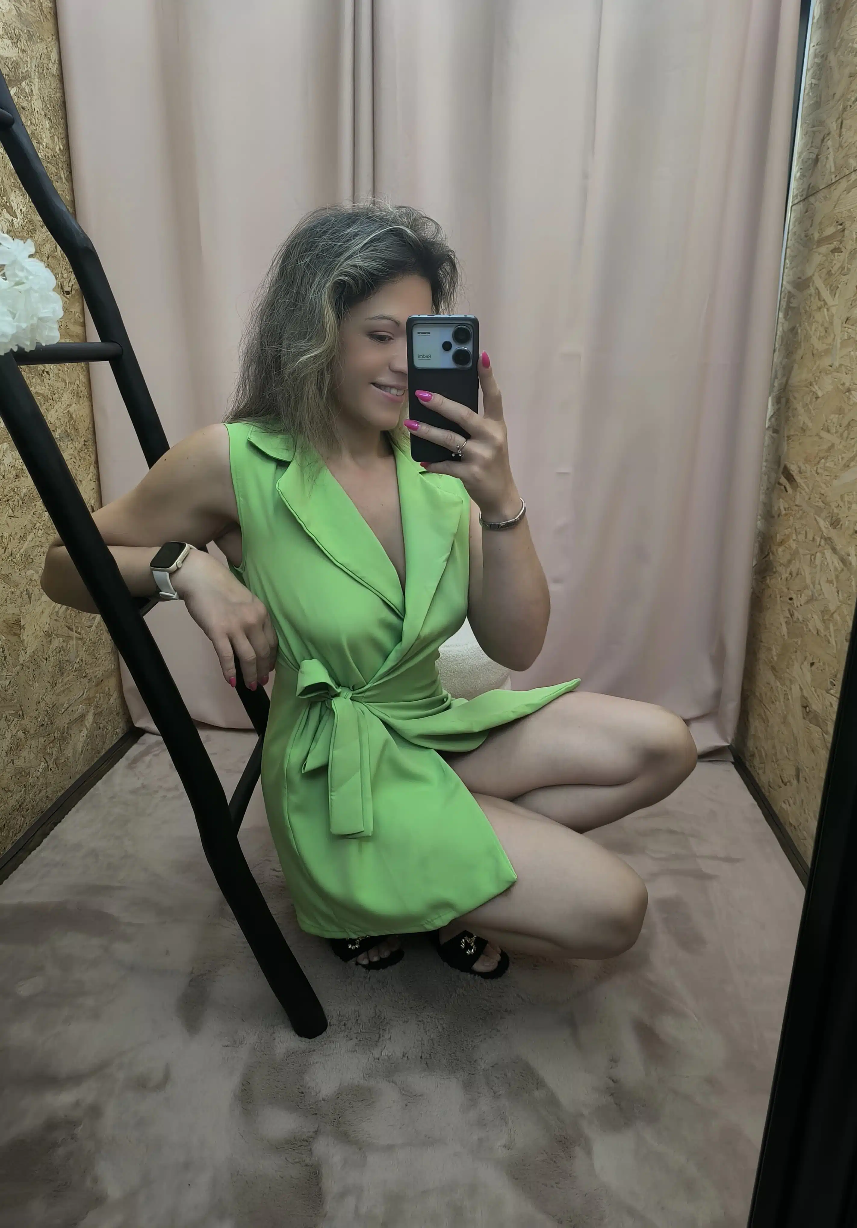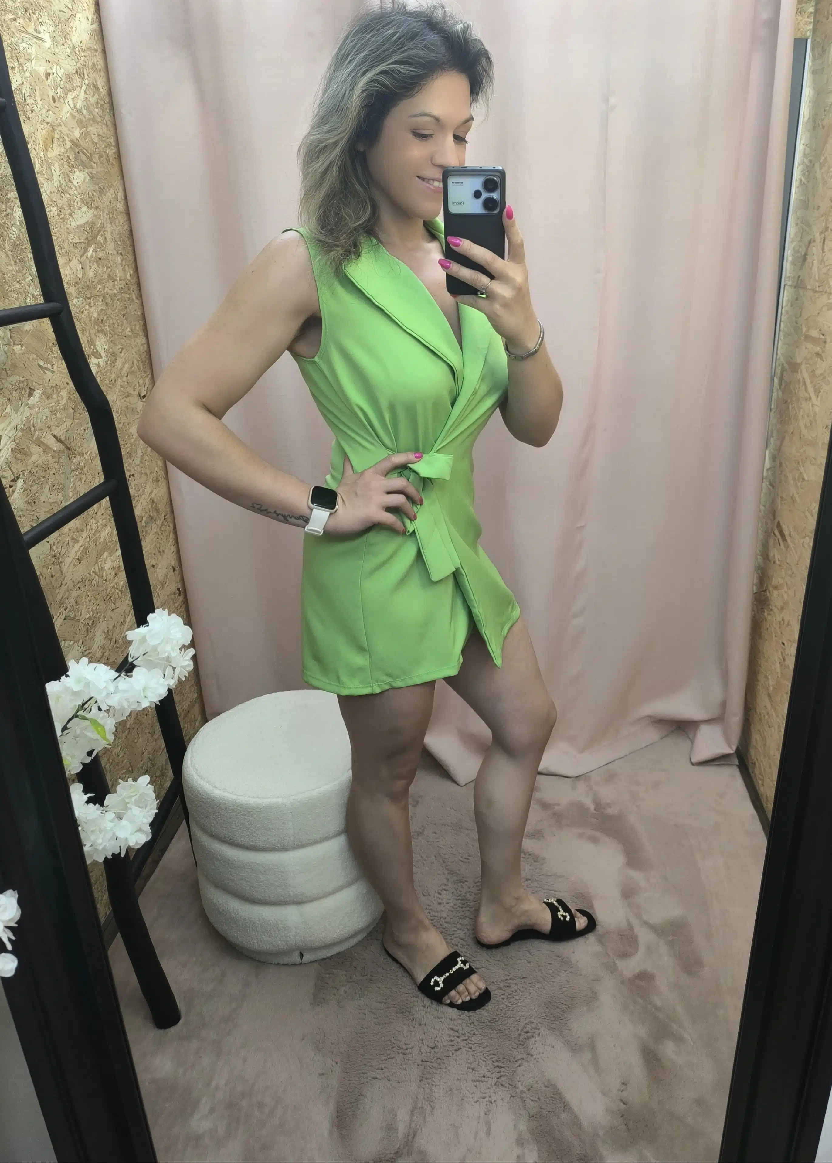 O Vestido Colete Verde Lima é uma peça statement para quem procura aliar elegância, modernidade e funcionalidade num só look. Com design inspirado na alfaiataria, apresenta lapelas marcadas, decote em V profundo e um cinto ajustável que realça a cintura, conferindo um toque feminino ao corte estruturado.