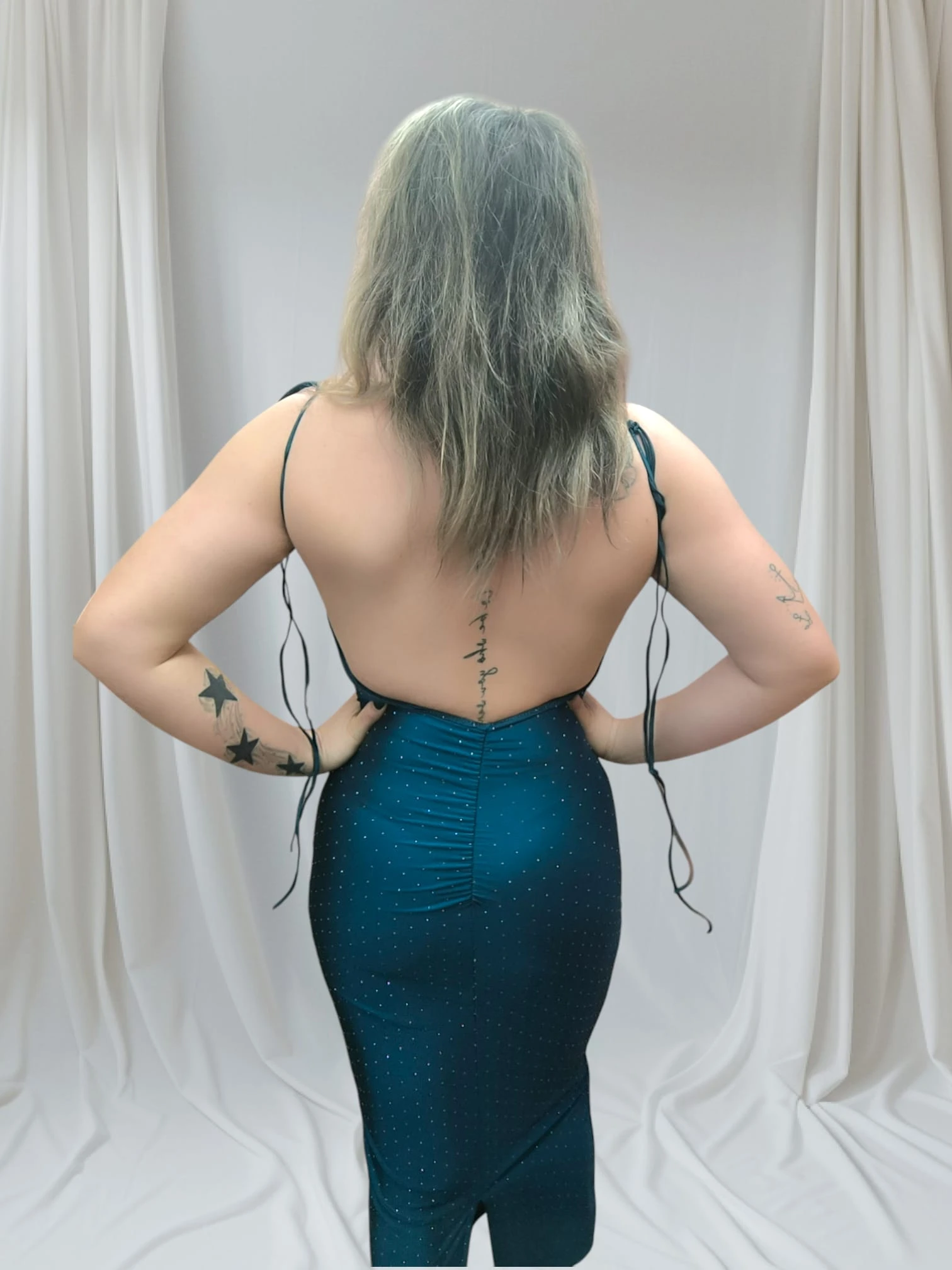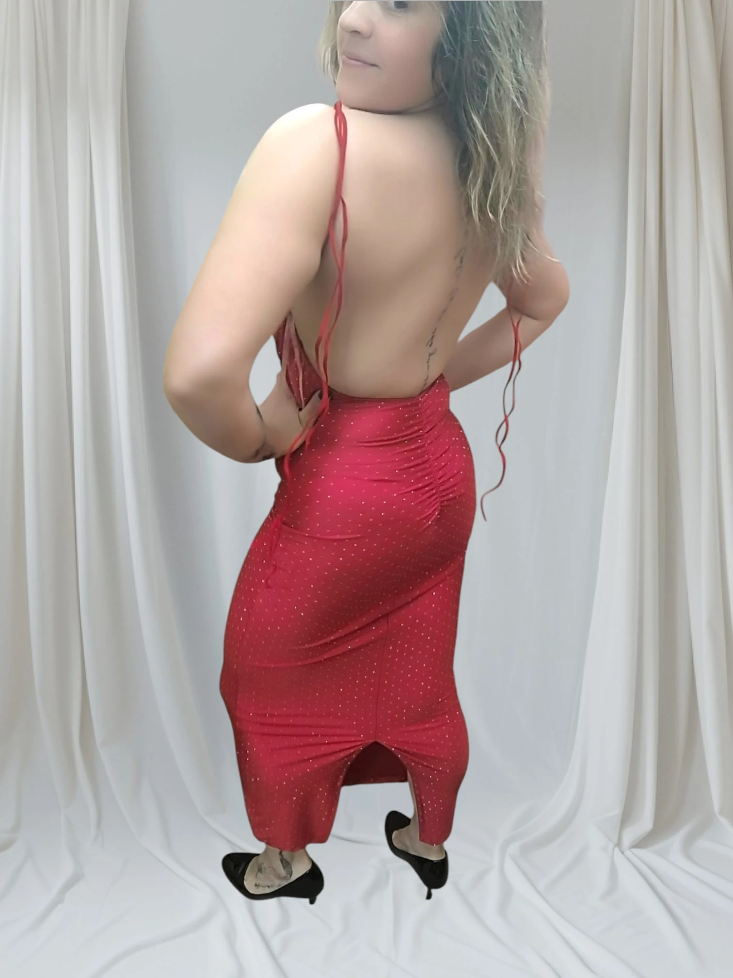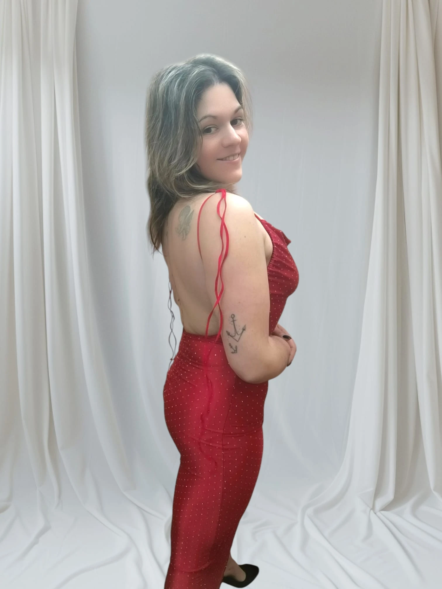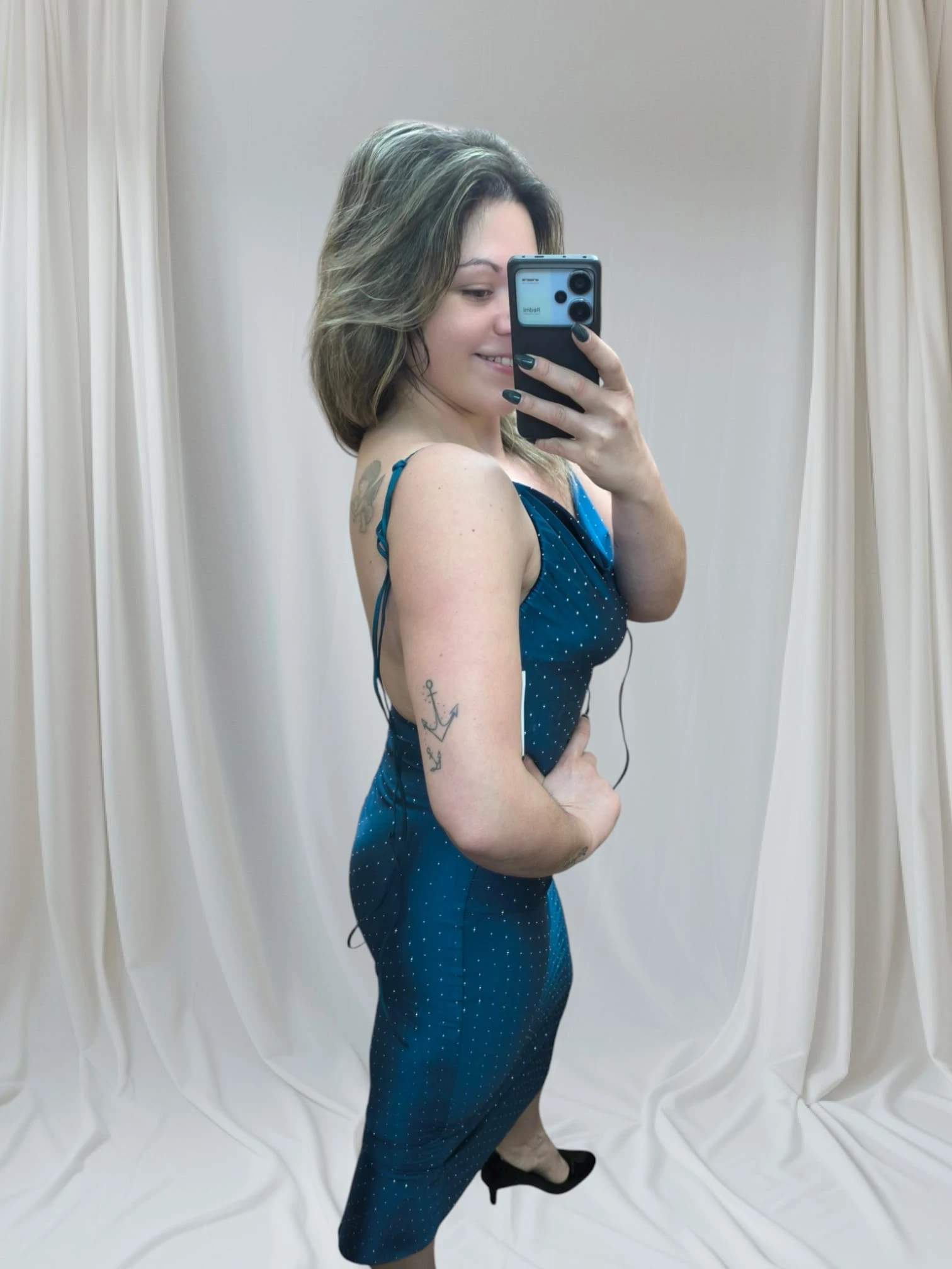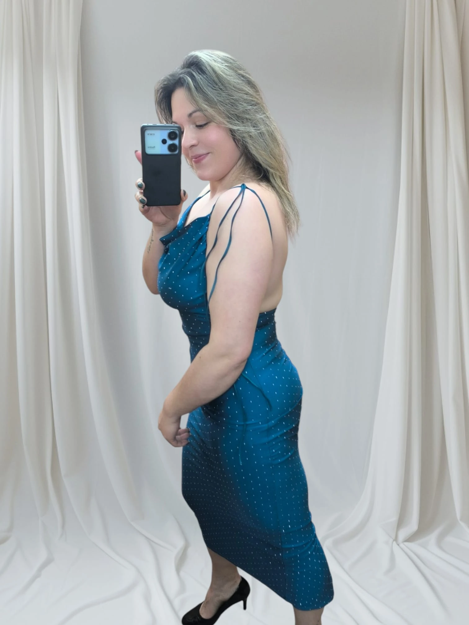 O grande destaque deste vestido está nas costas. Totalmente abertas, com amarrações delicadas, as costas tornam-se o ponto focal da peça, garantindo um ajuste perfeito e realçando a feminilidade. O tecido flexível assegura liberdade de movimento, permitindo-te dançar a noite toda em total conforto, seja em festas ou jantares românticos.