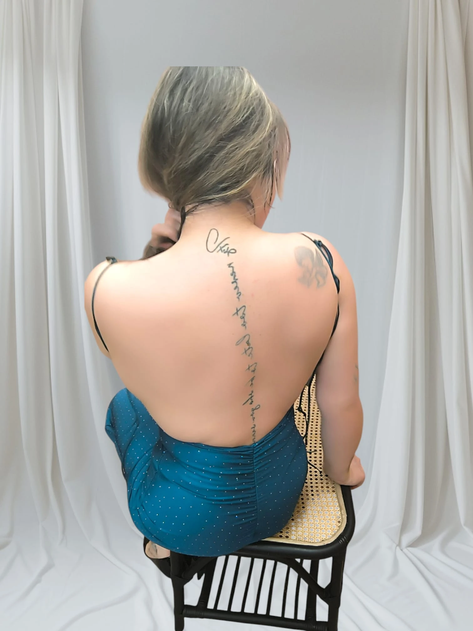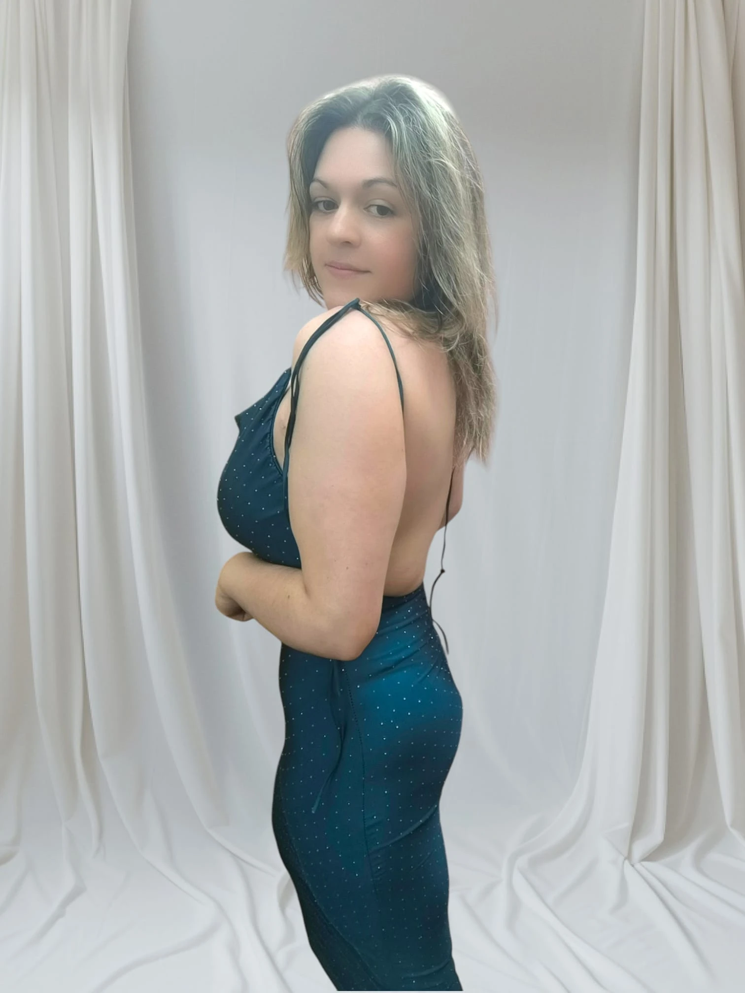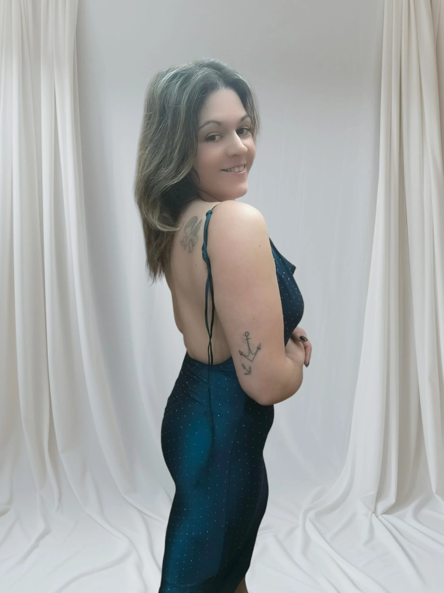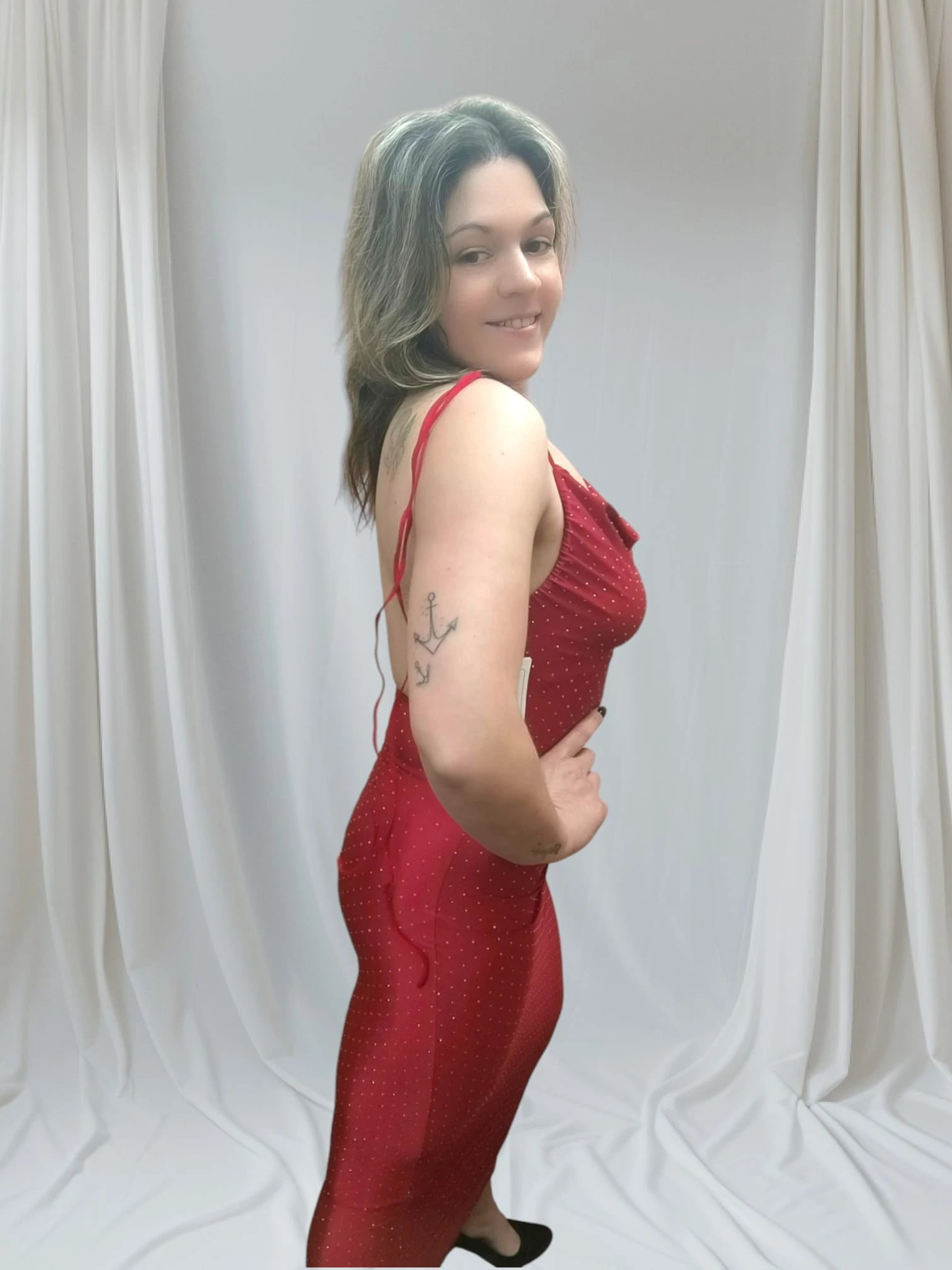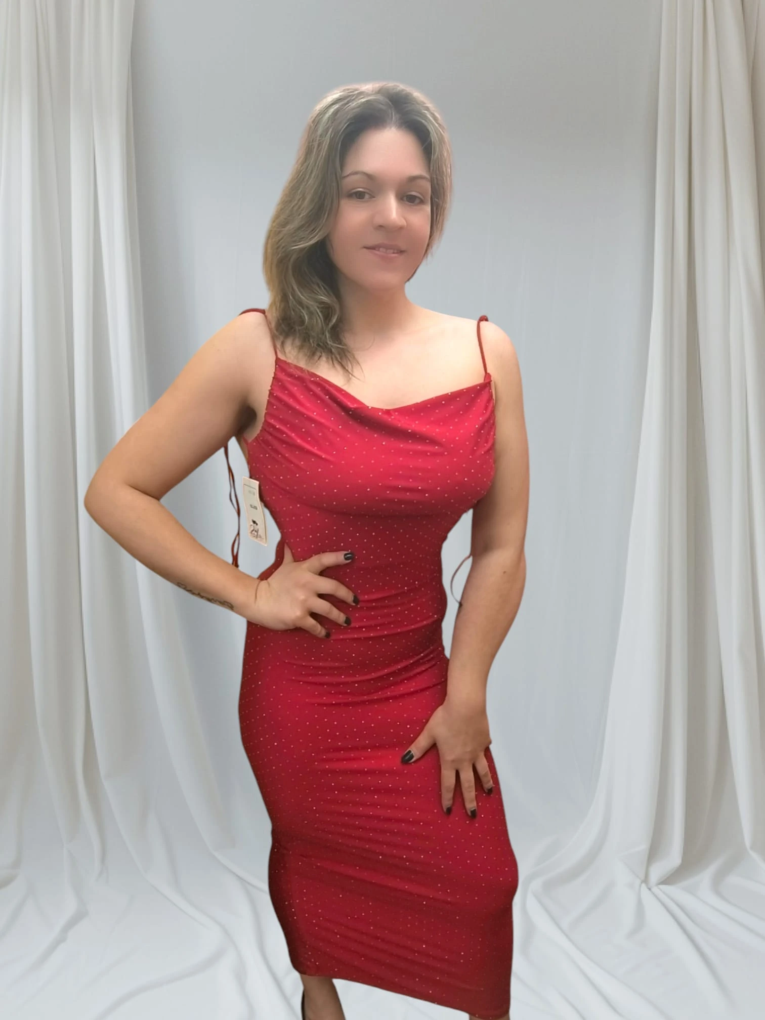 O grande destaque deste vestido está nas costas. Totalmente abertas, com amarrações delicadas, as costas tornam-se o ponto focal da peça, garantindo um ajuste perfeito e realçando a feminilidade. O tecido flexível assegura liberdade de movimento, permitindo-te dançar a noite toda em total conforto, seja em festas ou jantares românticos.