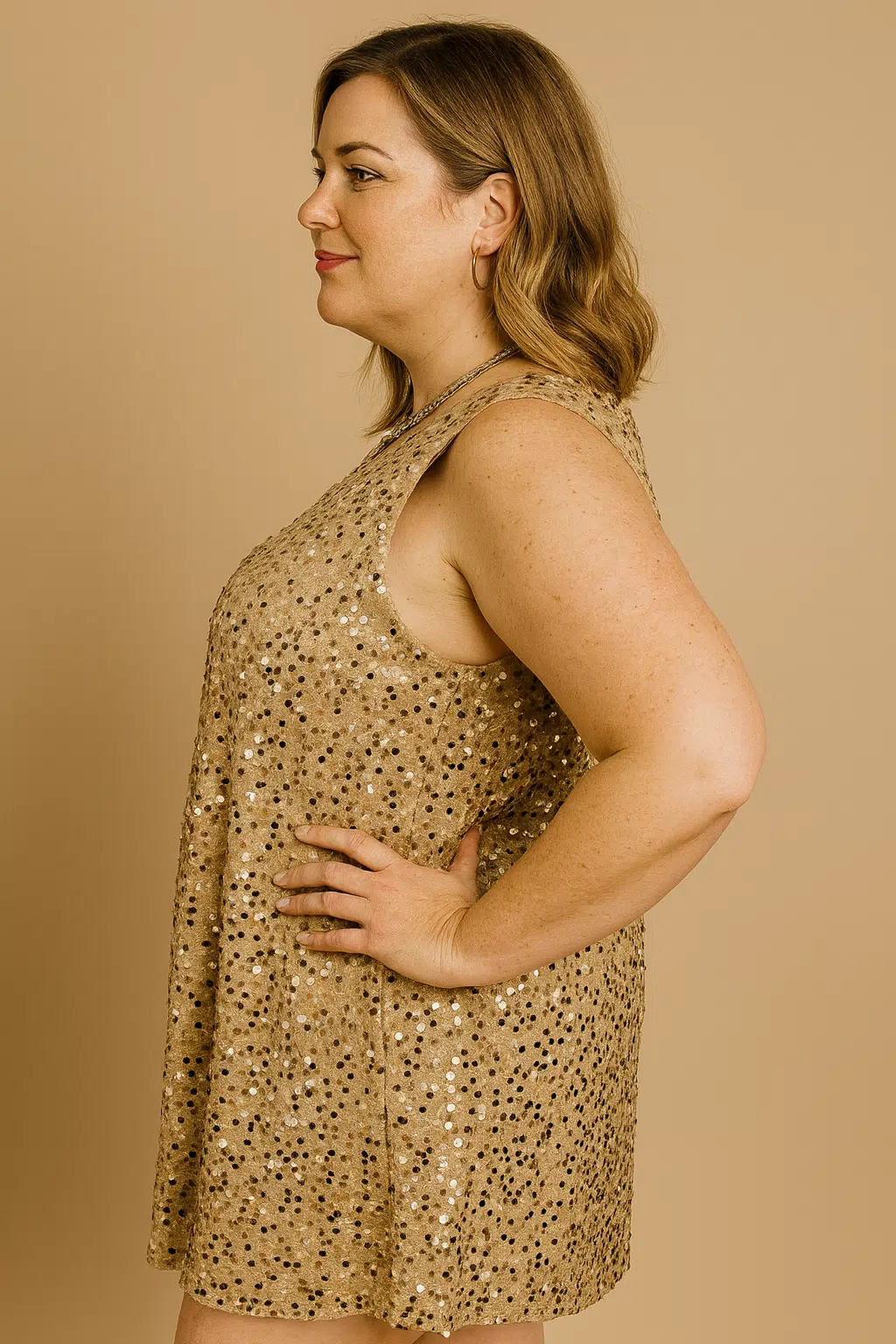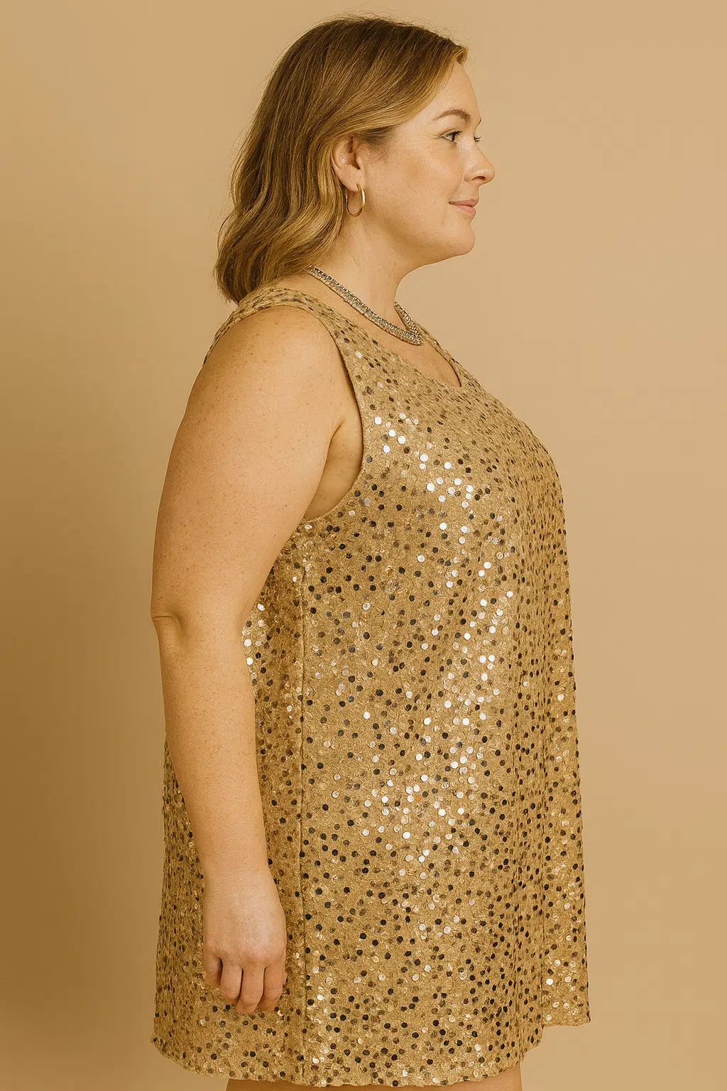 Visualmente, o vestido destaca-se pelo seu desenho simples e elegante. Não tem mangas, inclui um decote arredondado e apresenta uma queda reta que alonga a silhueta. Para completar, o brilho uniforme das lantejoulas percorre toda a peça, criando um efeito luminoso e sofisticado, enquanto a tonalidade dourada ilumina a pele e transmite uma energia festiva.