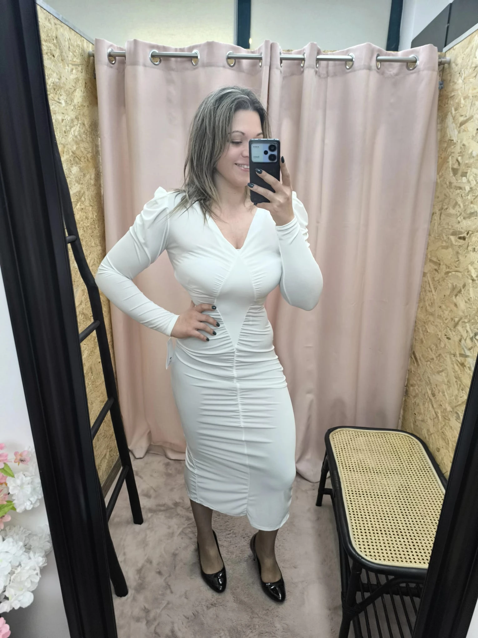 Se deseja um look sofisticado e moderno, o Vestido Elegância Perfeita é, sem dúvida, a peça que faltava no seu guarda-roupa. Com um corte midi justo ao corpo, este vestido destaca a feminilidade de forma elegante, oferecendo um caimento impecável. As mangas longas, adornadas com ombreiras delicadas, conferem um toque de refinamento, enquanto o decote em V valoriza o colo com muita classe. Além disso, o design cuidadosamente pensado faz deste modelo uma escolha versátil e atemporal.