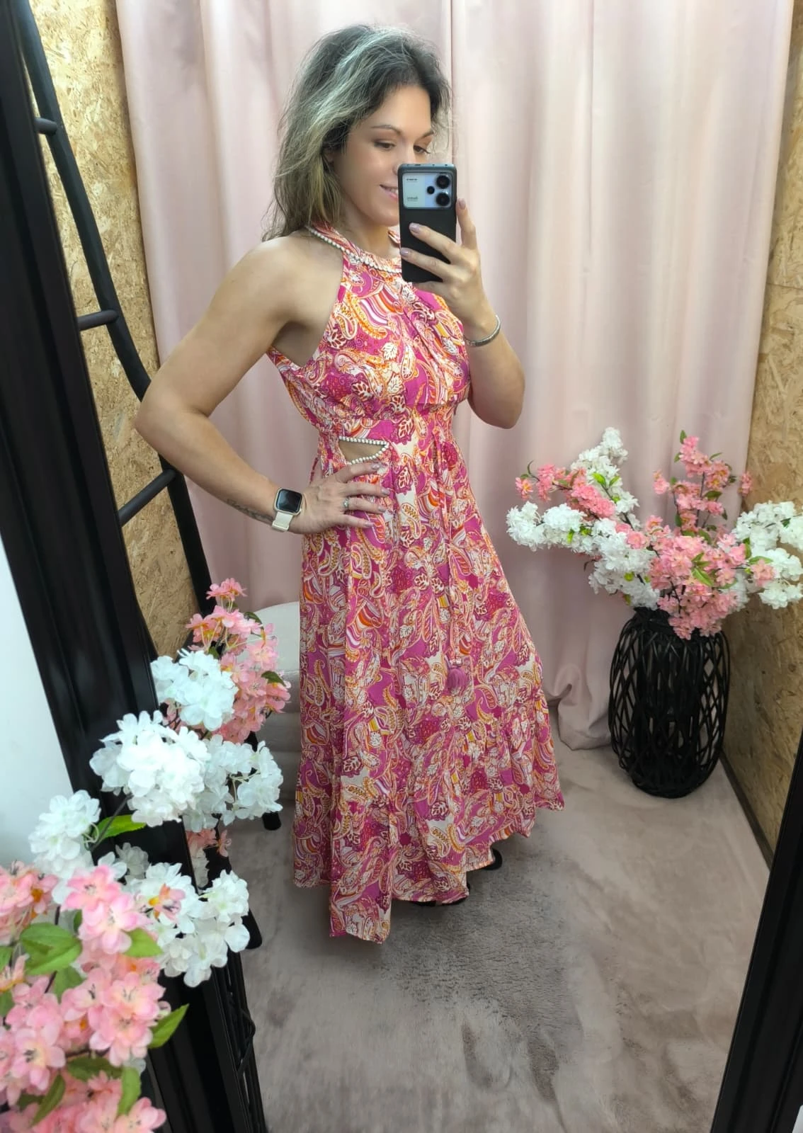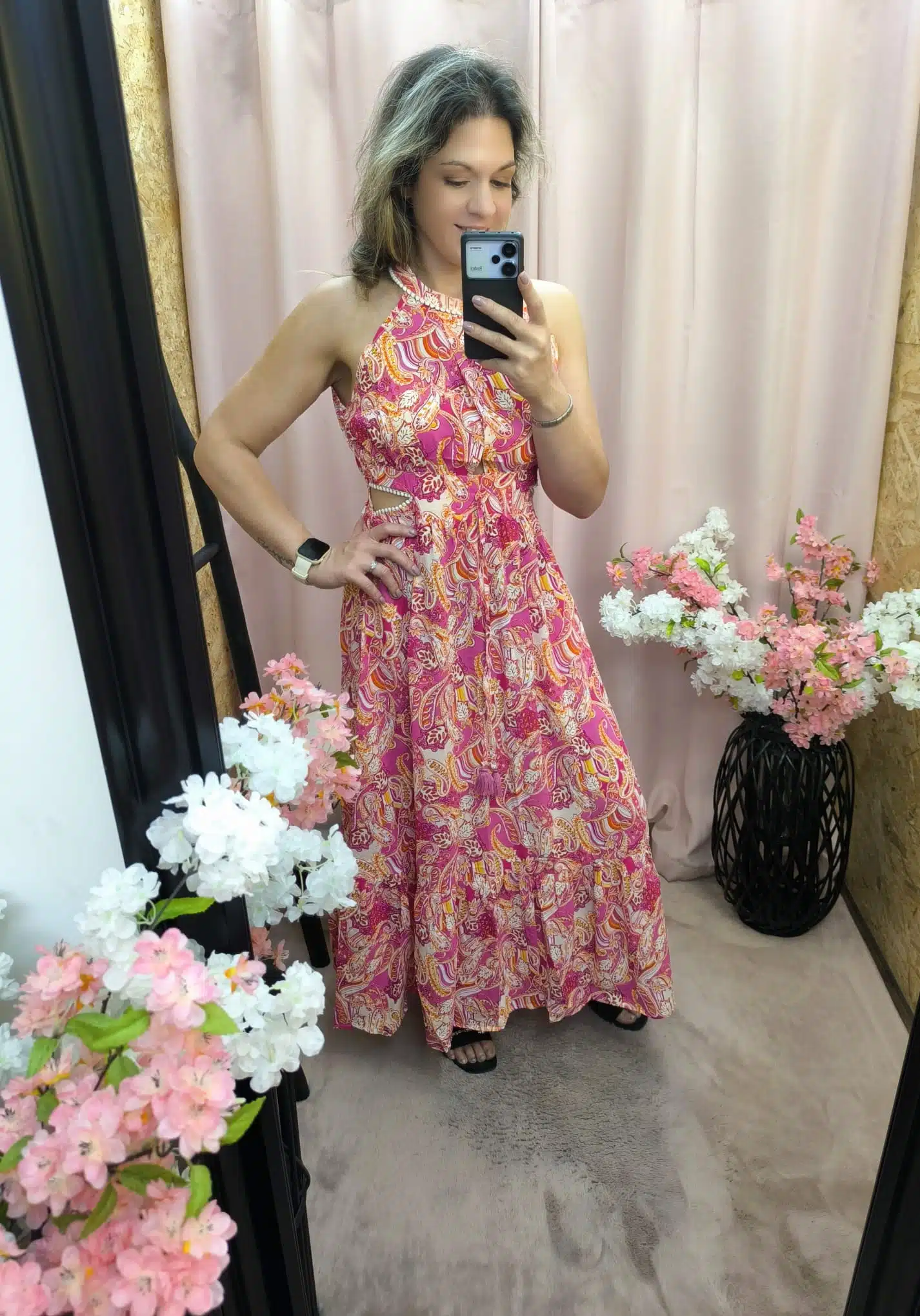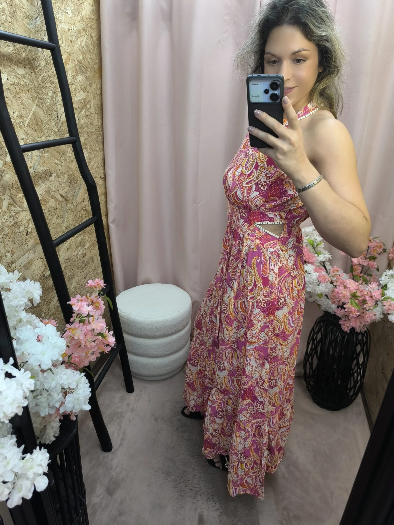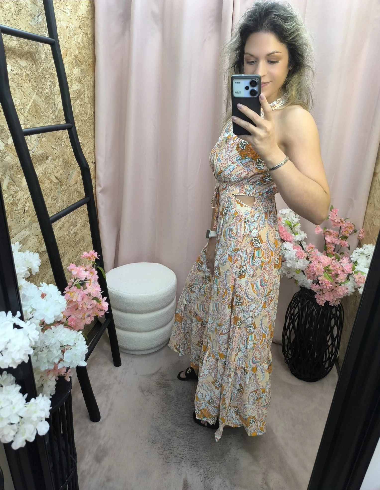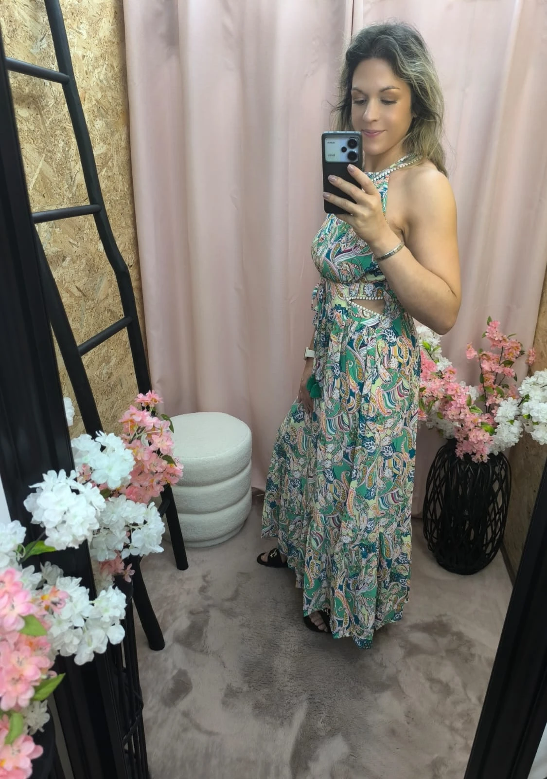 O vestido longo estilo boho é a escolha perfeita para quem procura leveza, estilo e um toque romântico em cada detalhe. Com um design fluido e moderno, este vestido apresenta uma abertura subtil no peito, que valoriza o decote de forma elegante. Além disso, o fecho é feito no pescoço através de um botão delicado, conferindo praticidade e charme. Outro ponto que se destaca são as aberturas laterais na zona da barriga, que acrescentam ousadia sem perder a sofisticação.