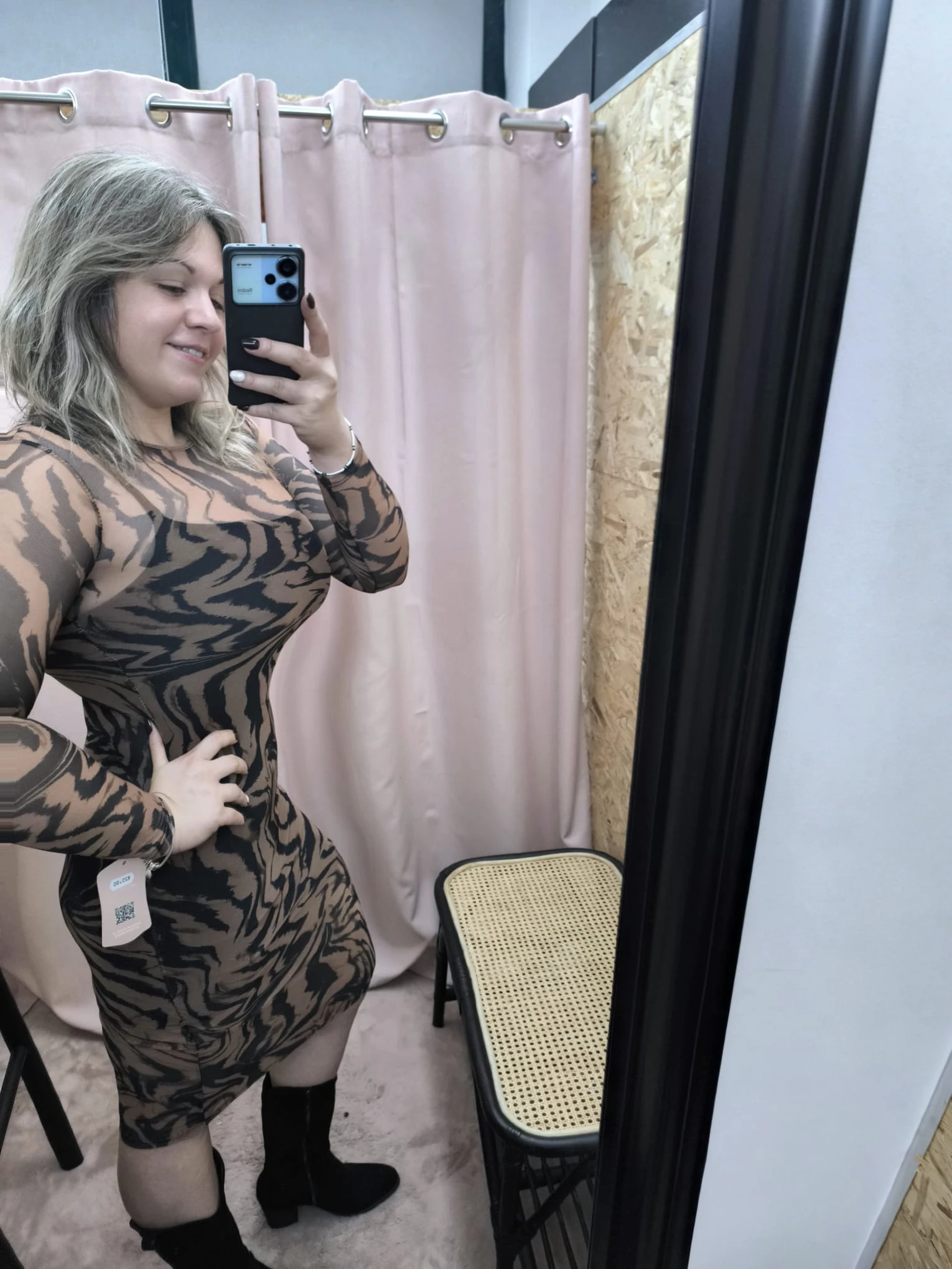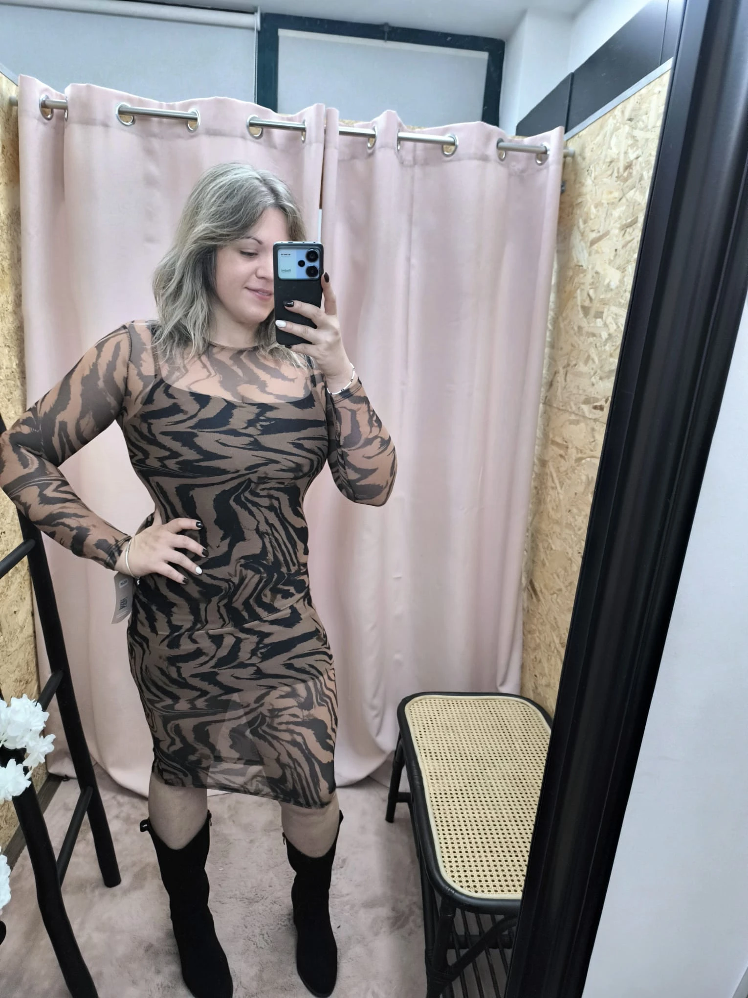 Este vestido apresenta mangas longas e um comprimento curto, ideal para quem procura equilibrar sofisticação e atrevimento. Por isso, o design ajustado ao corpo realça a silhueta de forma natural, enquanto os padrões discretos nas versões castanha e preta acrescentam textura e originalidade ao visual.