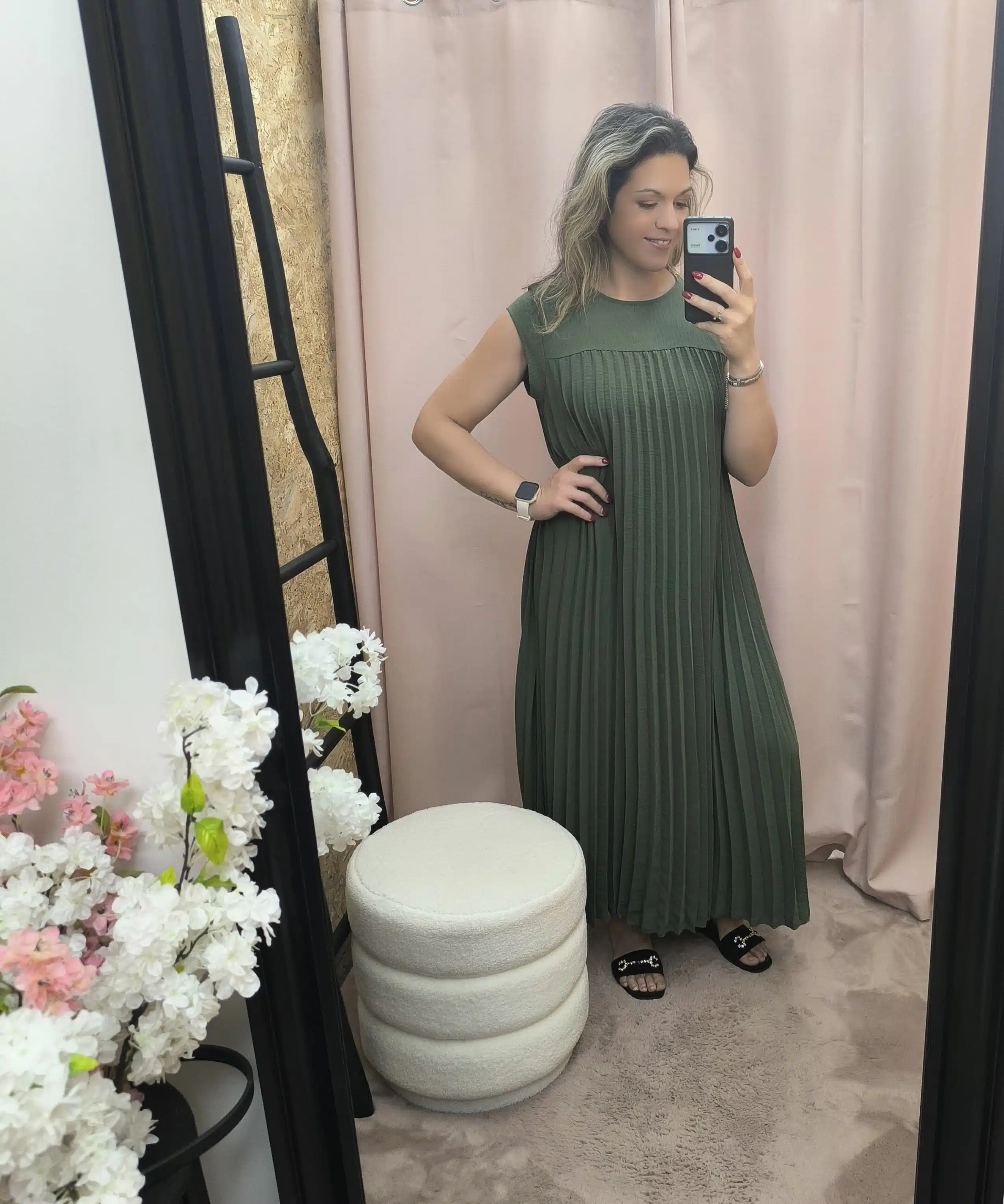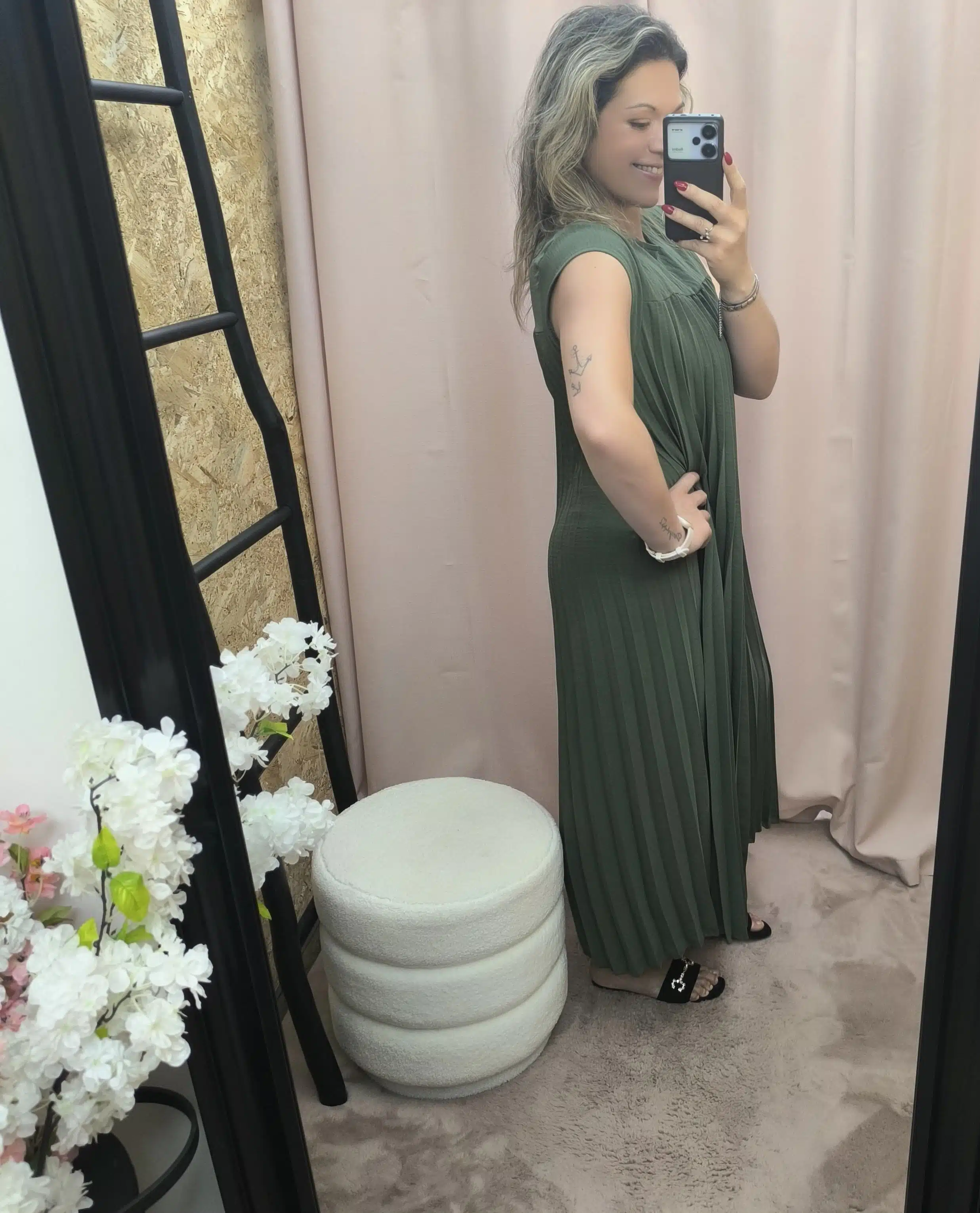 Descobre o Vestido Plissado Elegância Solta — fluido, confortável e versátil. Disponível em verde, bege e vermelho, veste até XL. Um essencial de elegância descontraída.