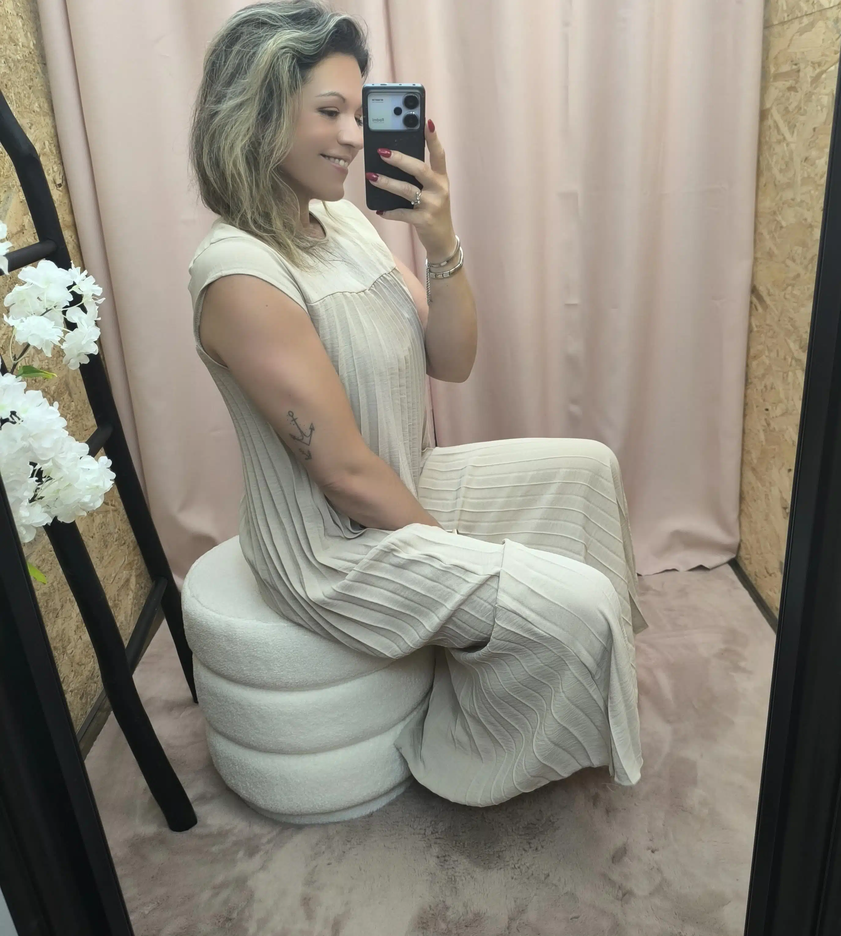 Além disso, o detalhe plissado ao longo de toda a peça adiciona textura e dimensão, criando um efeito fluído que acompanha os movimentos com graciosidade. O tecido leve e respirável é, portanto, perfeito para dias mais quentes ou para combinar com camadas em estações mais frescas.