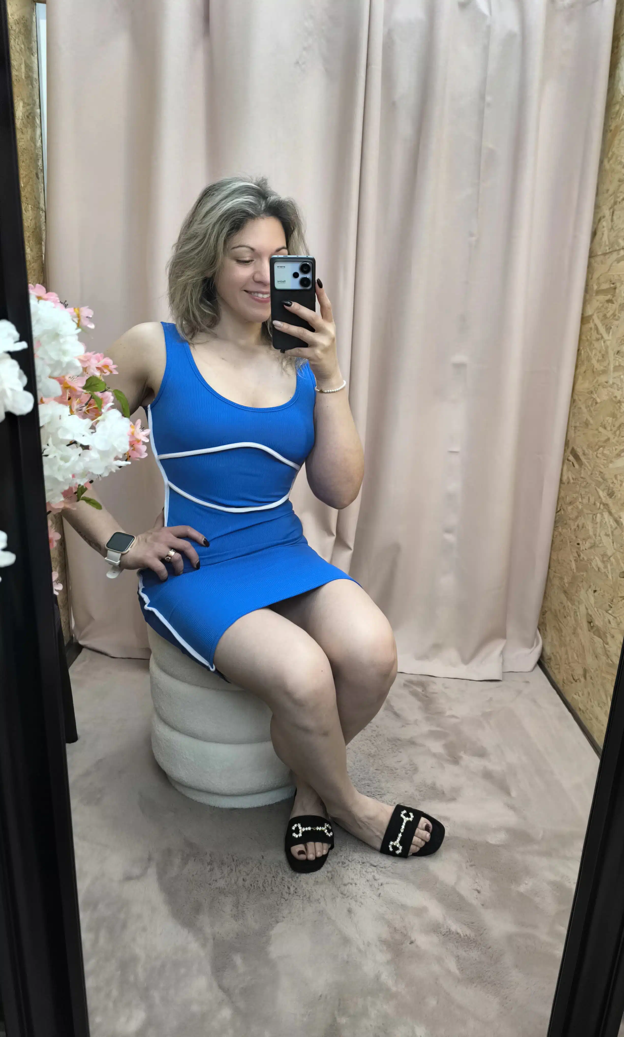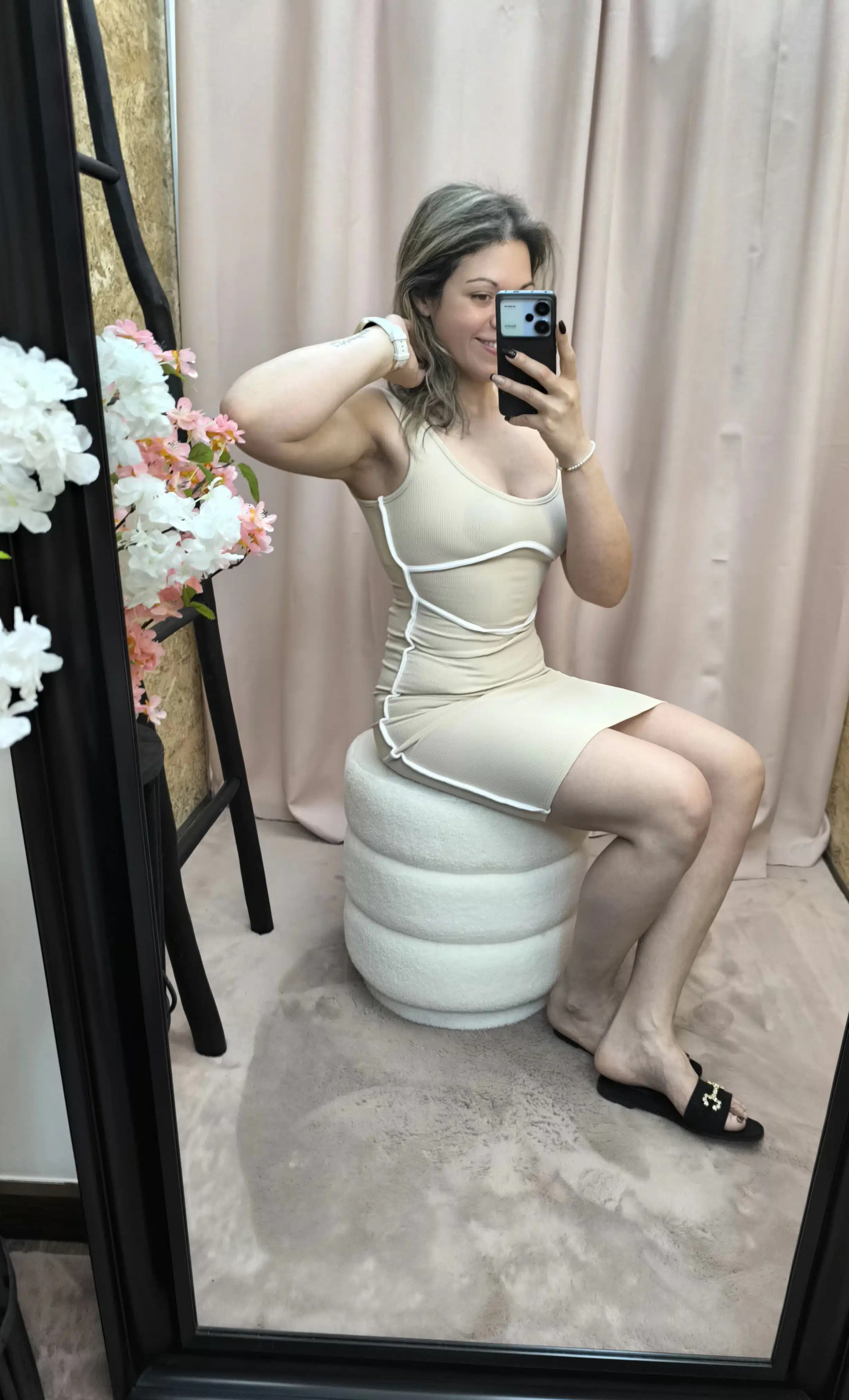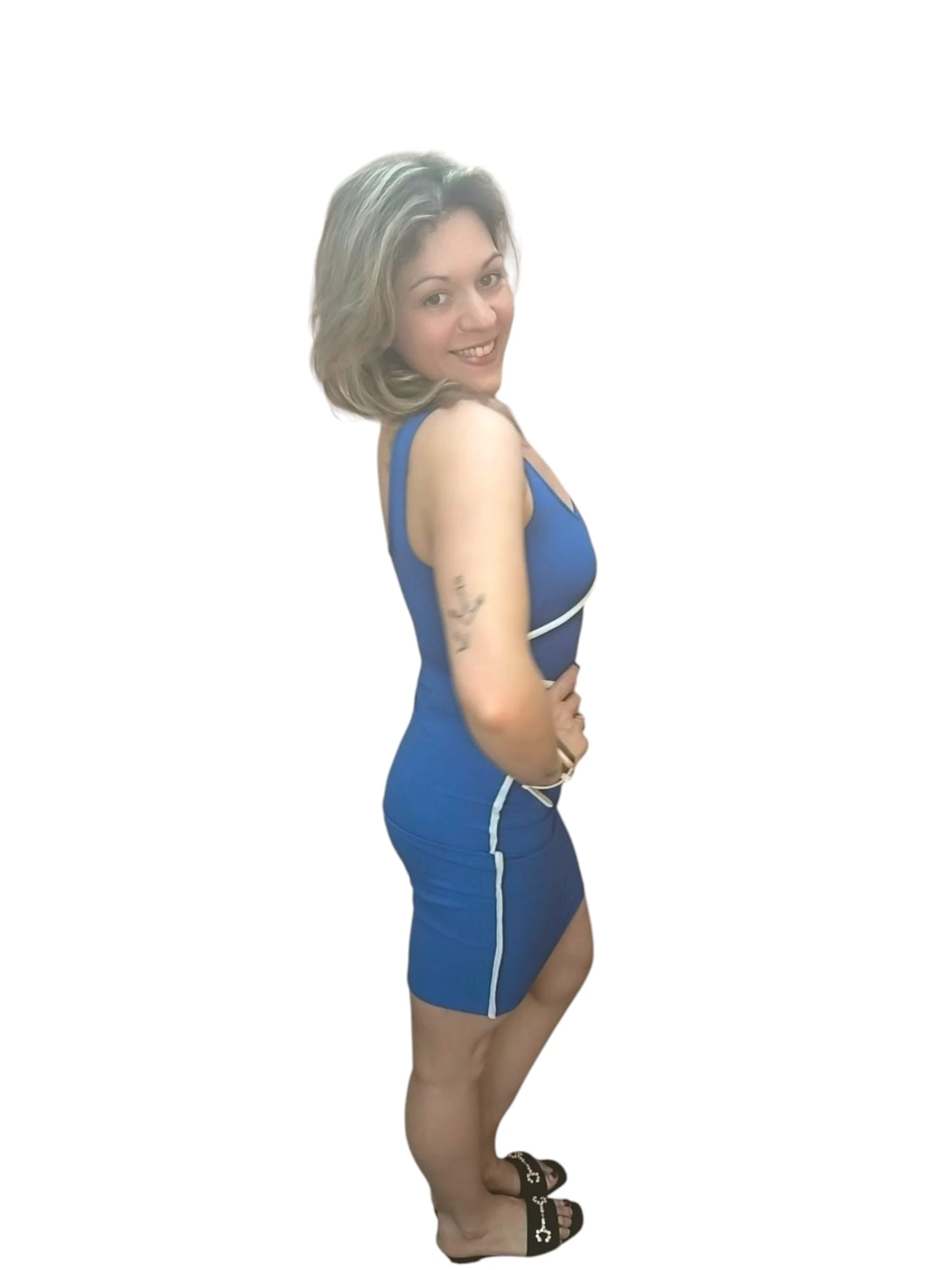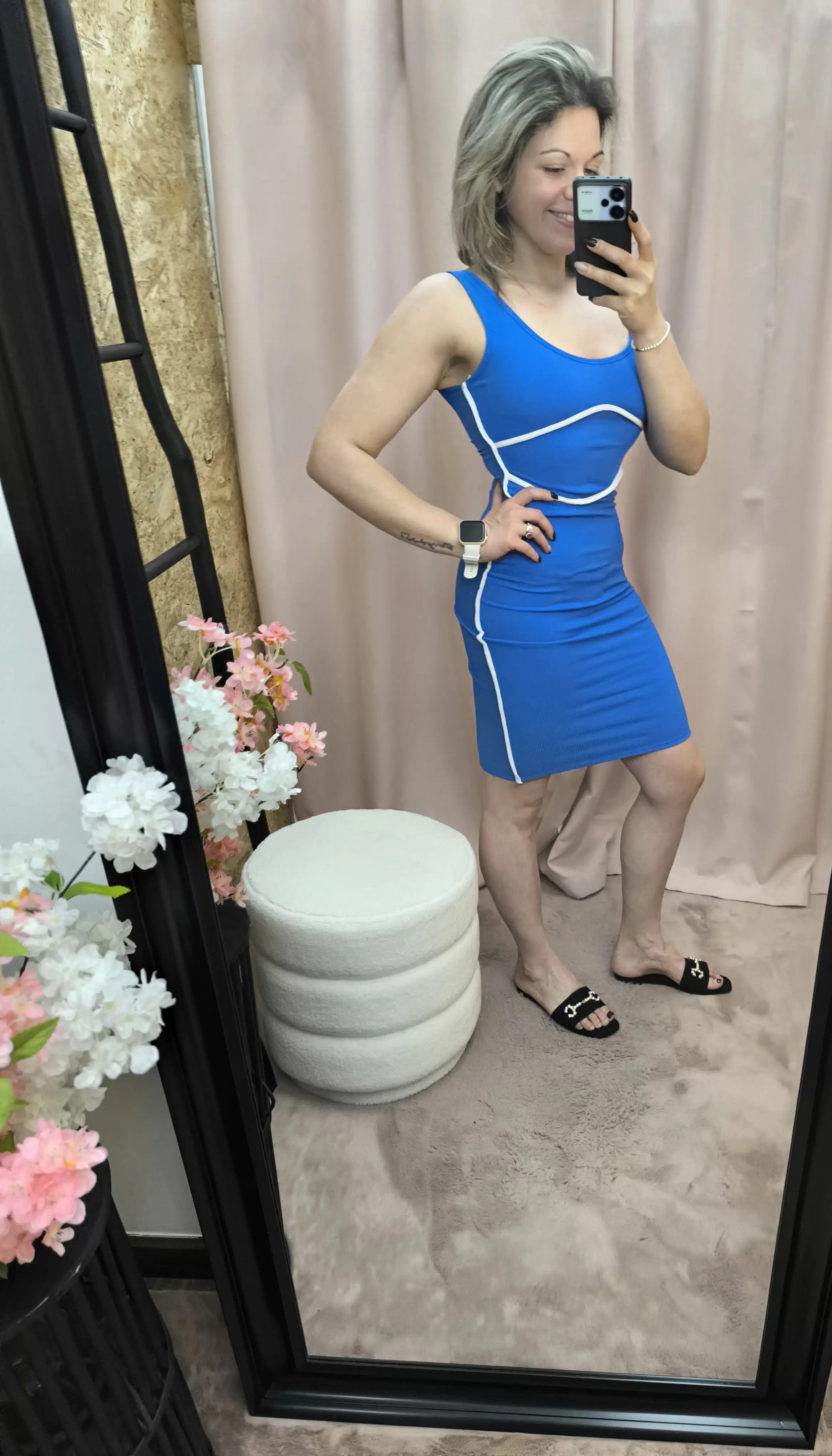 O grande destaque está nos pormenores em branco, que contornam estrategicamente a silhueta: desde o busto até à lateral do corpo, esses detalhes criam uma ilusão de corpo mais definido e proporcionado, tornando o vestido ainda mais atraente.