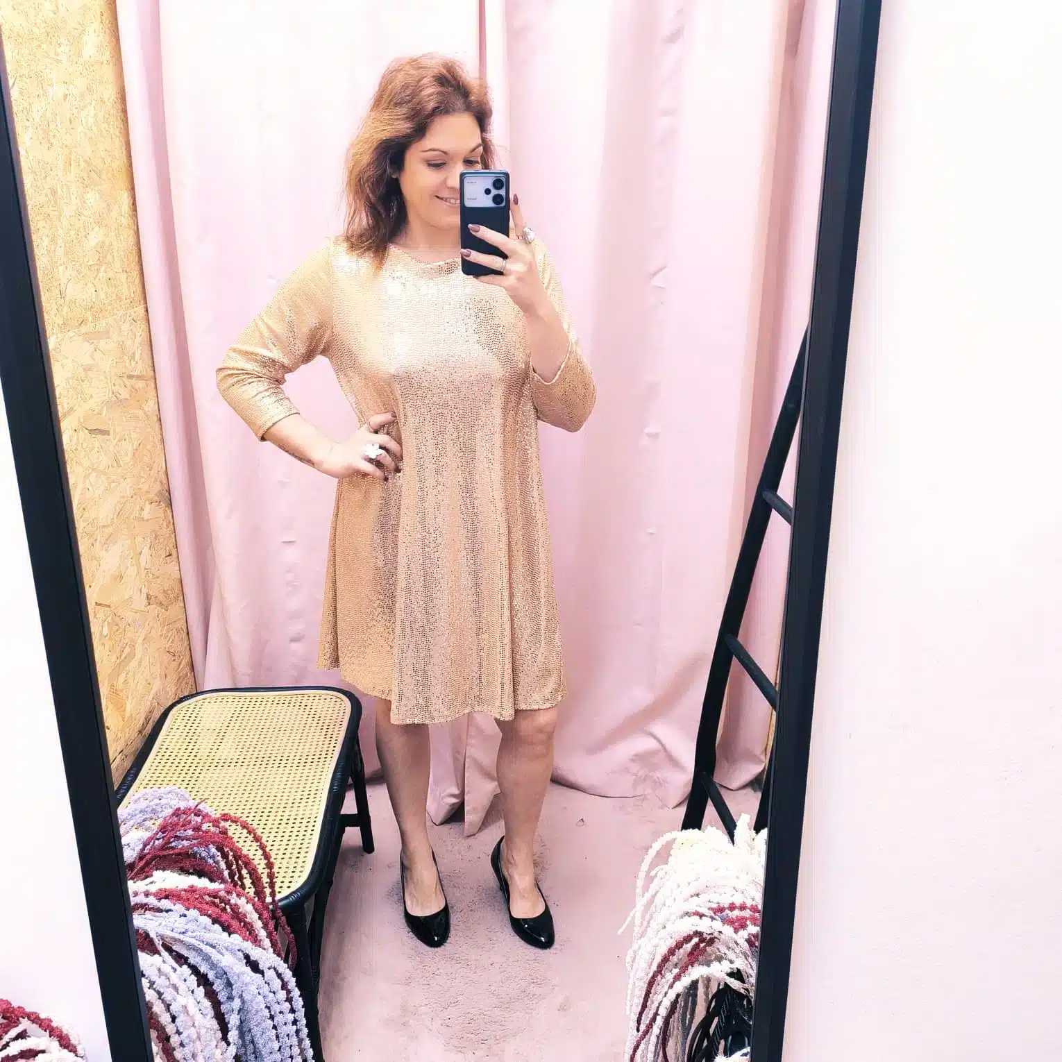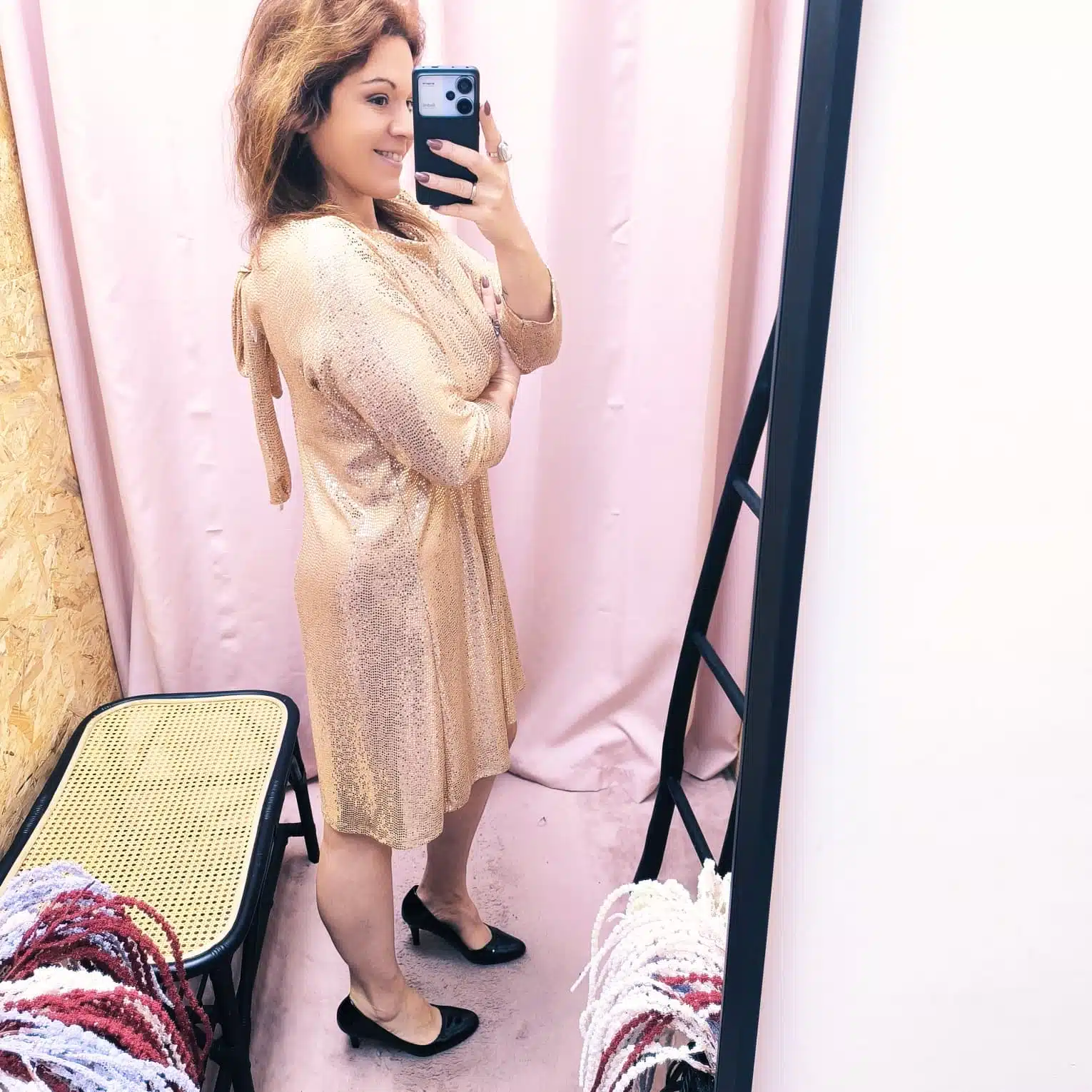 Por outro lado, a escolha do dourado traz uma aura de sofisticação e poder, ideal para mulheres confiantes que gostam de se destacar. Para um look ainda mais marcante, combine o vestido com acessórios dourados ou prateados e um salto elegante.
