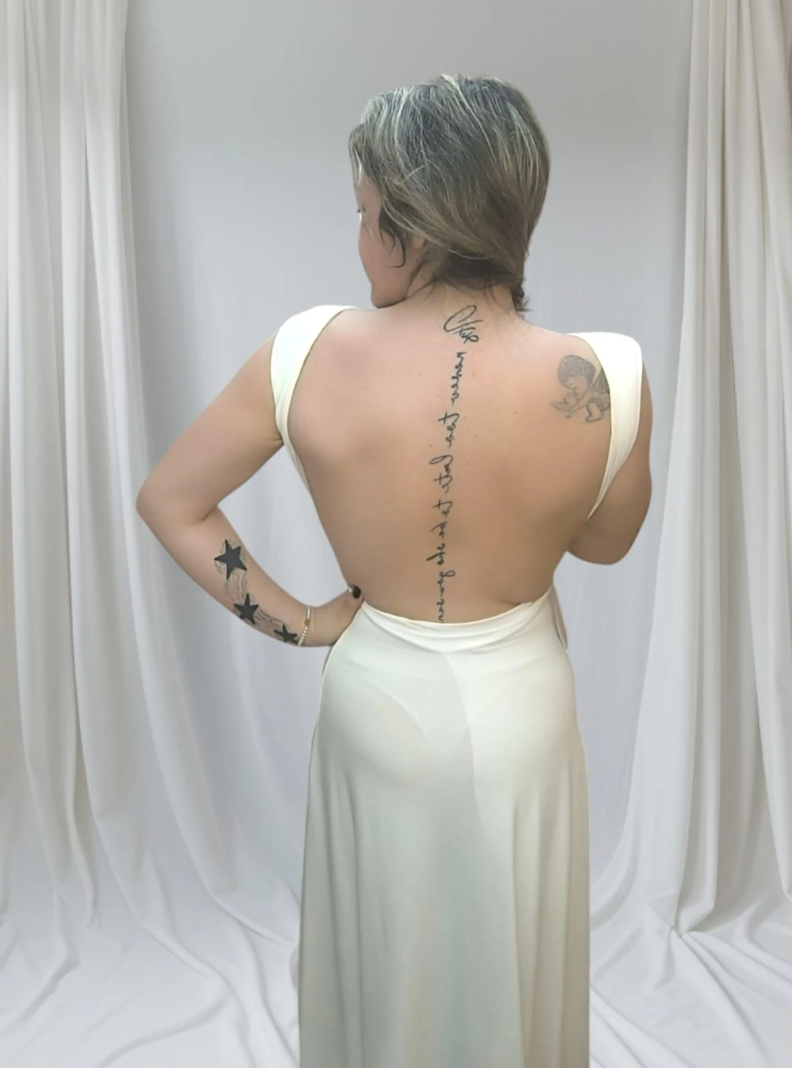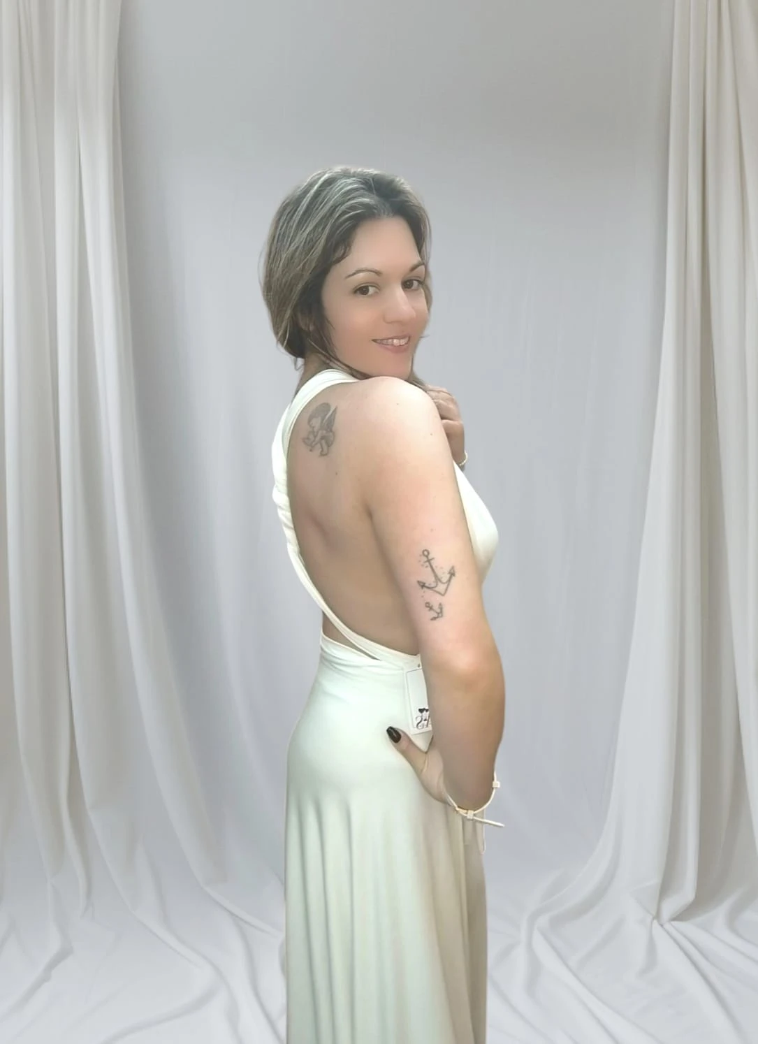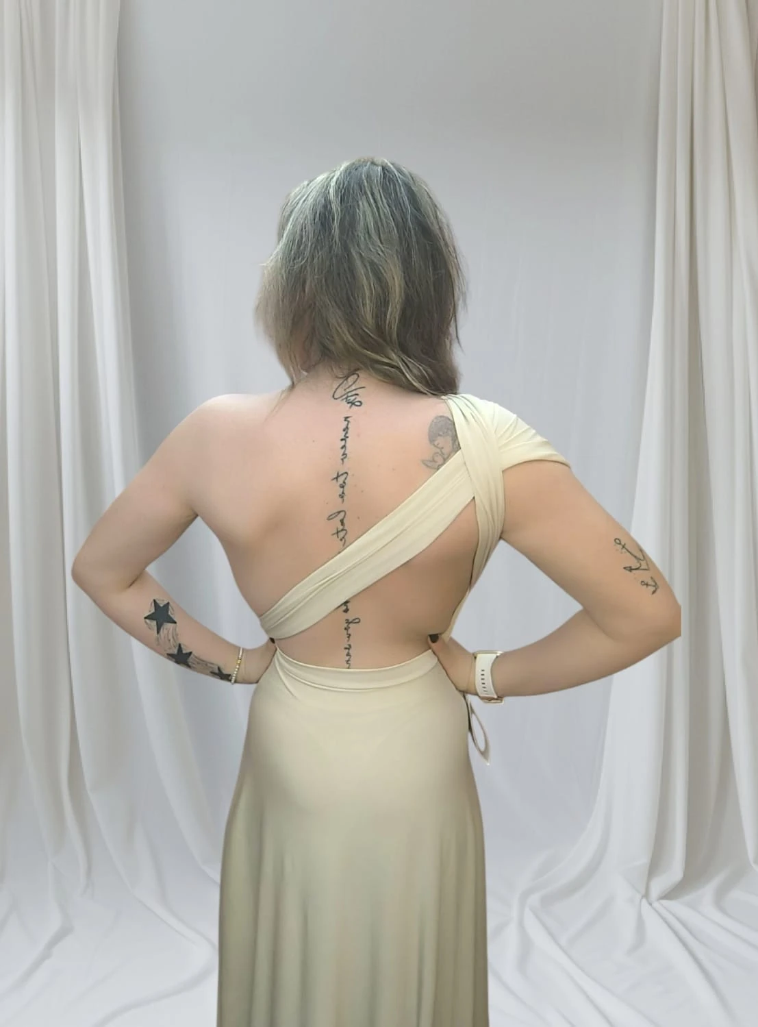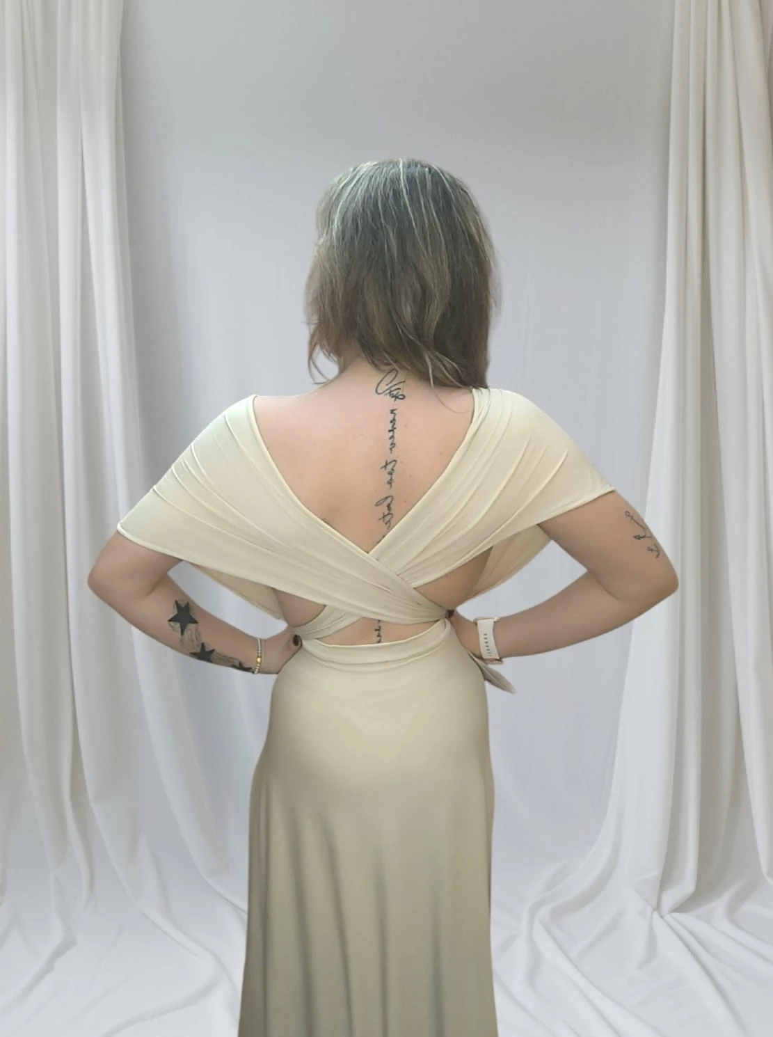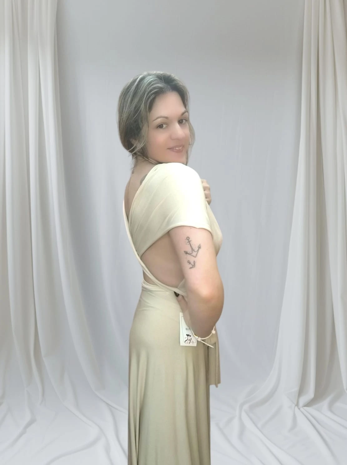 Disponível em duas cores neutras – bege e branco – o vestido permite uma variedade de combinações e estilos. A sua principal característica é a parte superior ajustável, que pode ser usada de múltiplas formas: com decote cruzado, ombros caídos, costas abertas ou frente envolvente. Assim, cada mulher pode reinventá-lo conforme o seu gosto pessoal, nível de conforto e confiança. É uma peça que respeita a diversidade de estilos femininos e, por isso, torna-se um verdadeiro camaleão no armário.