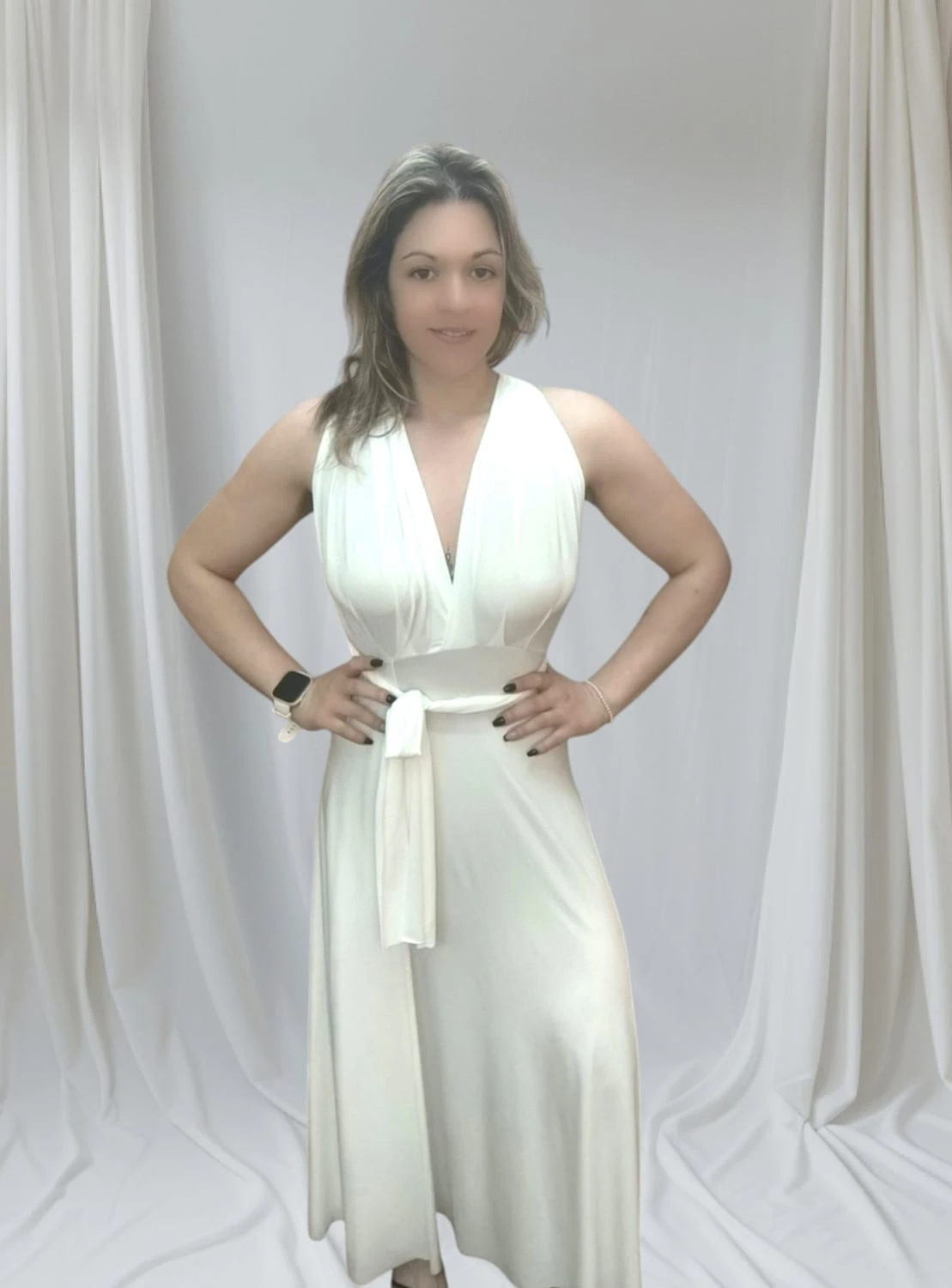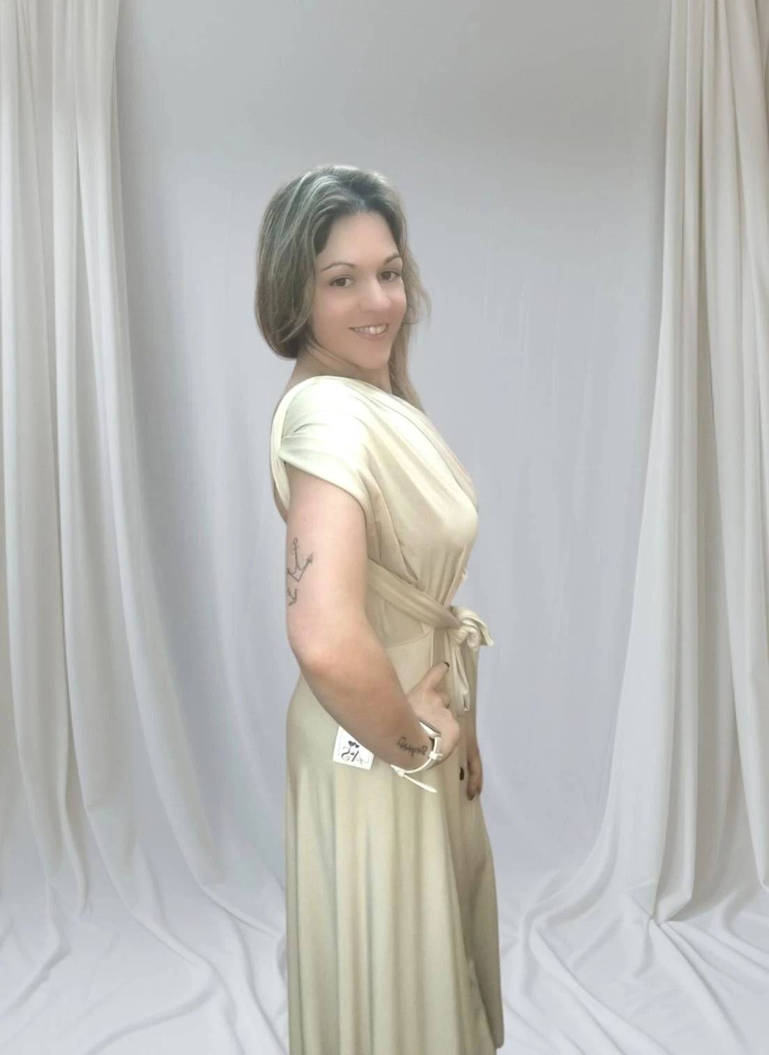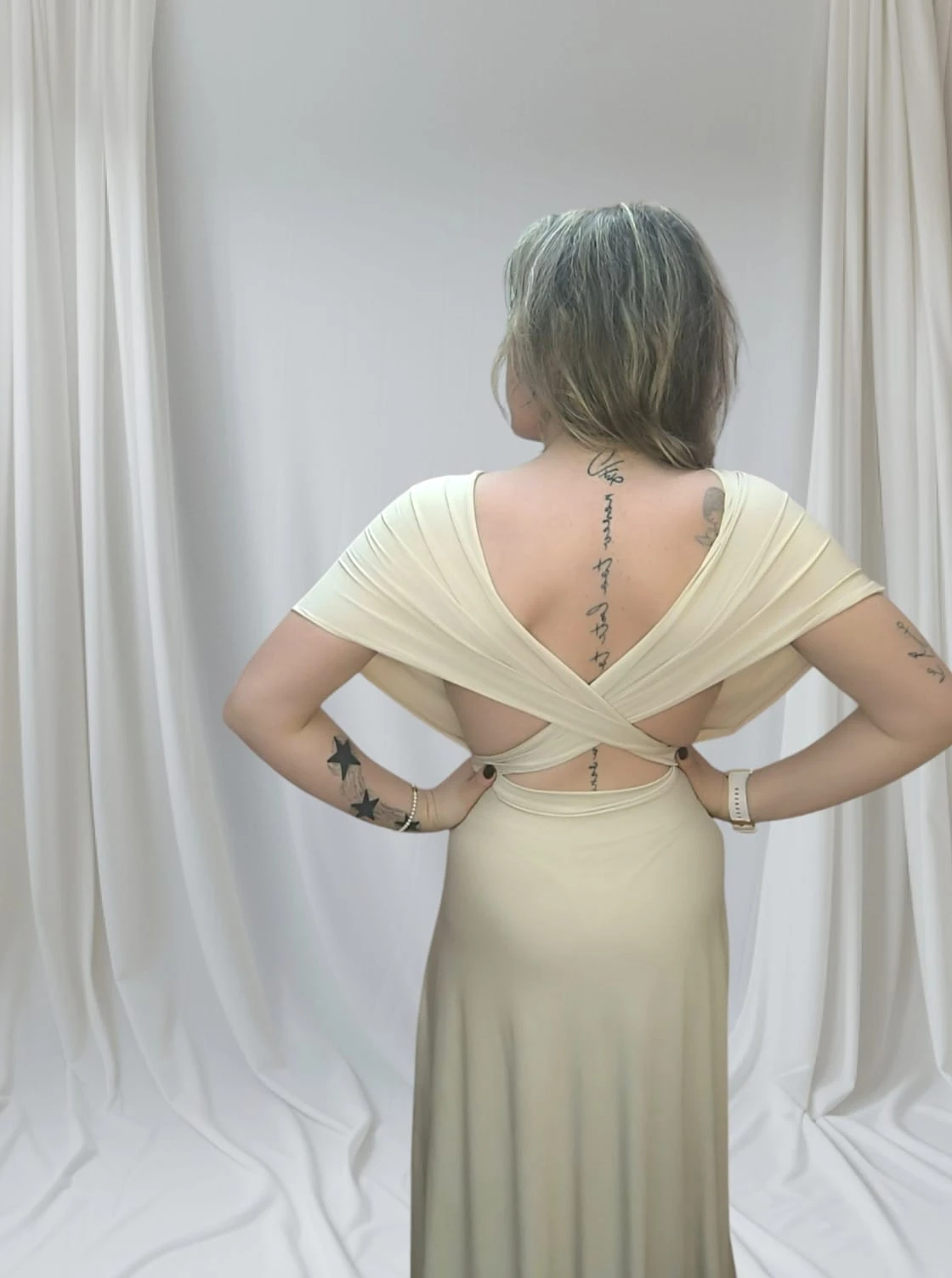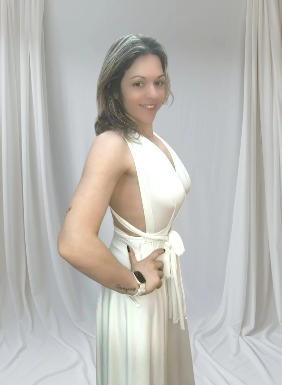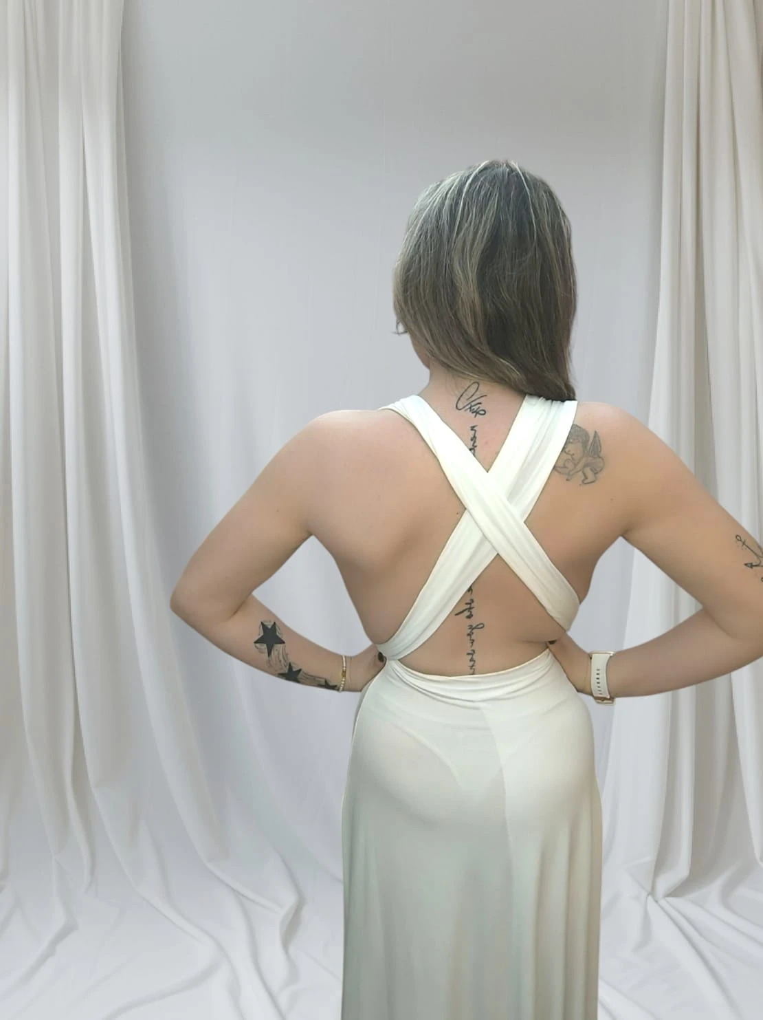 O Vestido Versátil Elegante é a escolha ideal para mulheres que procuram conforto, estilo e liberdade para criar diferentes looks com uma só peça. Disponível em bege e branco, veste do tamanho único até L/XL.